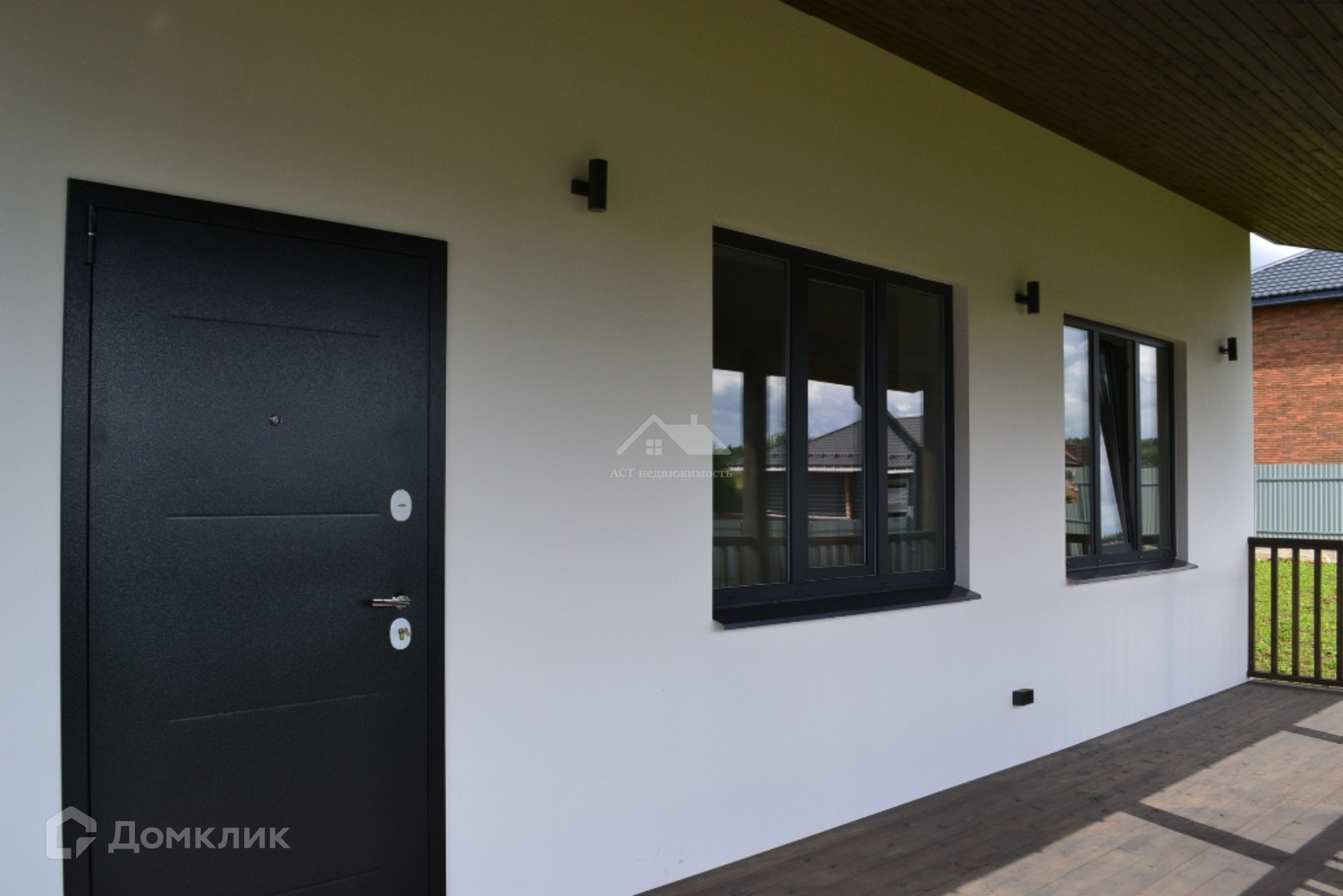 Снаружи стены оштукатурены и покрашены, установлены энергосберегающие стеклопакеты. Кровля - металлочерепица с установленными водостоками и снегозадержателями.