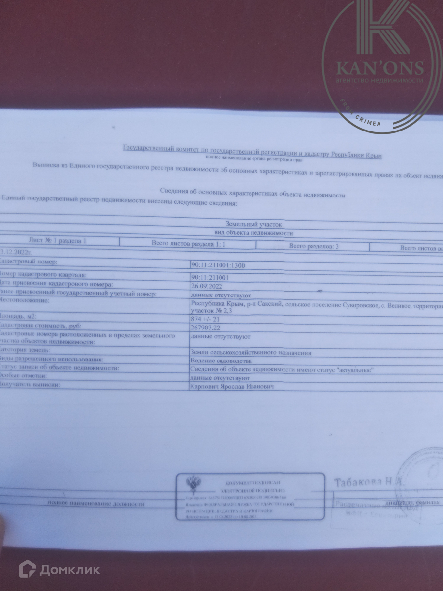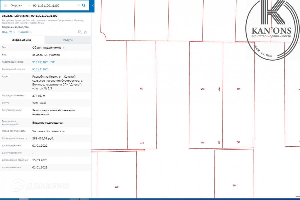 Продаётся земельный участок в р-не Сакский, сельское поселение Суворовское, с. Великое, территория СПК "Днепр", участок № 2,3, площадью 8,74 сот. Свет, вода по границе. Участок на въезде в кооператив, первая линия.