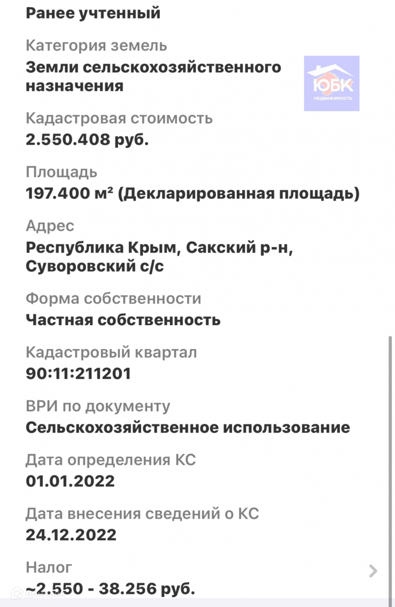 Продаётся земельный участок, Западный Крым, земля в собственности, 20 гектар одним массивом, сельхоз назначения, виды разрешённых использования код 1.1- 1.18,разрешено строительство дома и вспомогательных сооружений, до границ пос. Великое в 1000 метрах. Евпатория в 10 км, есть все документы РФ, свидетельство право собственности, кадастровый паспорт, межевание. До черного моря 15 км. Участок с ровным рельефом, пригоден для посадки сада и ведения фермерского хозяйства. Подъездные пути- грунтовая дорога. Линия электропередач- 1км. Вода- нужно бить скважину глубиной -50-60м.отличное просматриваемое место. Кадастровый номер 90:11:211201:105 цена за 20 га, земля не в залоге, не в аренде,