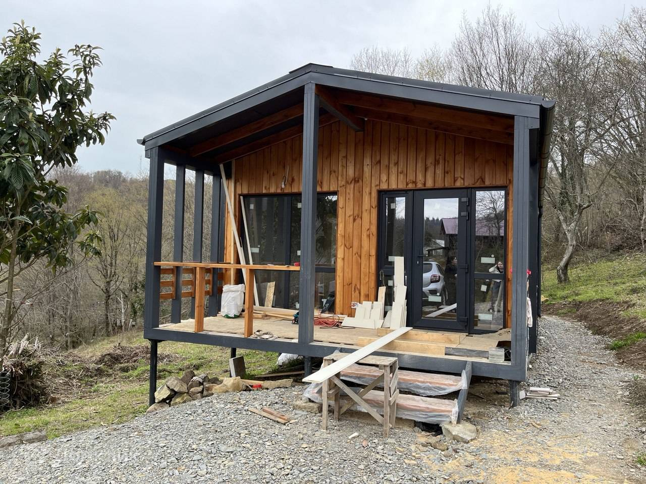 Дом выполнен по каркасной технологии, фундамет - сваи. Планировка: одноуровневая, евродвушка с большой террасой.
