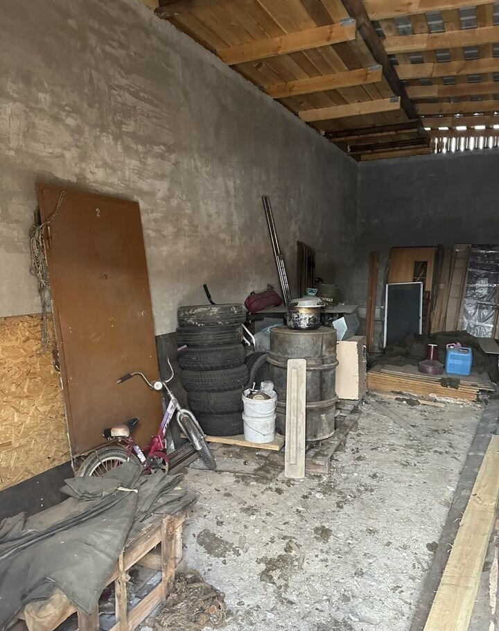 На пол лежат в гараже листы ОСП. Доска 50 мм 2 куб. м., резервный алюминиевый бак 2 куб. м. для воды.