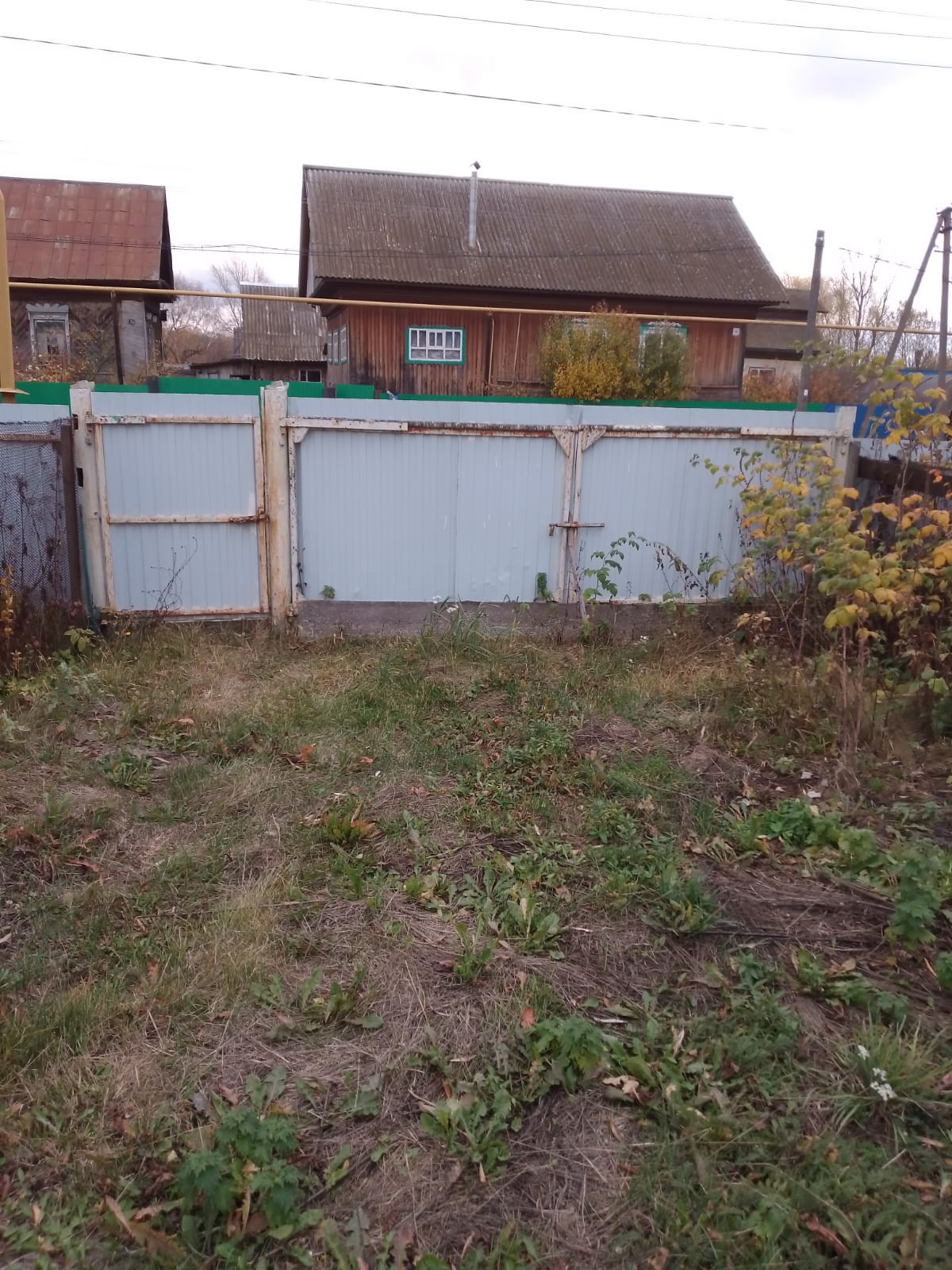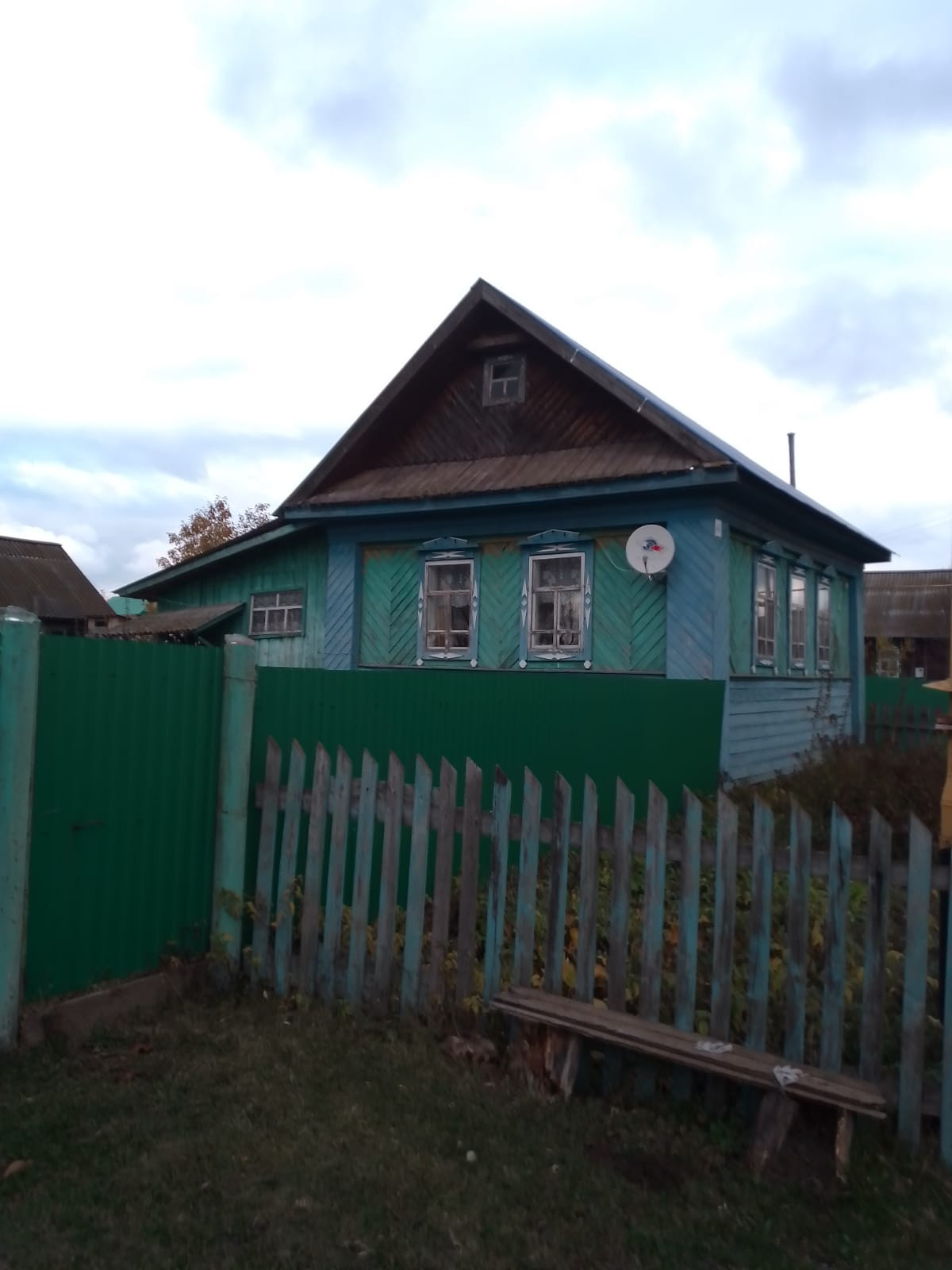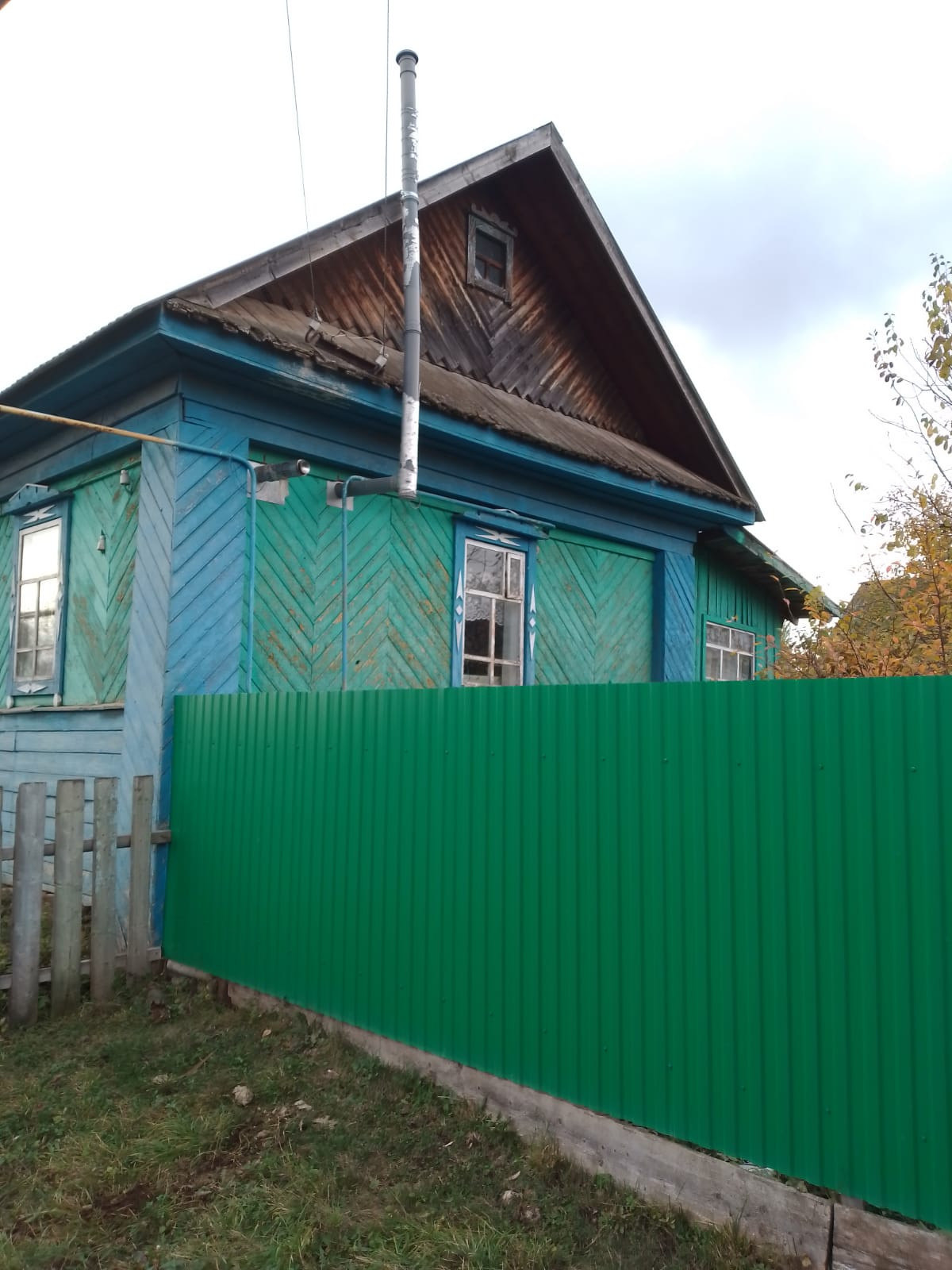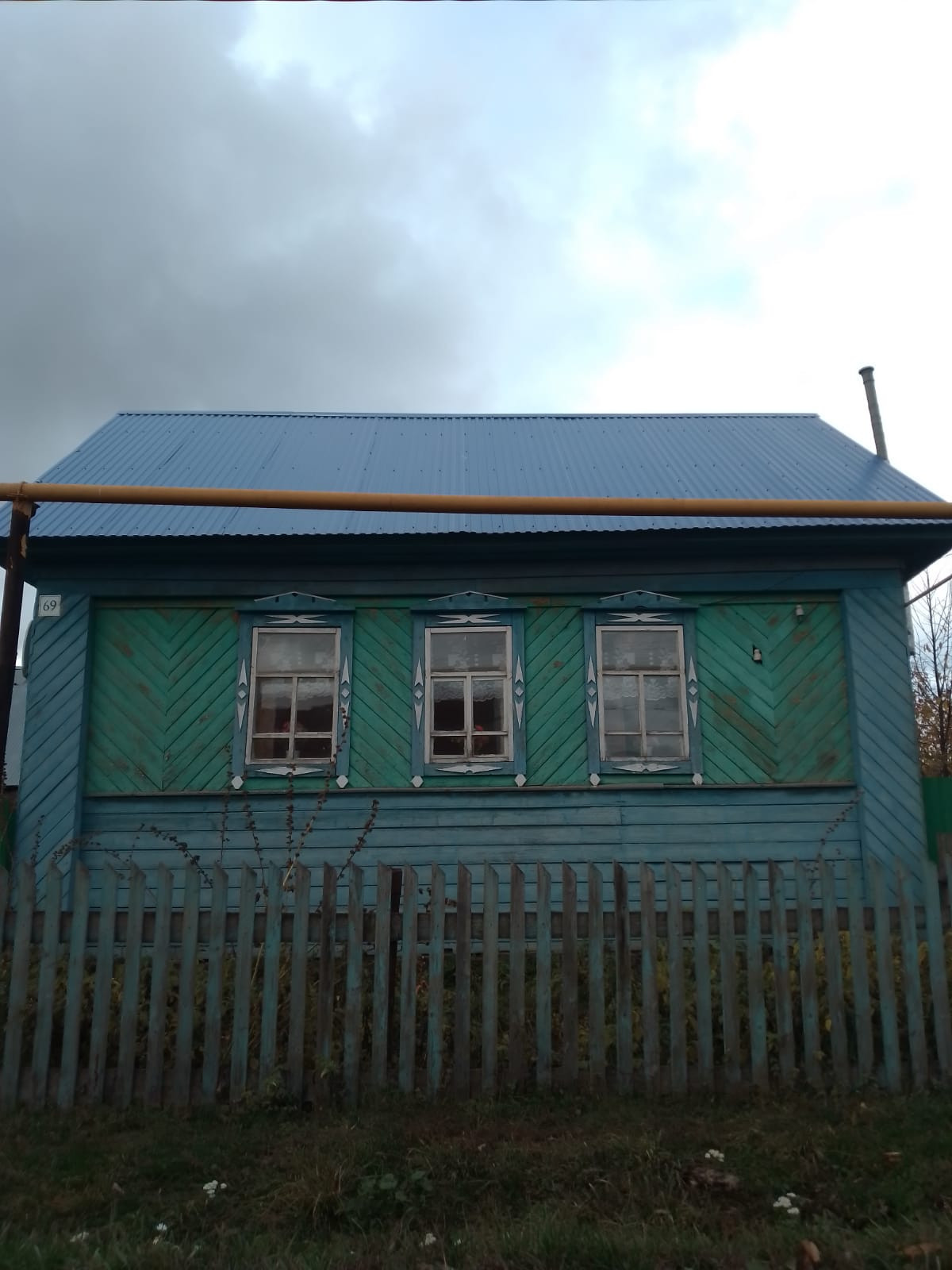 Дом обшит досками, кровля профнастил, забор и ворота из прфлиста, рама окон деревянные.