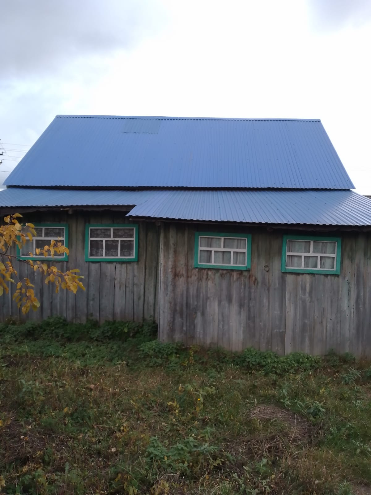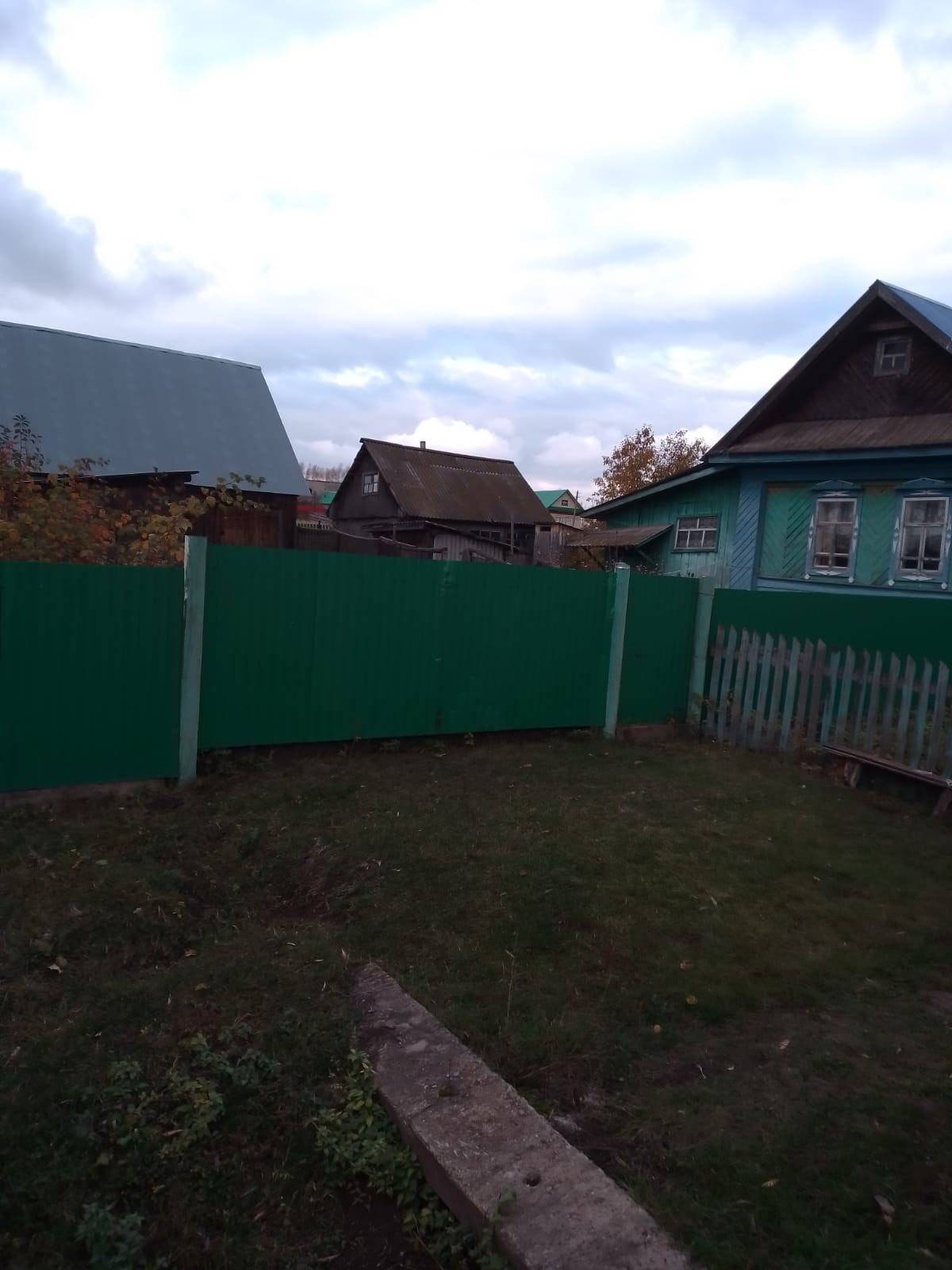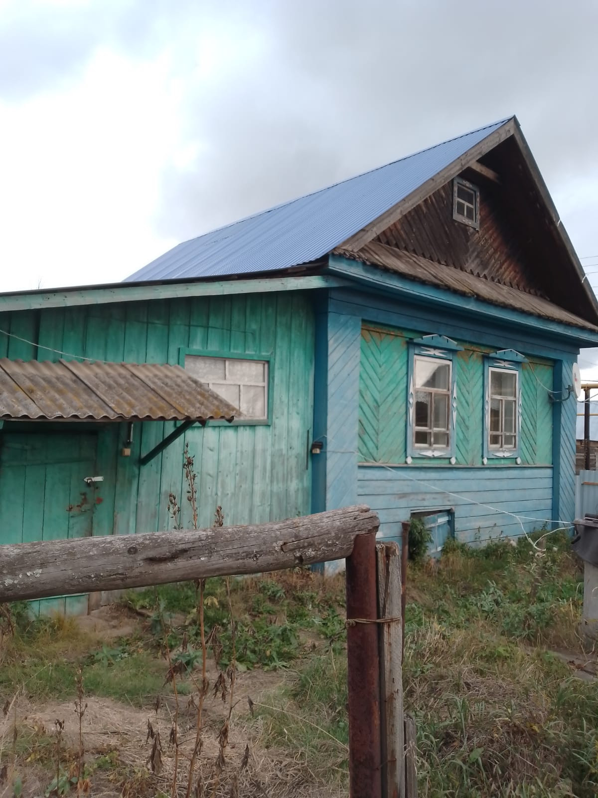 Дом обшит досками, кровля профнастил, забор и ворота из прфлиста, рама окон деревянные.