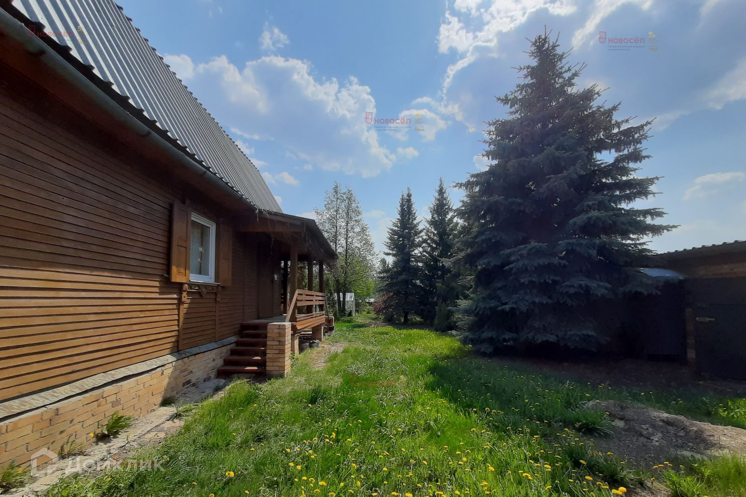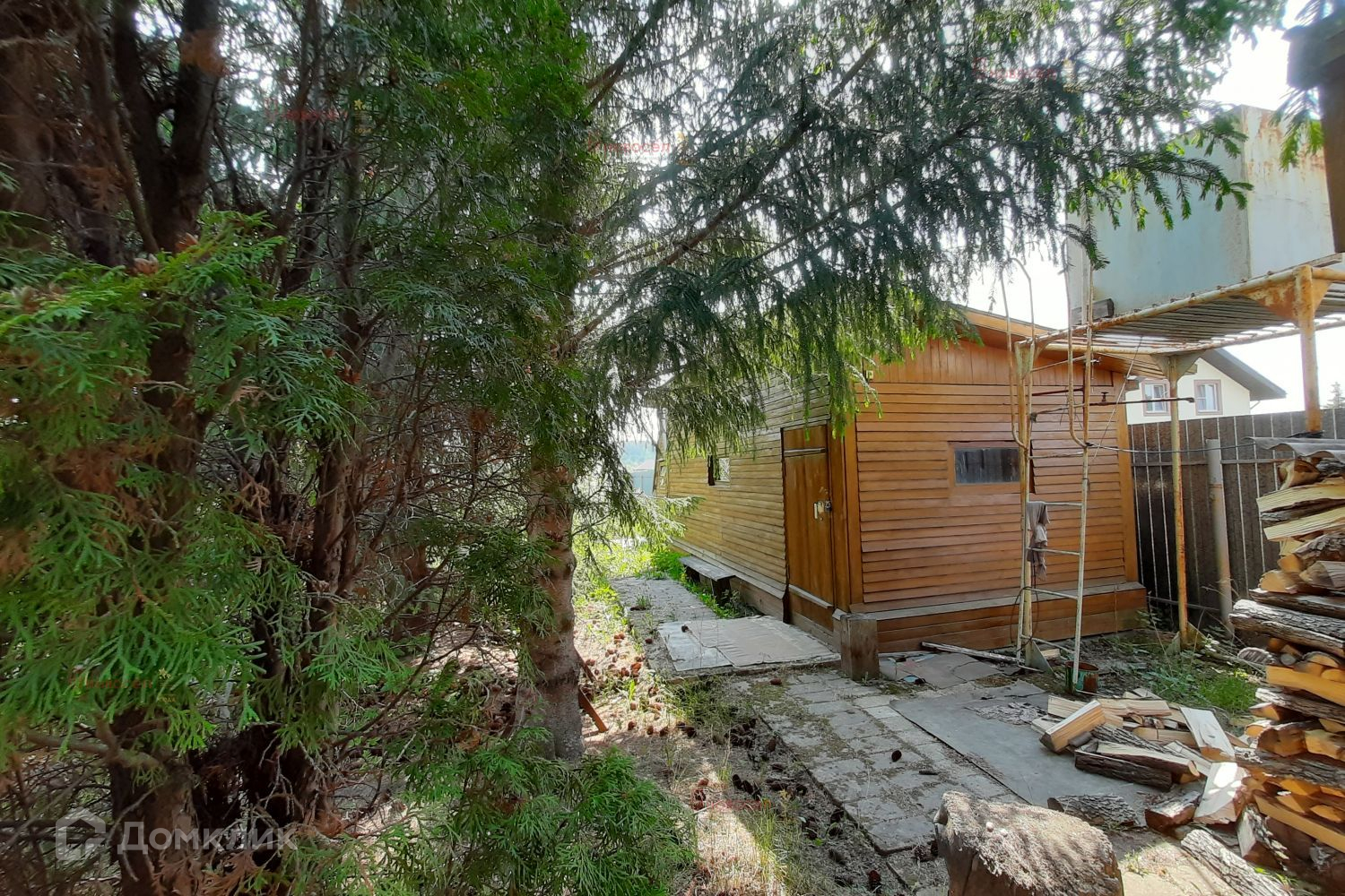 На участке гараж с овощной ямой, баня и роскошные многолетние ели. Вода - из скважины.
