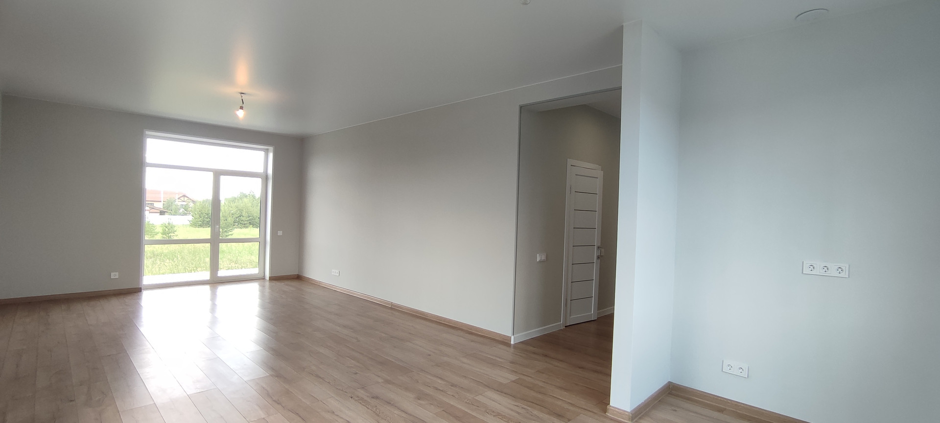 - Входная дверь и выход на террасу с панорамным остеклением