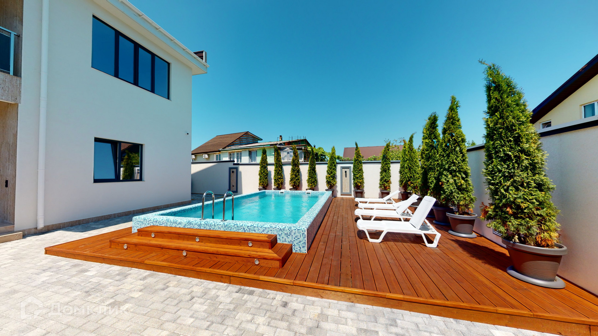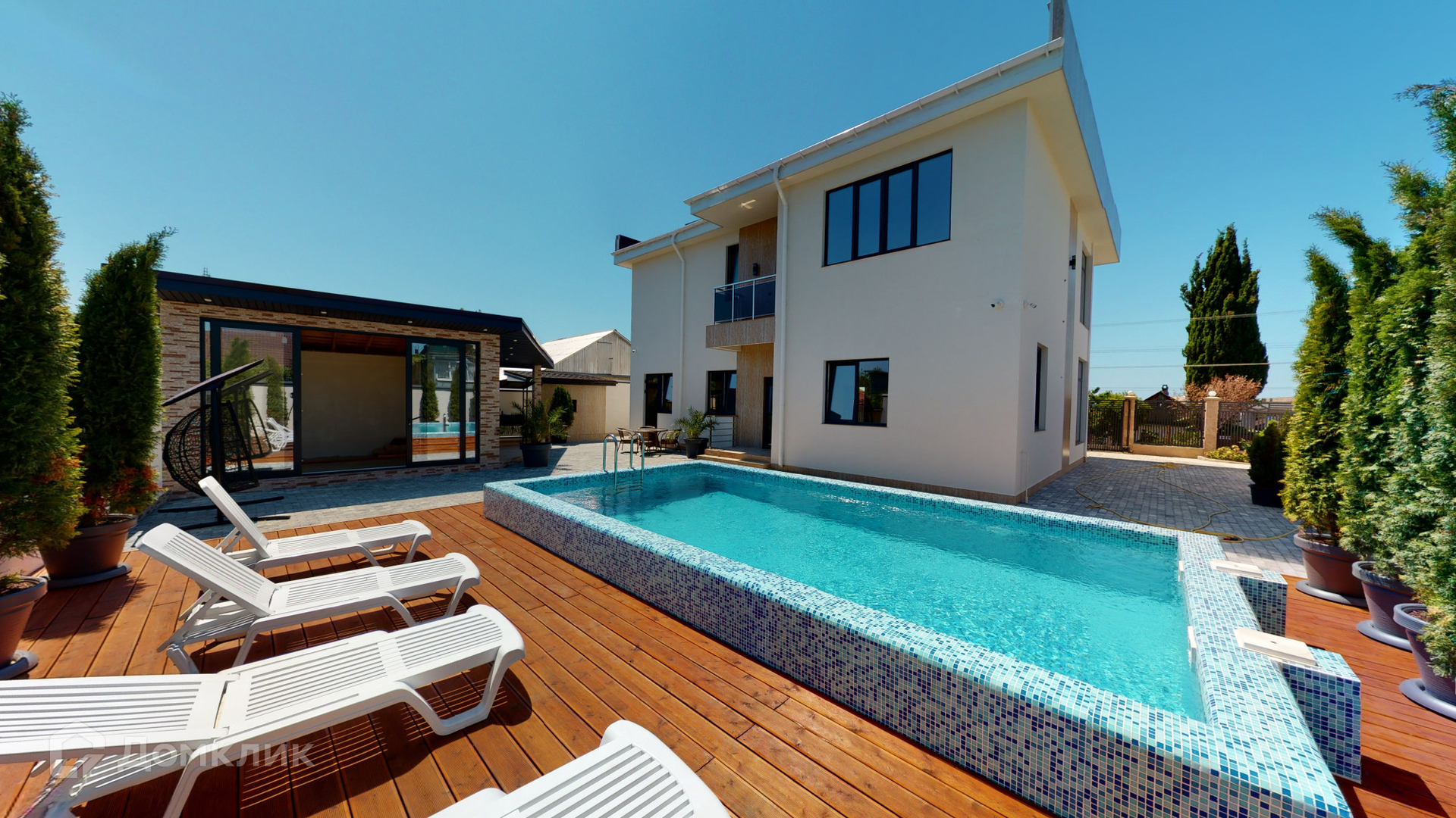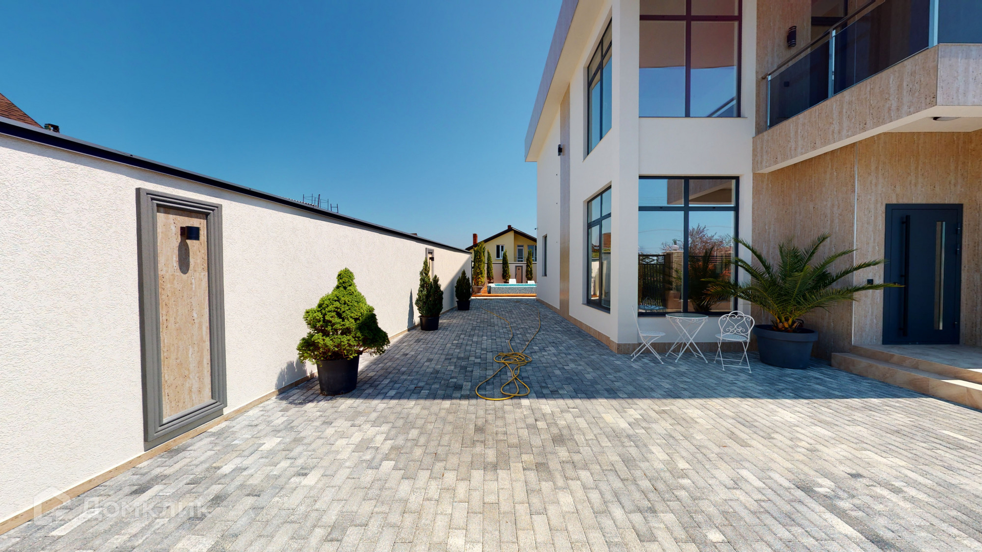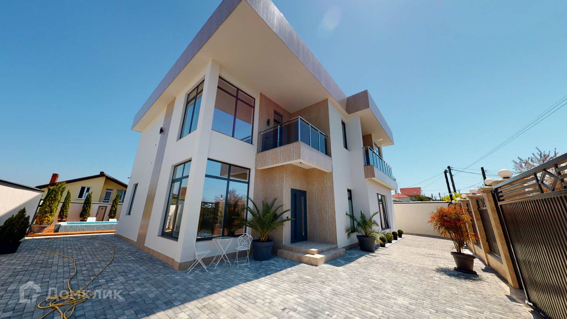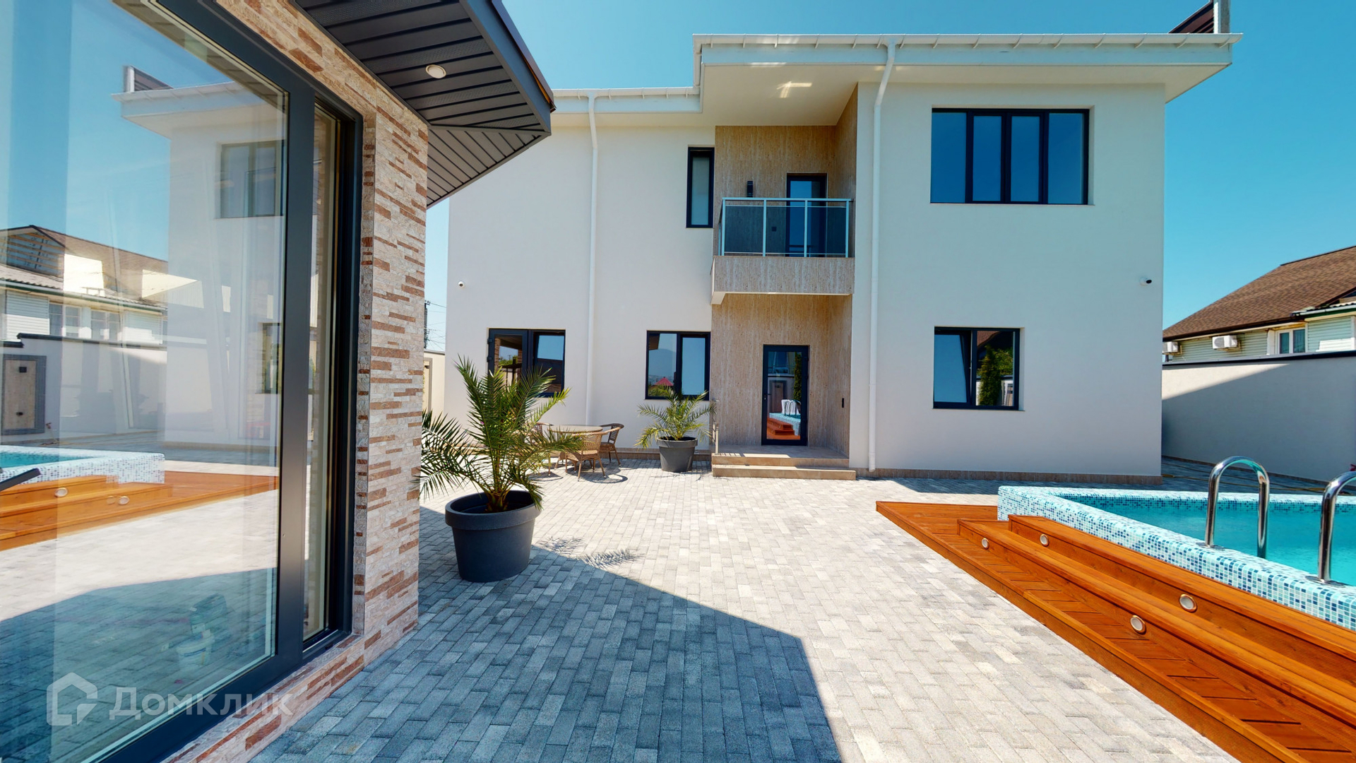 Отделка дома была выполнена из качественных материалов, на большой и закрытой территории возле дома выложена брусчатая дорожка, сделано ландшафтное озеленение, на заднем дворе имеются большой бассейн, зона барбекю и закрытая беседка для комфортного отдыха, парковочное место на 2-3 машины и асфальтный подъезд прямо к воротам.