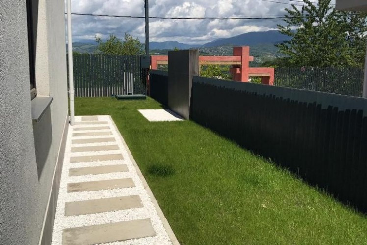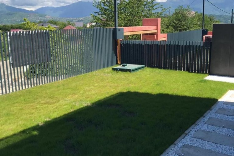 Участок огорожен забором - жалюзи, выполнено ландшафтное озеленение, на участке и фасаде коттеджа дизайнерская подсветка.