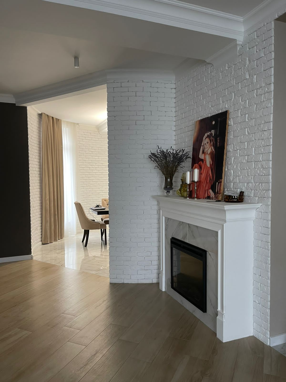 Большая гостиная с зоной отдыха и дополнительным пространством под библиотеку с камином.