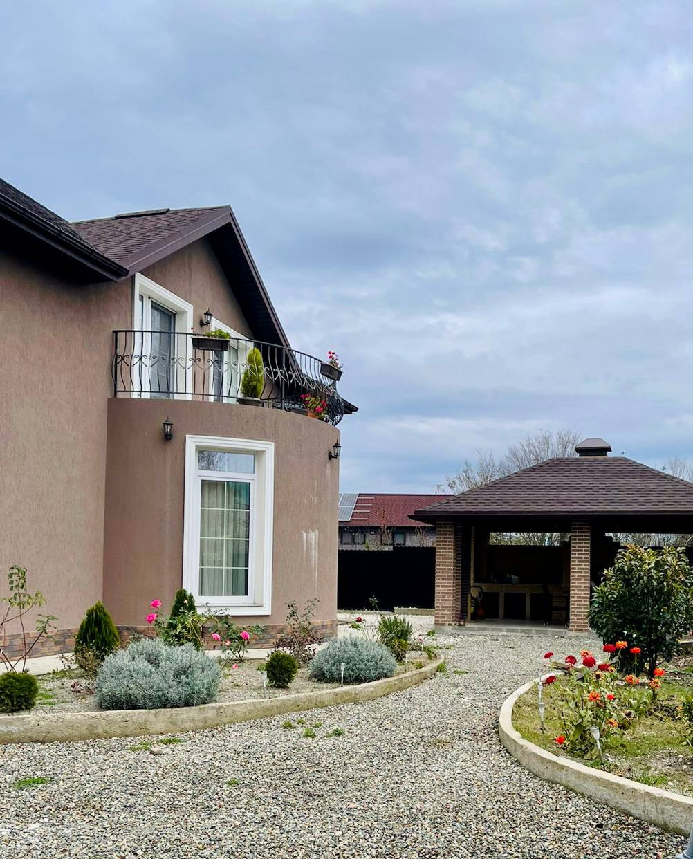 Во дворе оборудованная современной техникой и мебелью крытая мангальная зона, озеленение, парковочные места.