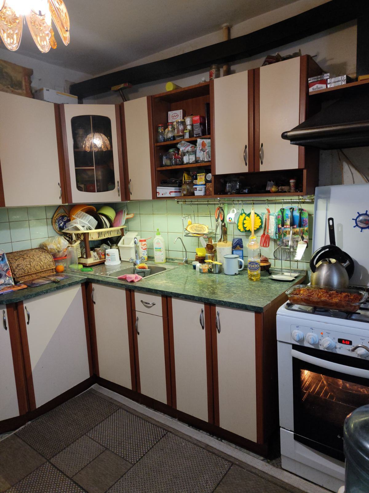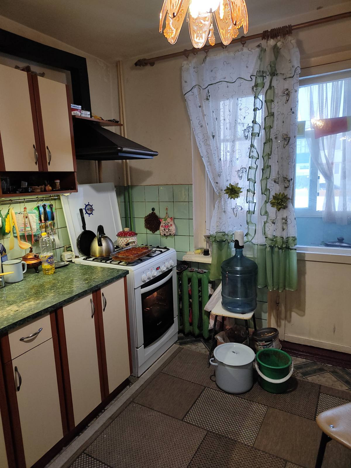 Ремонт в квартире косметический, заменены радиаторы отопления, установлены пластиковые стеклопакеты, на полу линолеум. Остается кухонный гарнитур с газовой плитой.