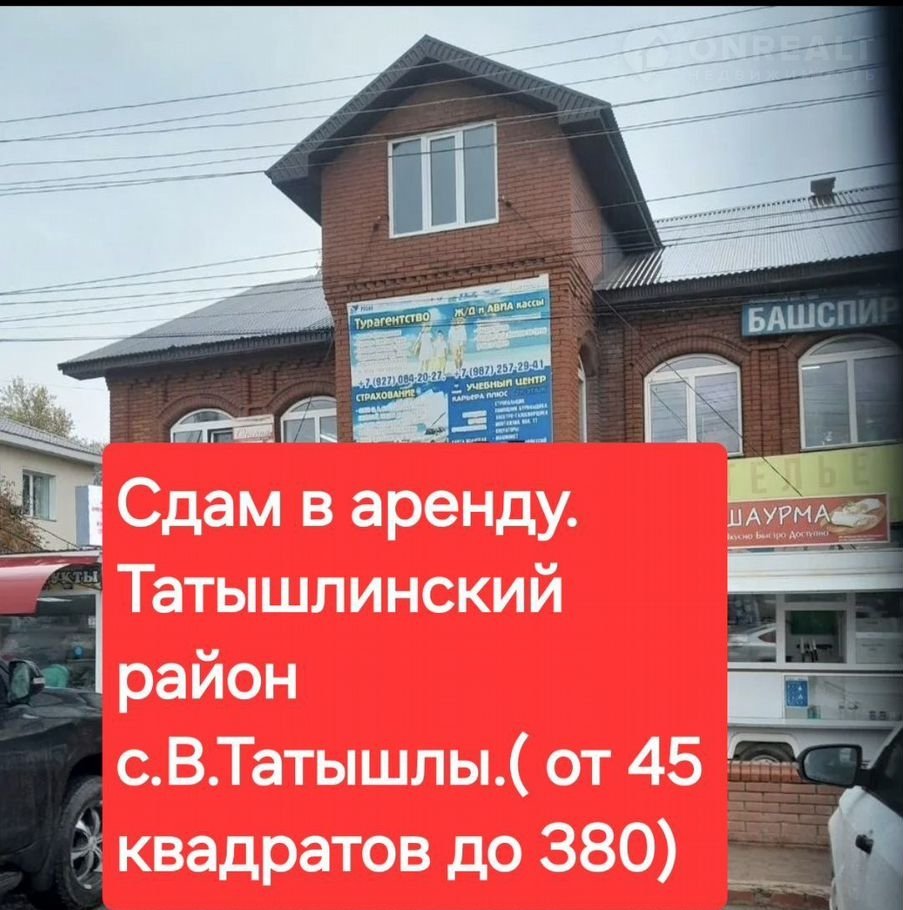 Сдается помещение в аренду в районном центре с. В. Татышлы. Обьект расположен на центральной улице. Хорошая проходимость. Удобная парковка. Общая площадь 380 кв. метров.(оптом 550 за квадратный метр) Есть возможность поделить .Первый месяц частичная оплата счета. Оптом скидка.