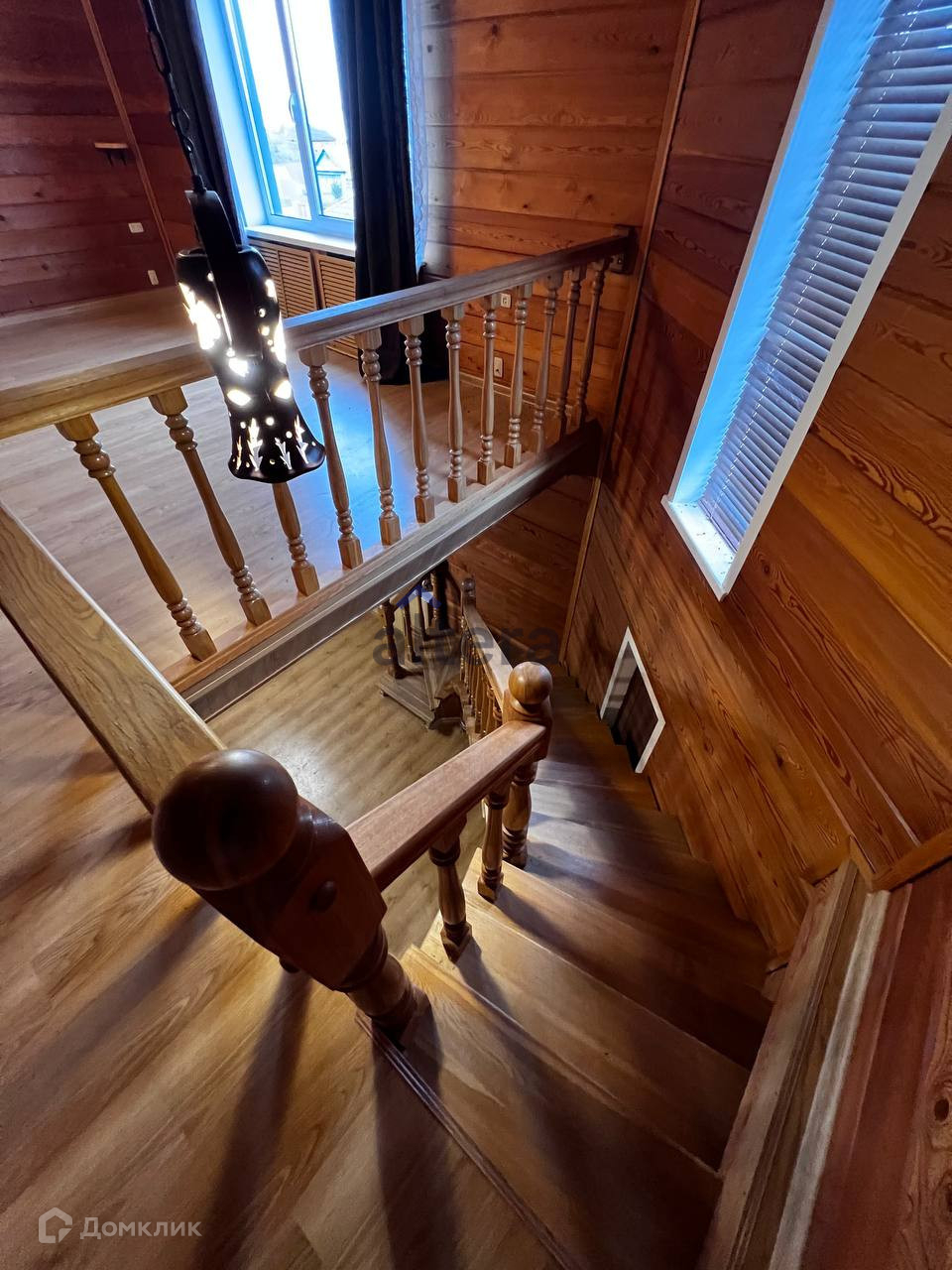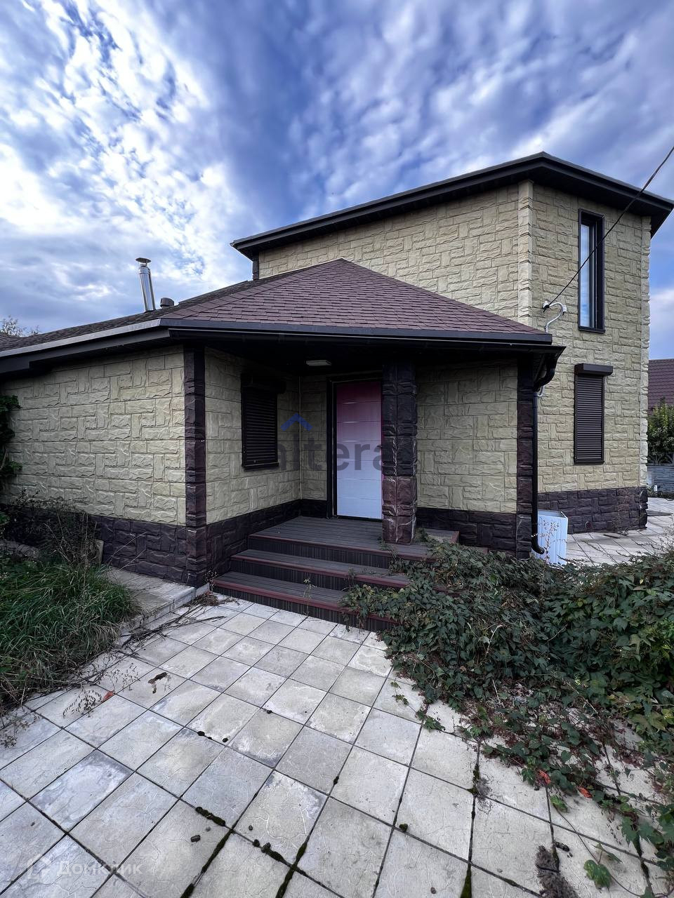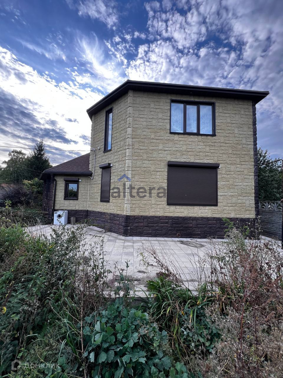 Дом 2 этажный, из бруса, снаружи обшит декоративным фасадом. На окнах рольставни.