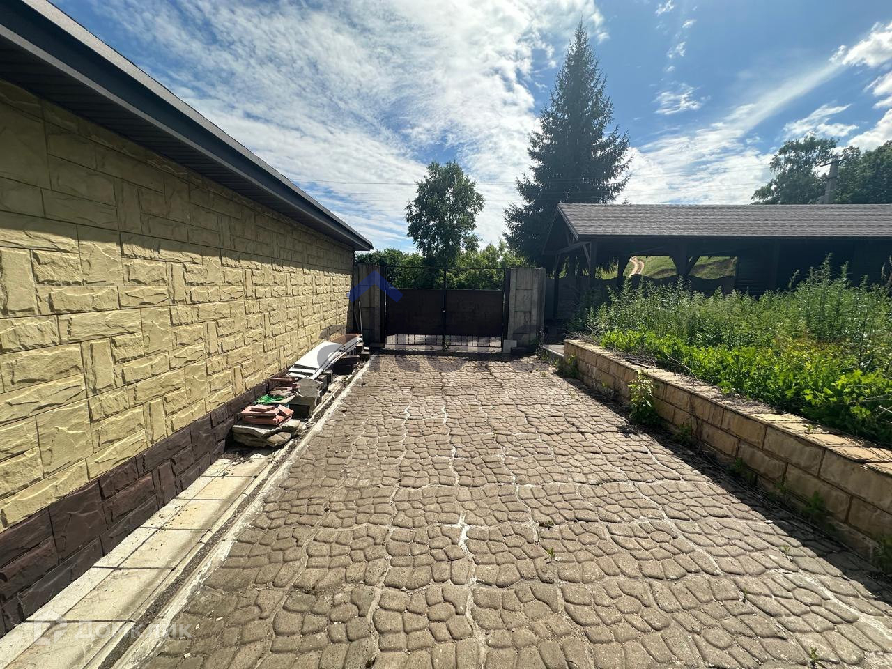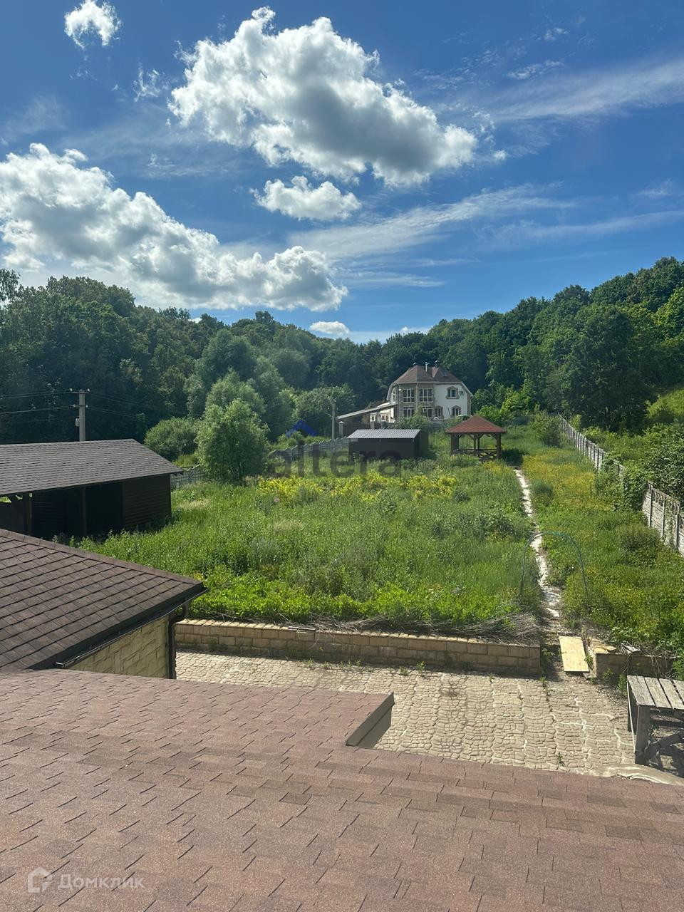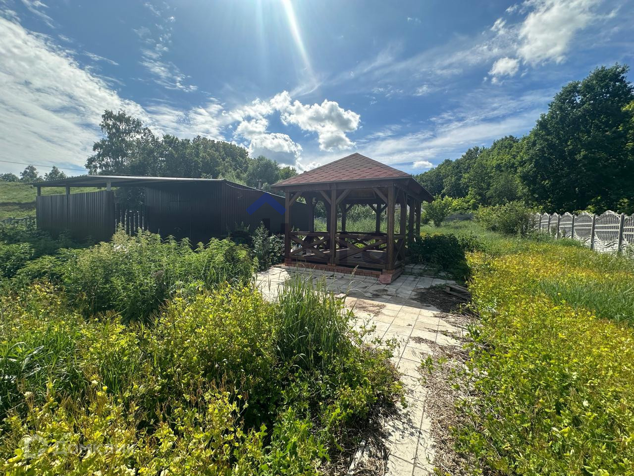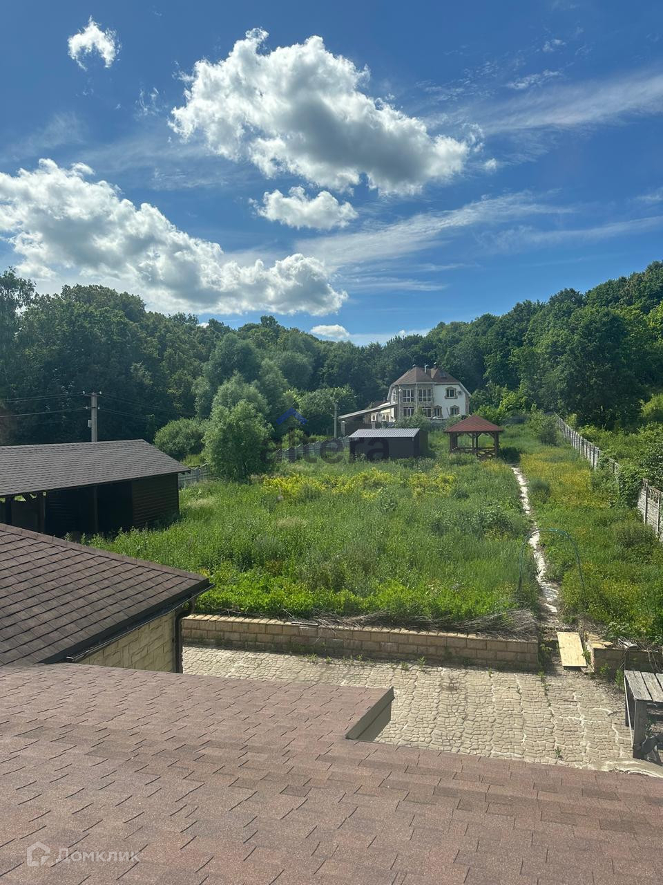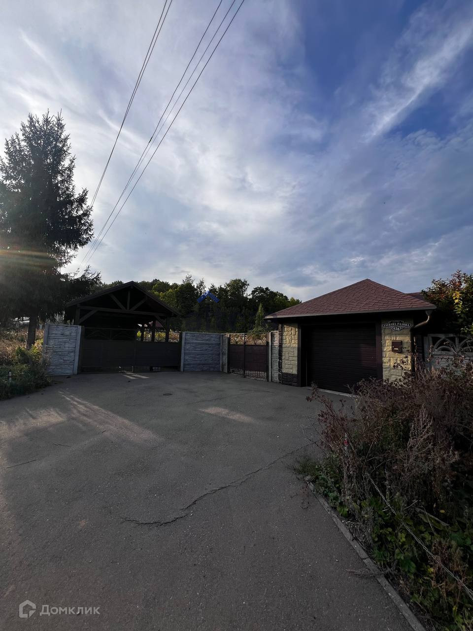 Участок 17 соток, огорожен забором. Имеется закрытый гараж с автоматическими воротами, имеется навес для машины, на участке есть беседка.
