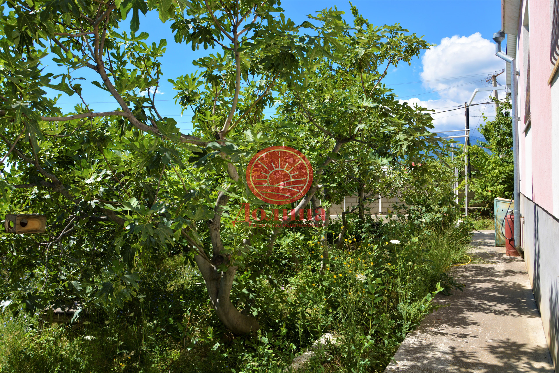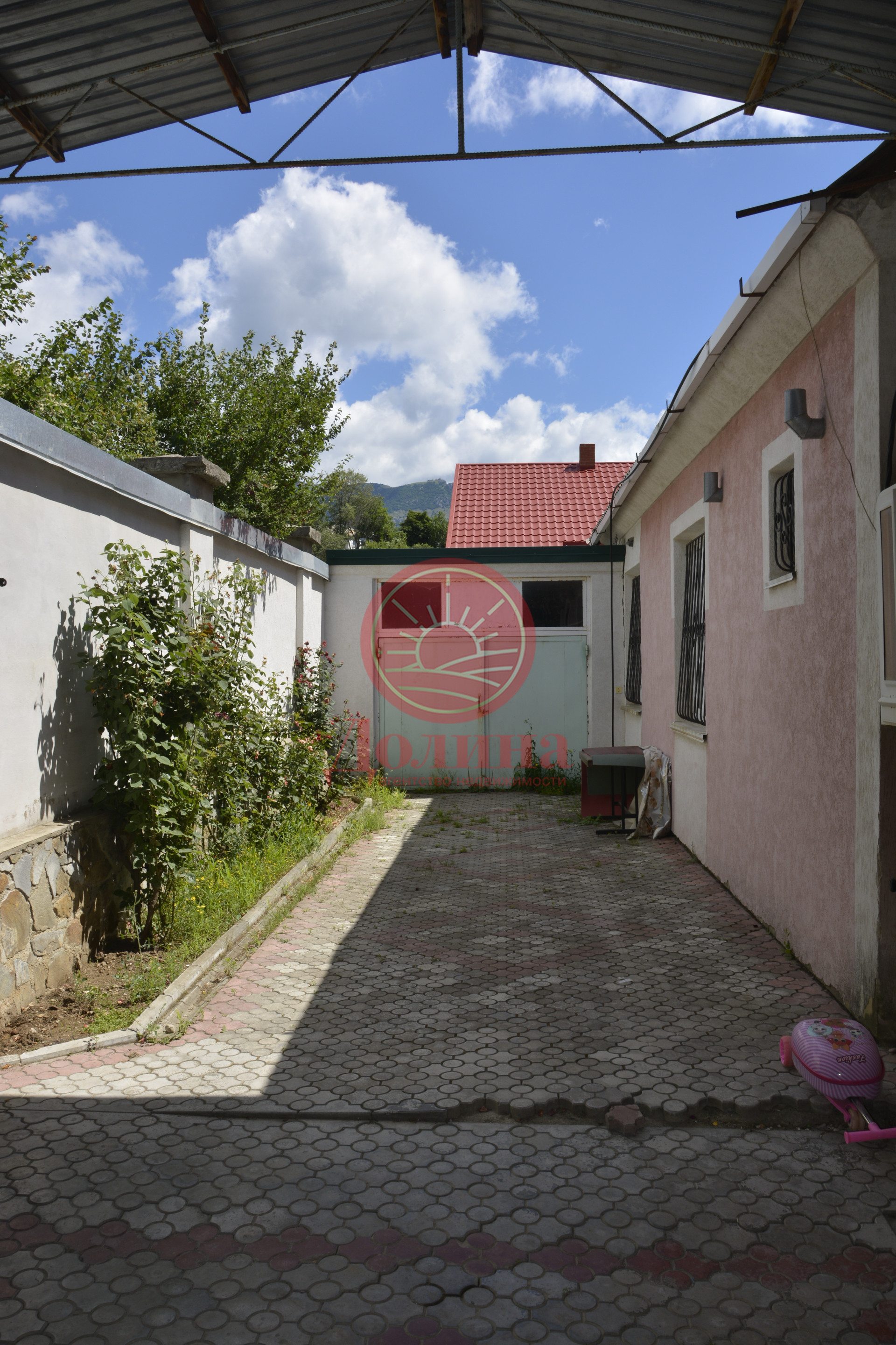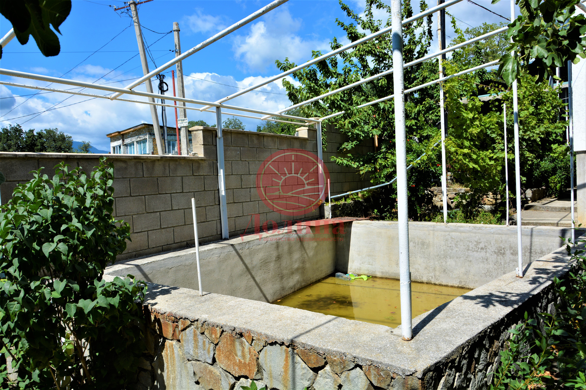 Во дворе грамотно спланированы зона парковки (также имеется капитальный гараж), зона отдыха с мангалом, бассейн 5м*4м*1.5м с видом на море, Алушту и горы. Разбит плодоносящий сад: инжир, гранат, виноград.