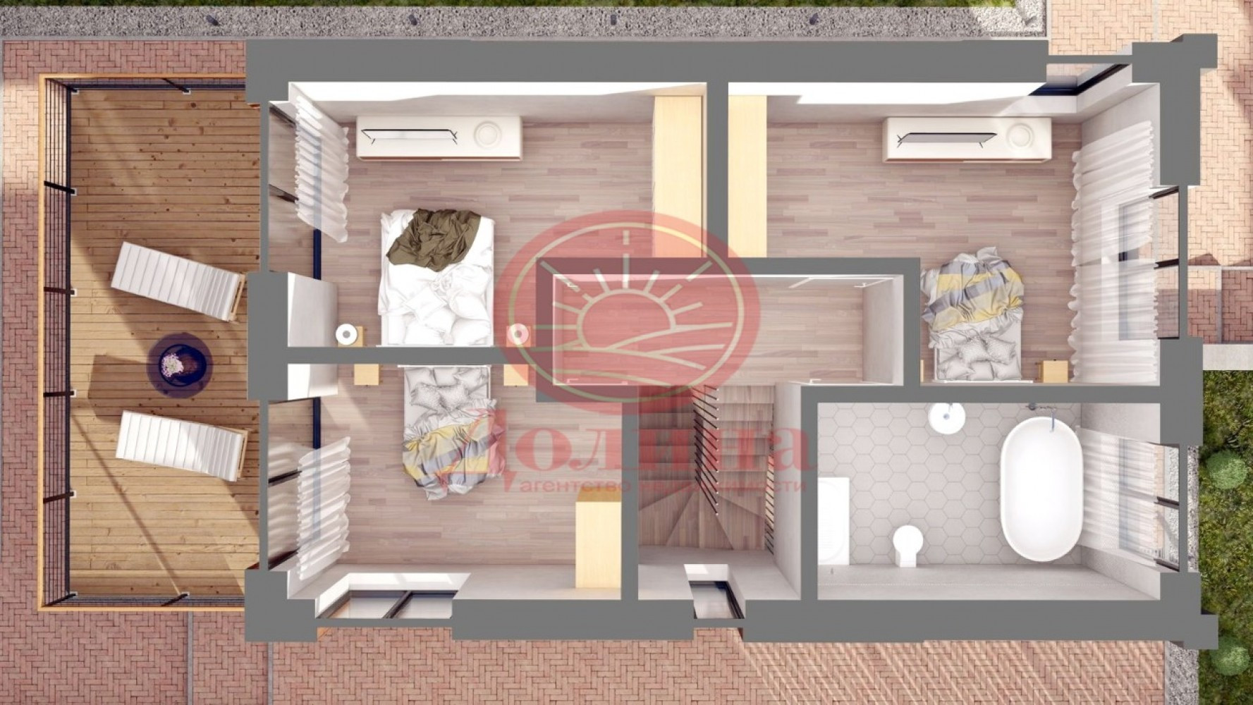 На втором этаже совмещенный санузел, 3 комнаты, две из которых с выходом на террасу, с которой открывается потрясающий вид на красоту горных массивов, город и море.