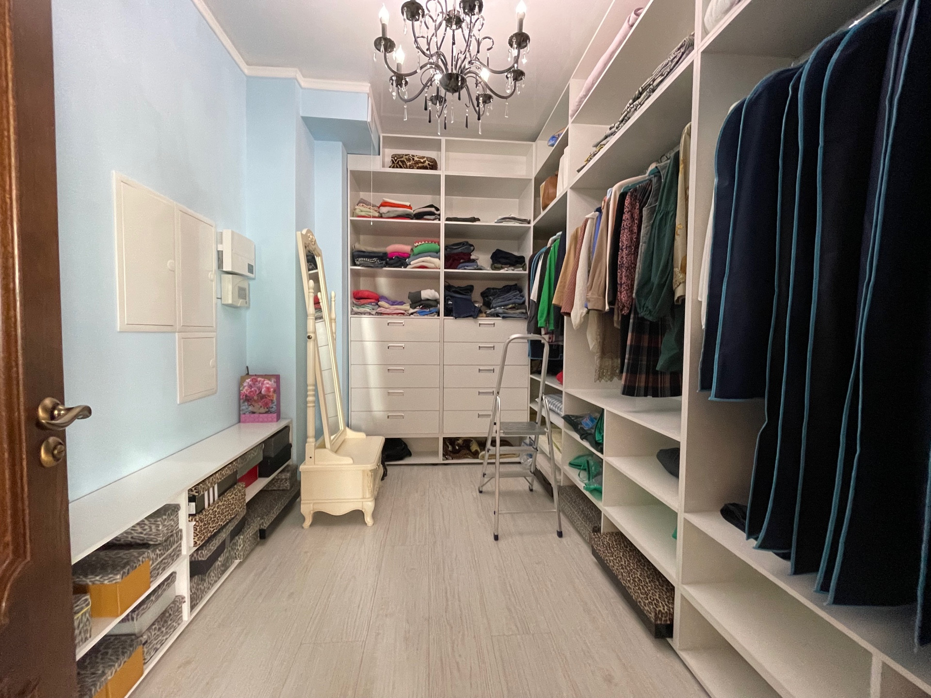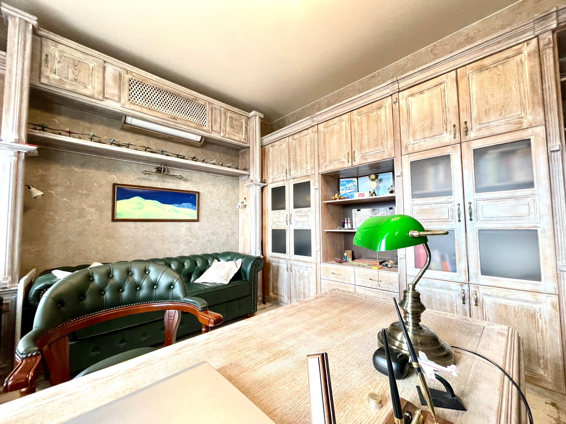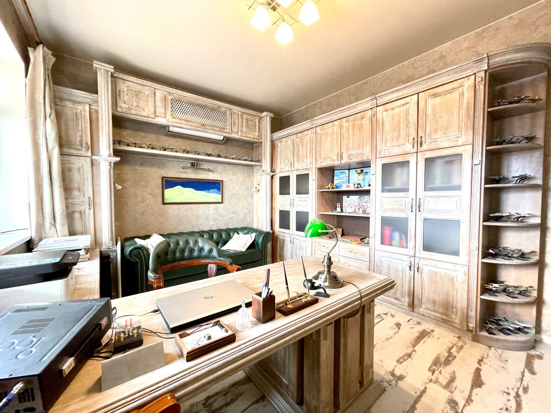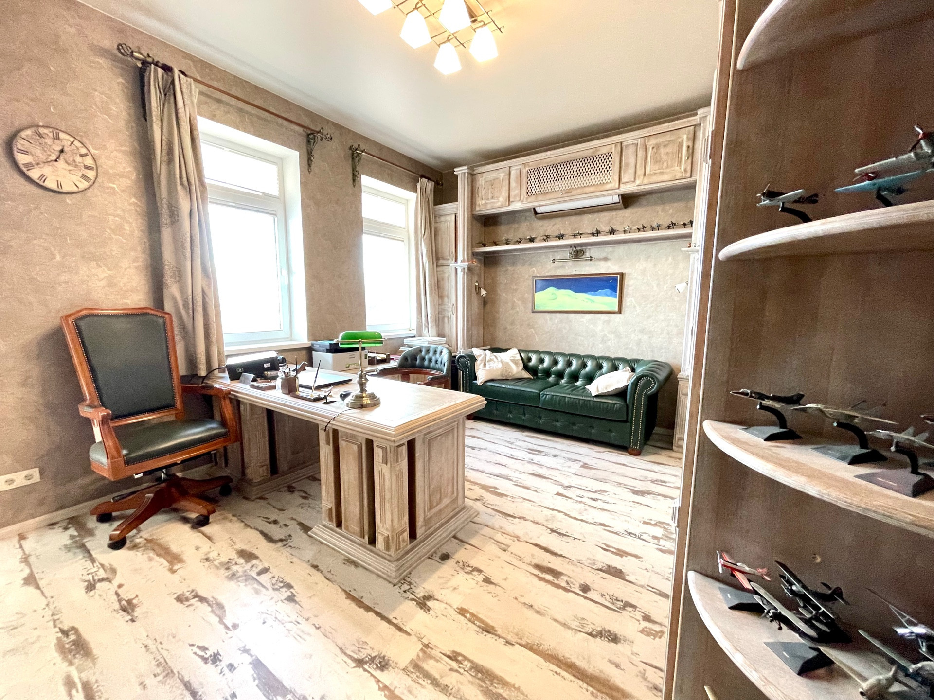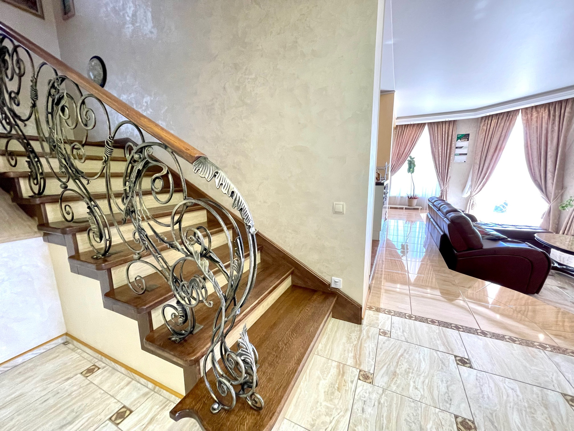 На второй этаж ведет дубовая лестница с коваными перилами. На втором этаже - мастер - спальня с двумя балконами, гардеробной, будуаром, разделенным с зоной сна перегородкой с авторскими витражами, большая ванная комната с видом на горы, и огромное панорамное окно с автоматическим карнизом. Кабинет с дубовой мебелью, изготовленной по индивидуальному заказу. Гостевая спальня.