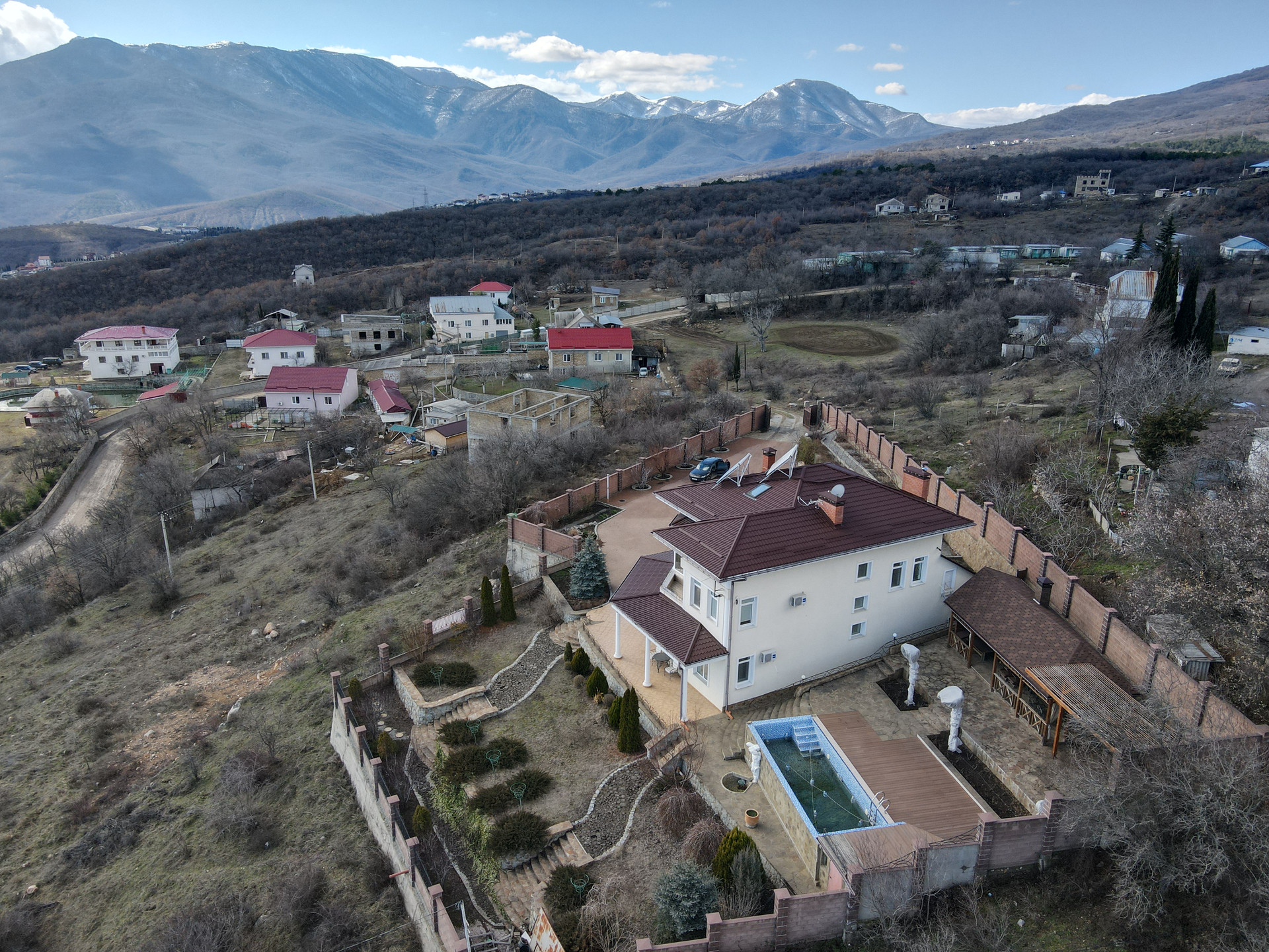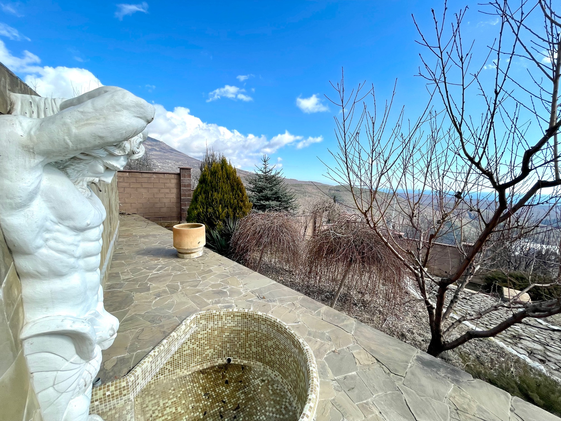 На территории также – виноградник, взрослые плодоносящие и декоративные деревья, альпийская горка.