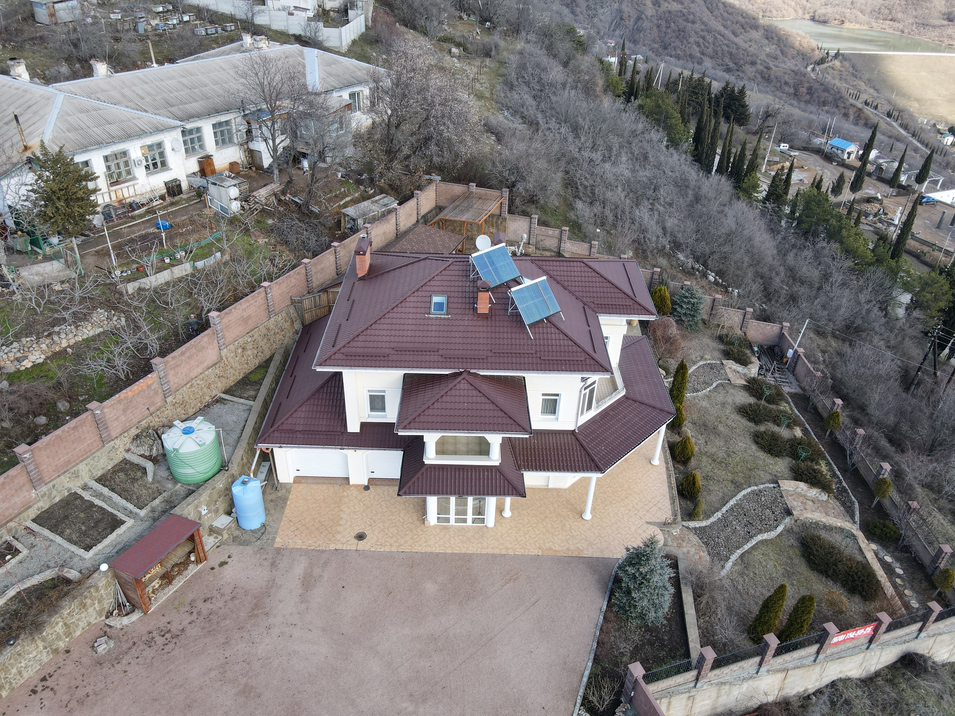 Энергообеспечение – отдельная электролиния от подстанции, рассчитана на мощность 30 кВт, разрешенная мощность – 16кВ., 3 фазы, на каждой –стабилизатор, резервный генератор 5 кВт, автоматическое аварийное освещение. Солнечные коллекторы. Автоматические уличное освещение, капельный полив сада.