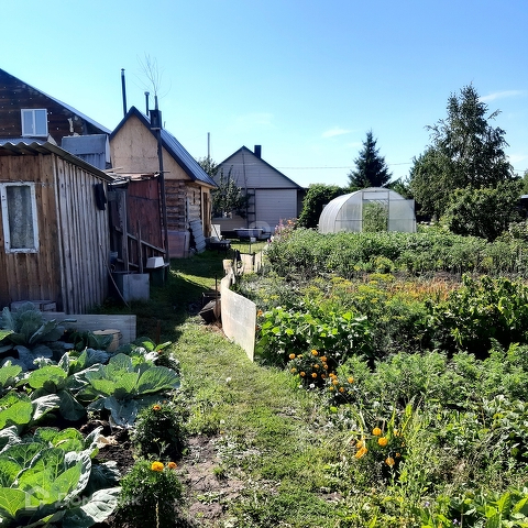 На территории гараж, дровник, стайка, новая теплица.