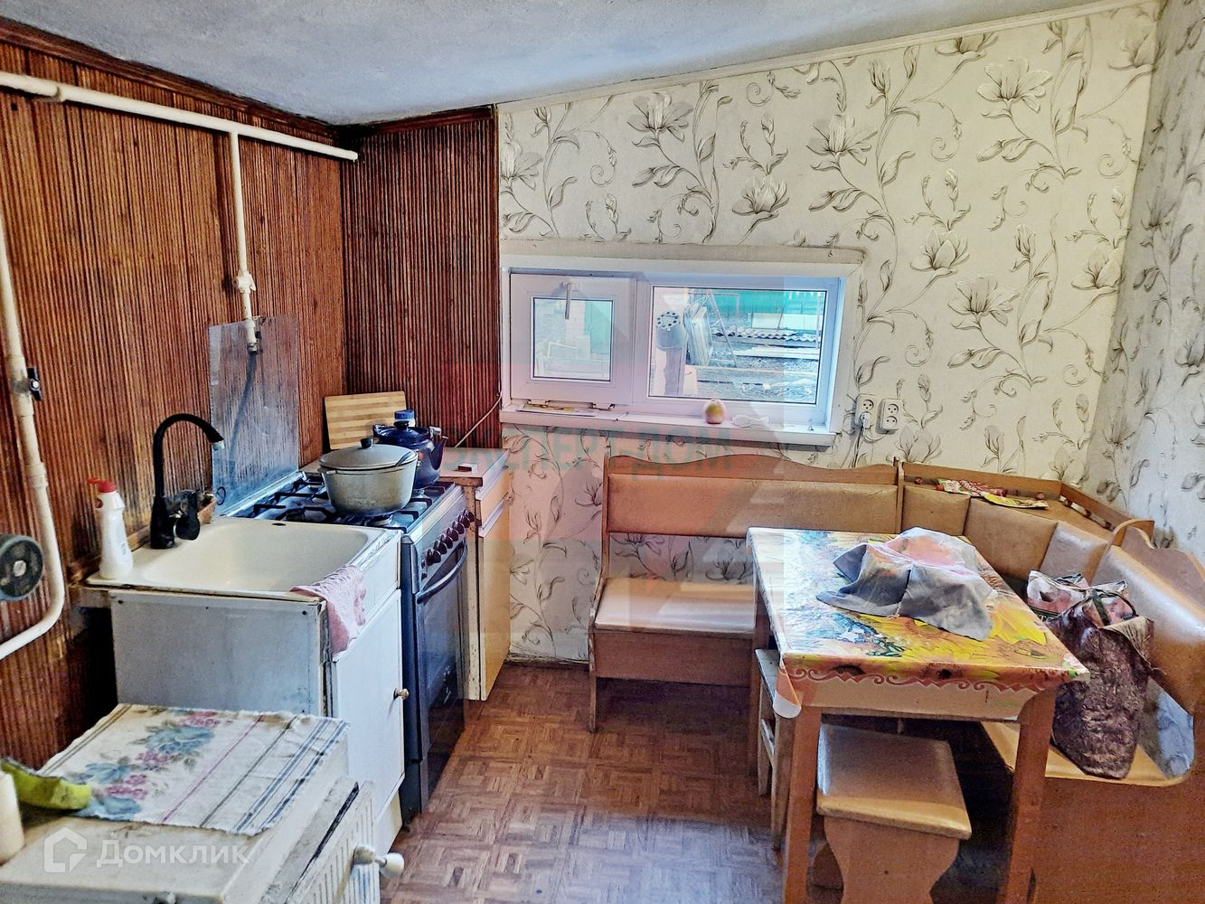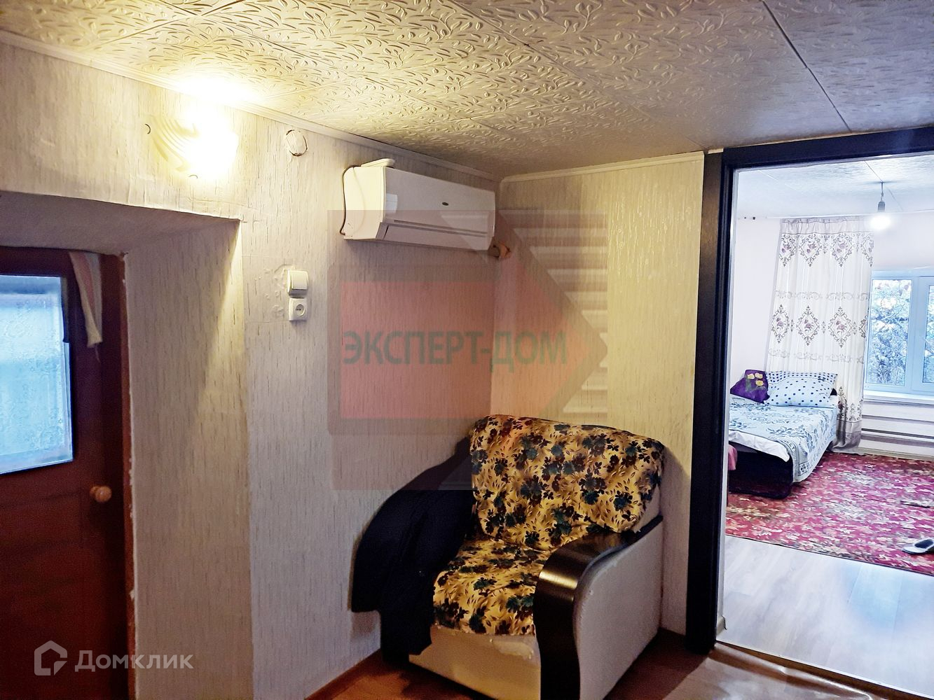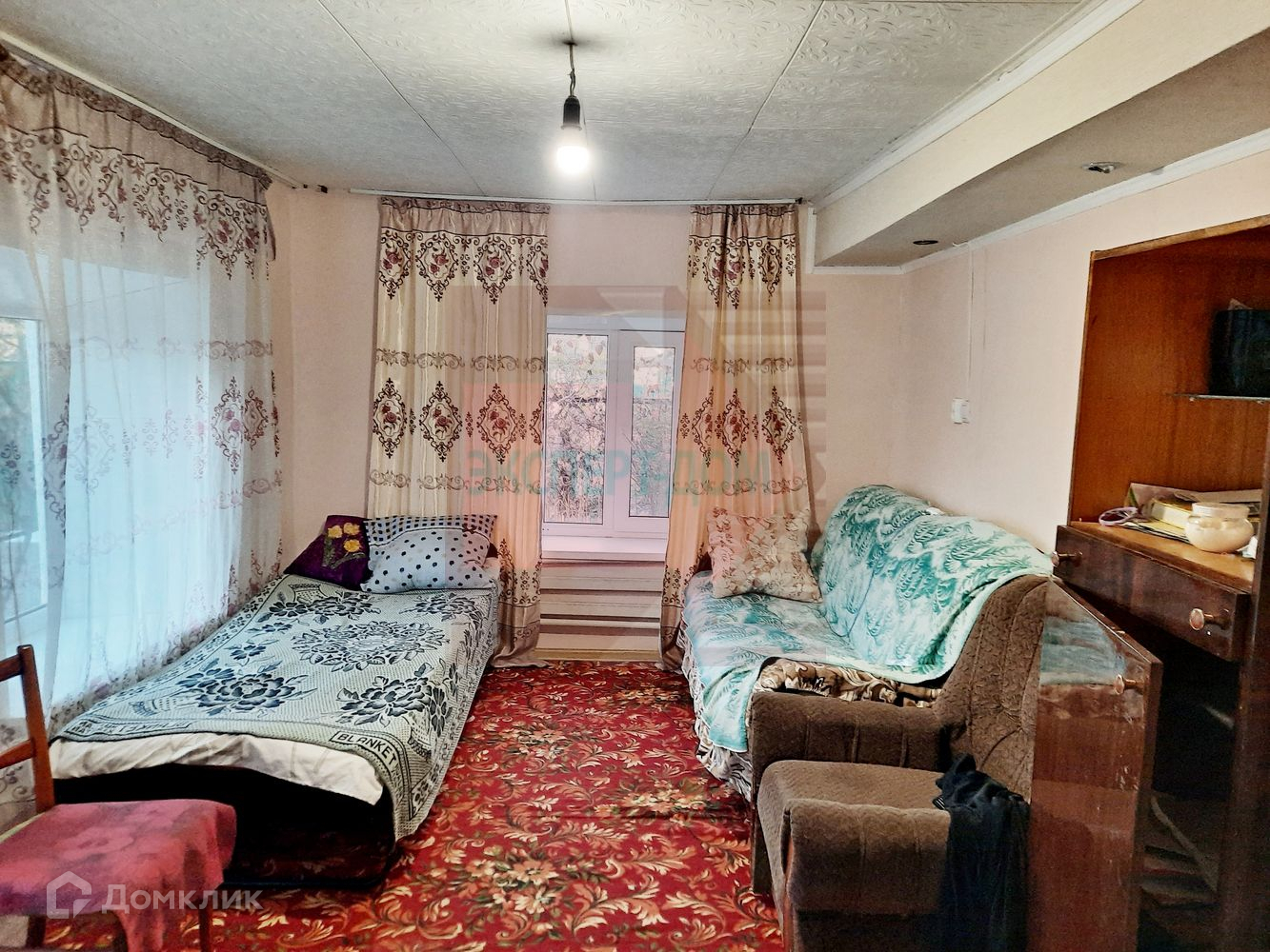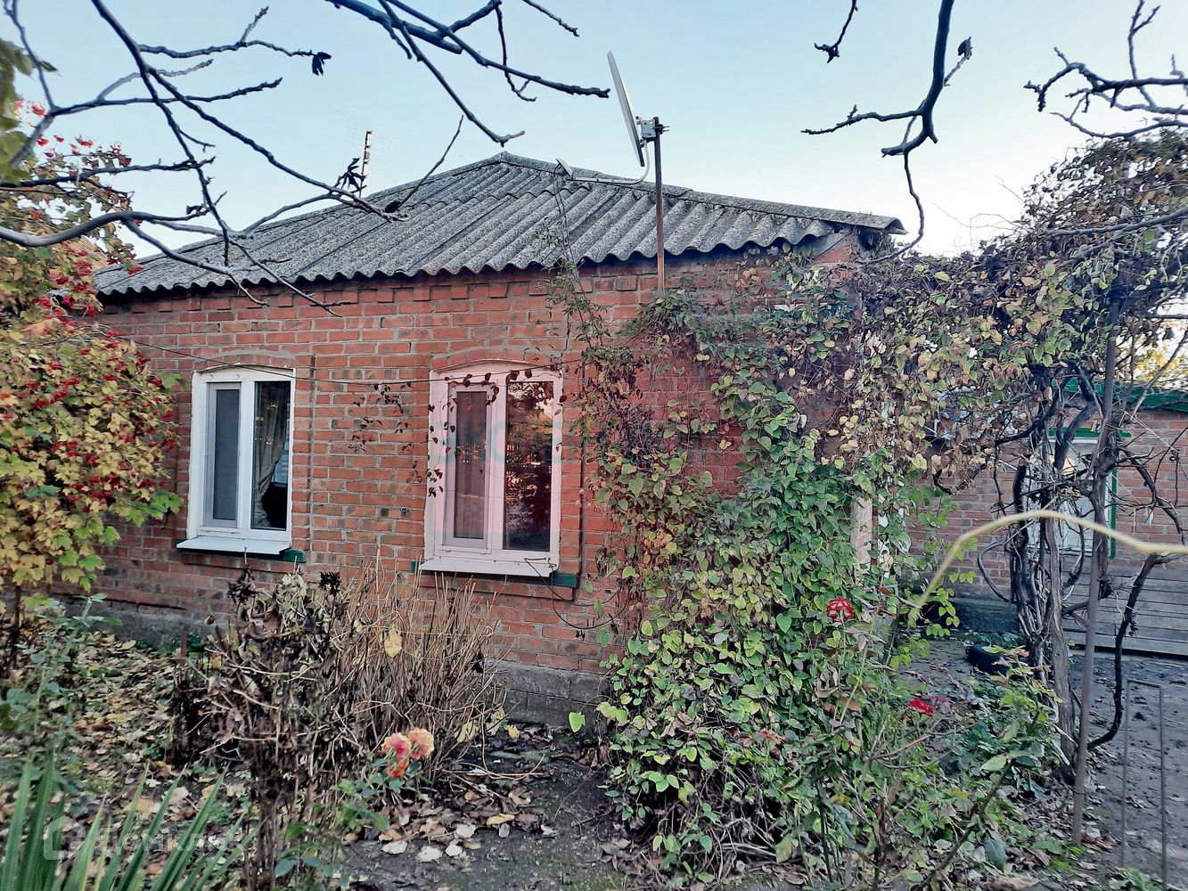 Дом саманный, обложен кирпичом. Крыша шифер. Окна металлопластиковые. Отопление газовый котел. Колонка для горячей воды. Вода из скважины. На стенах обои, полы линолеум и ламинат. Потолки навесные. В доме 2 изолированные комнаты, 3 проходные, кухня, совмещенный санузел, веранда, терраса, просторный сухой подвал.