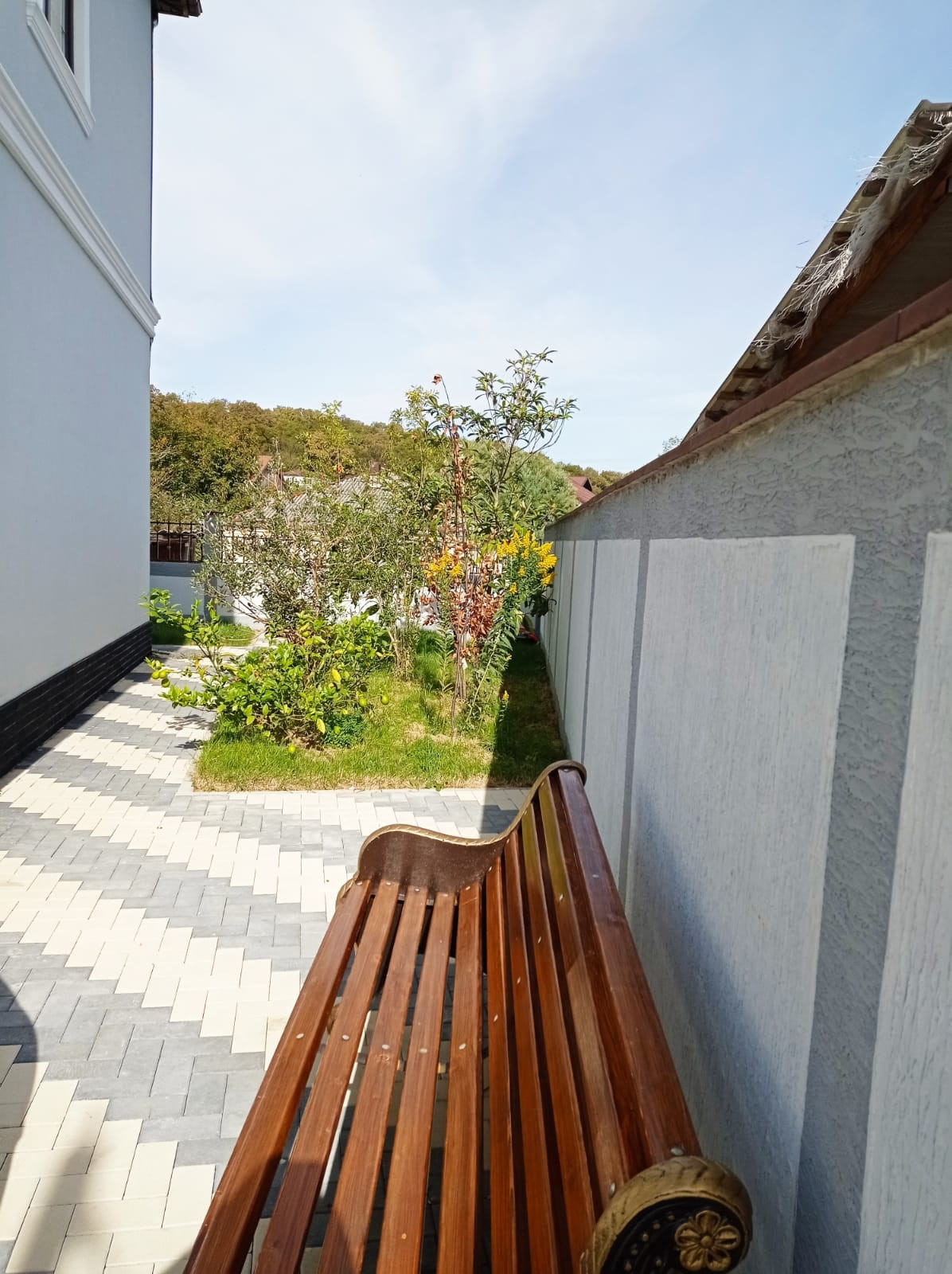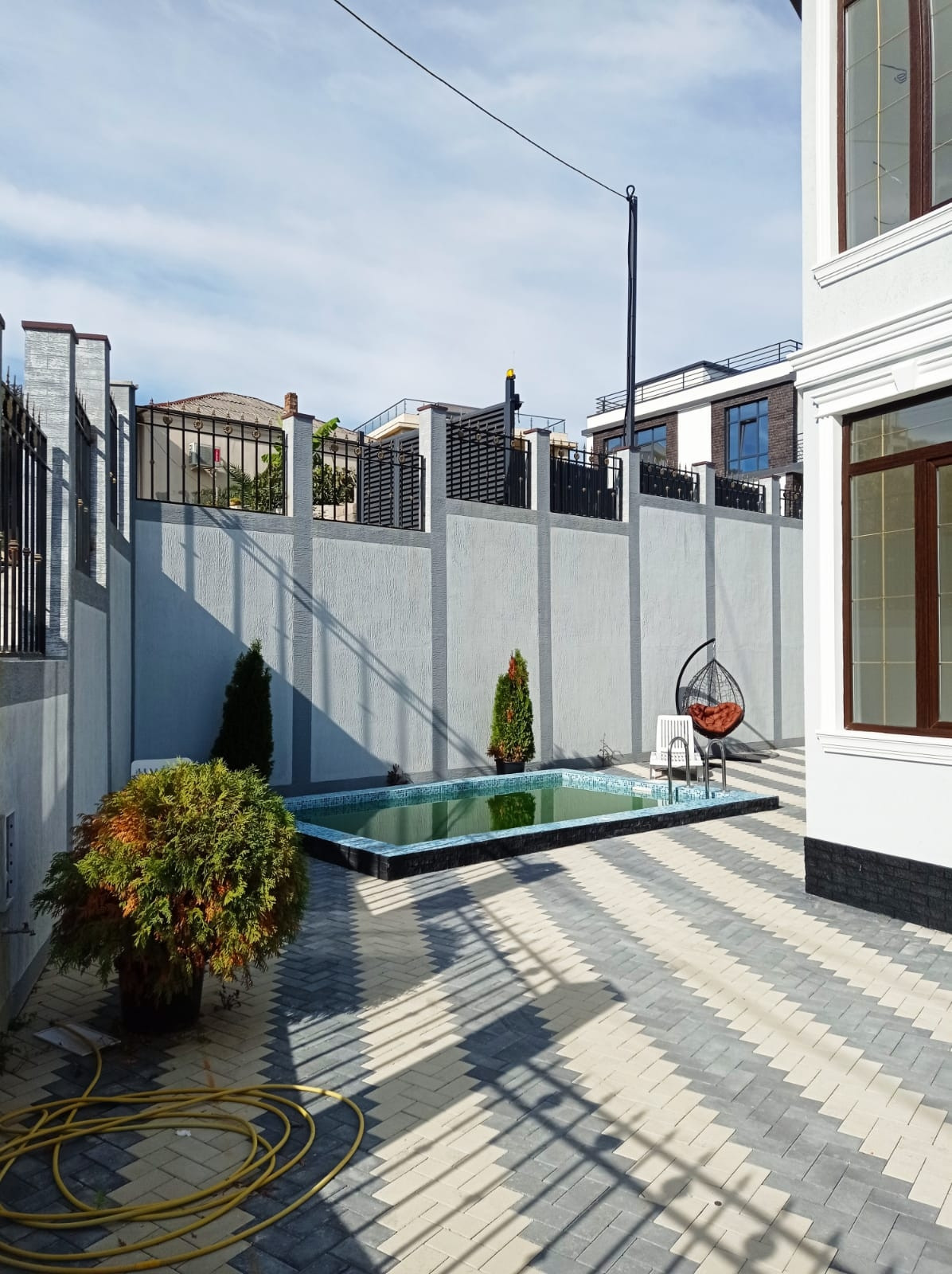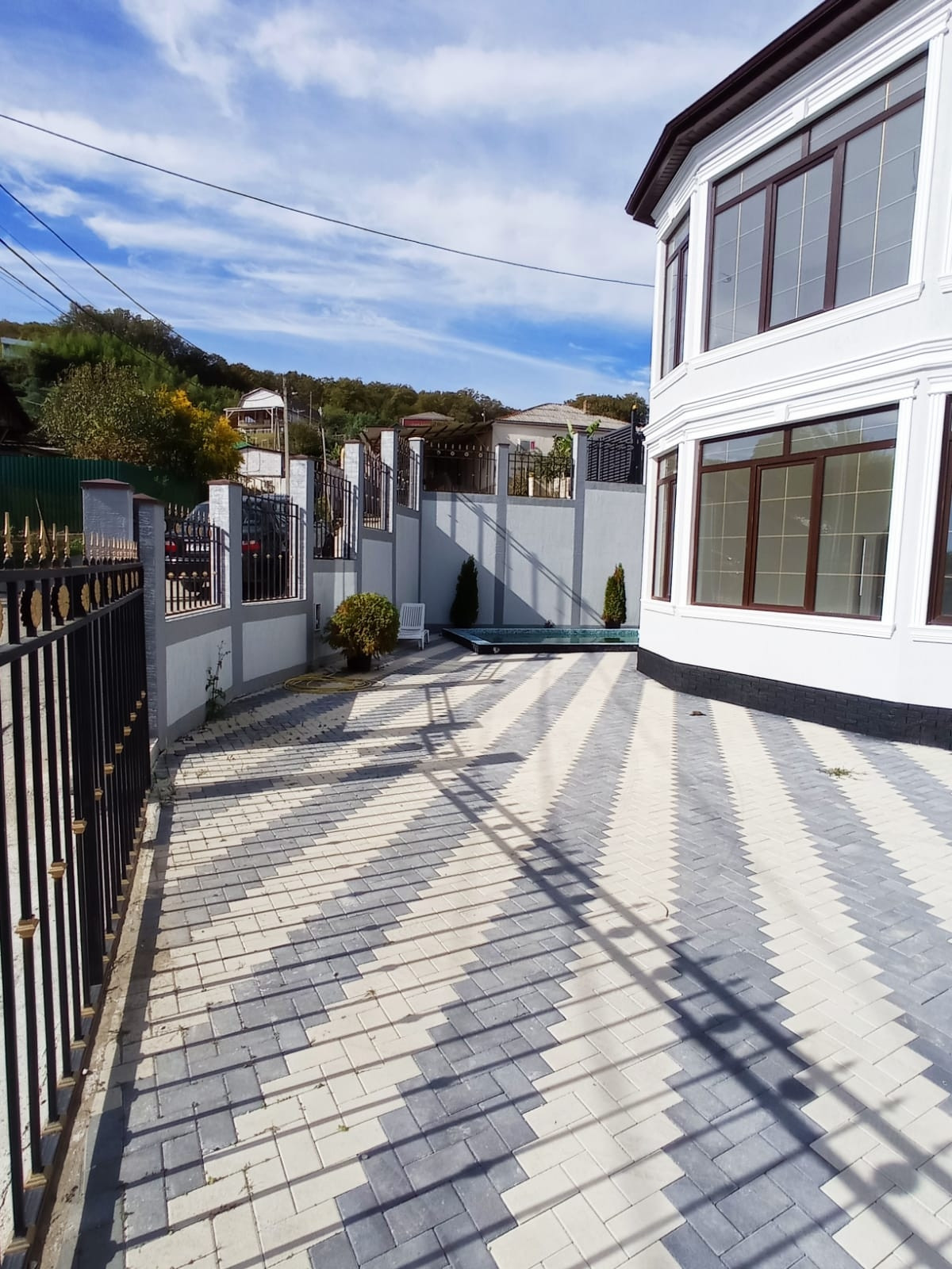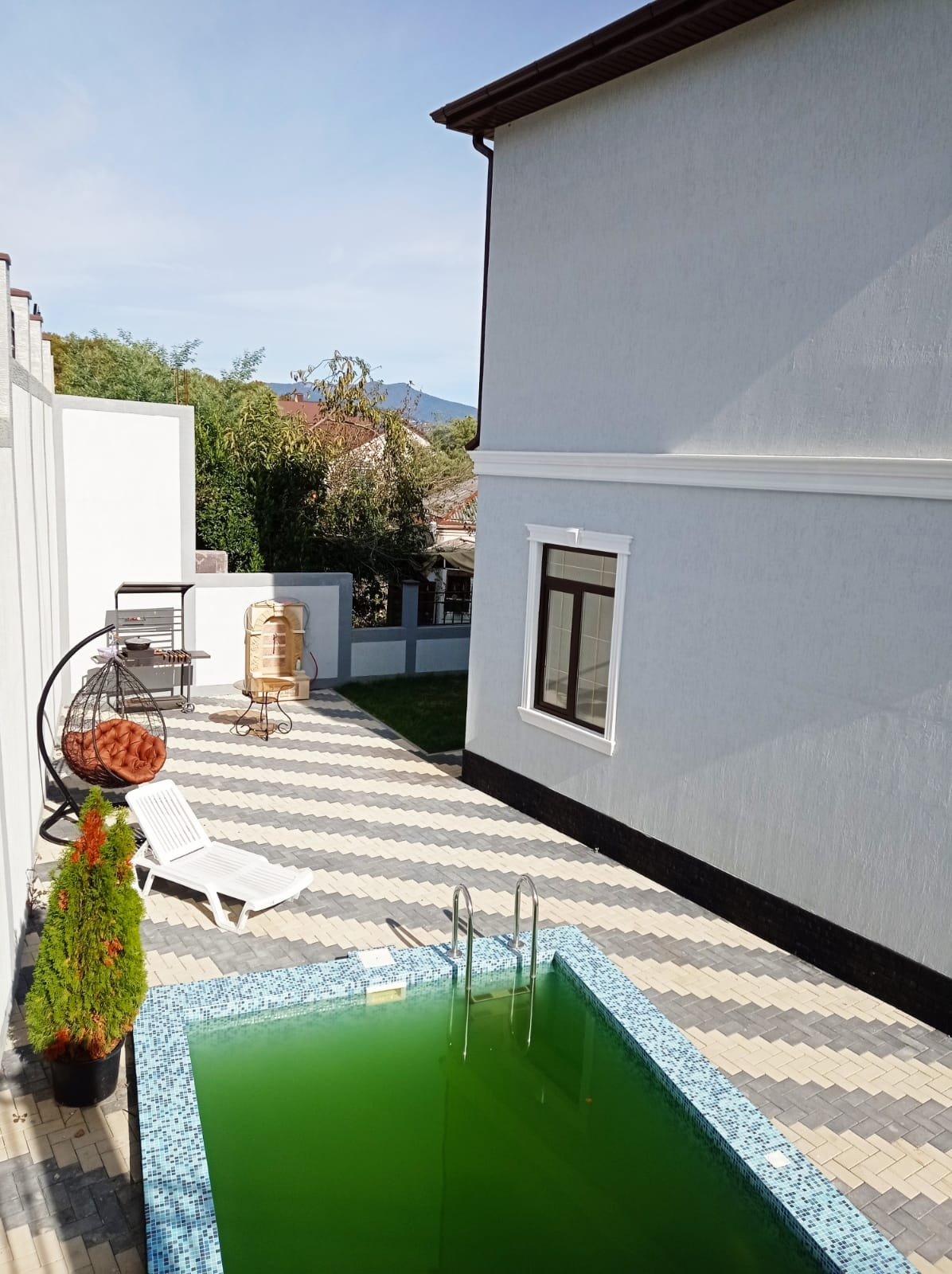 Территория благоустроена,  есть насаждения, установлен бассейн, парковка на несколько автомобилей