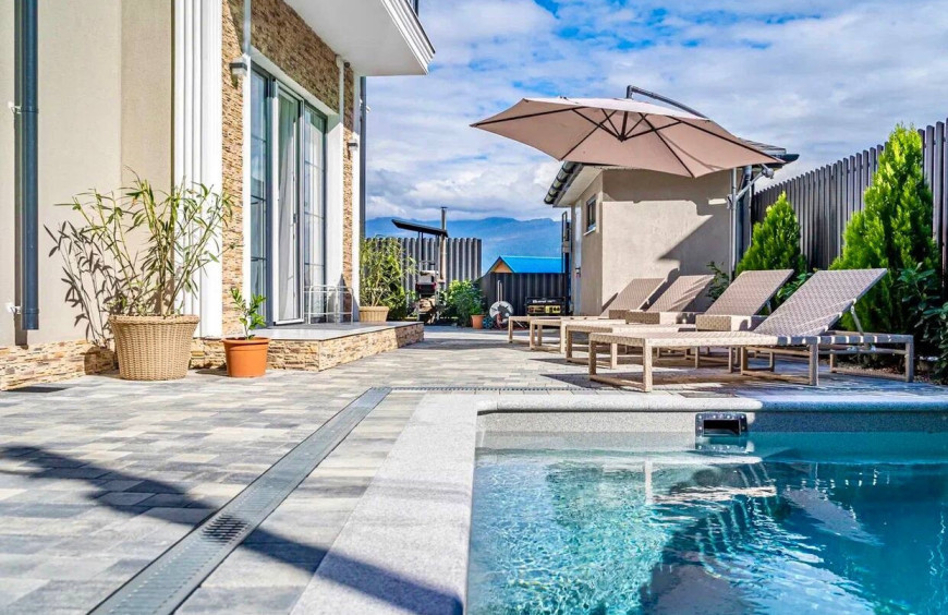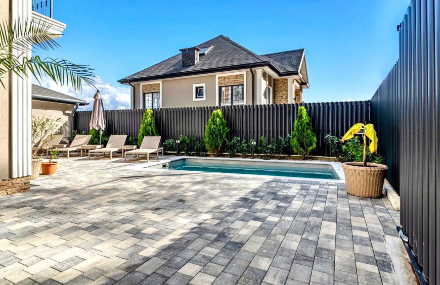 Все коммуникации, во дворе дома есть тёплый бассейн, шезлонги, зона барбекю, батут, и зона отдыха.