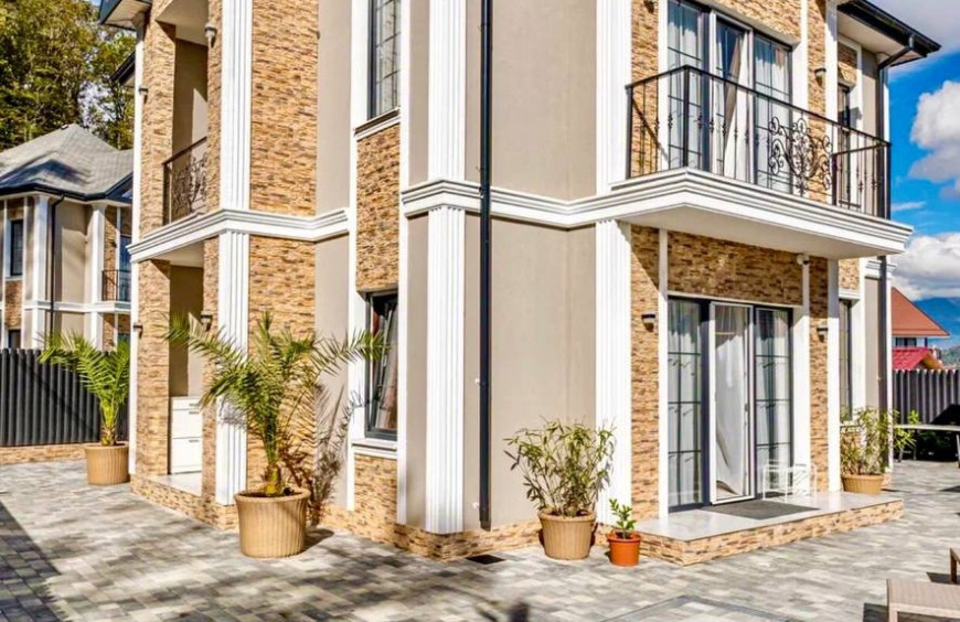 Расположен в тихом, спокойном, уютном месте на возвышенной местности с уникальным горным климатом, рядом нет федеральной дороги, дом находится рядом с национальным парком, с очень красивым видом на горы и море.