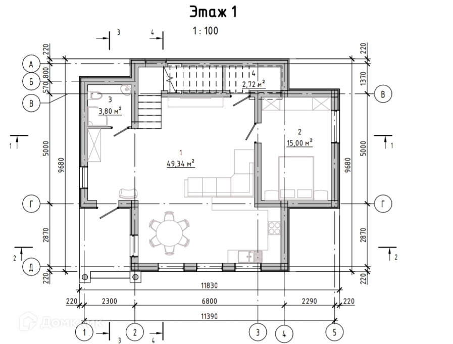При входе в дом мы попадаем в просторное помещение общей площадью 50 кв. м. Если сделать визуальное зонирование, то это помещение можно разделить на три зоны: