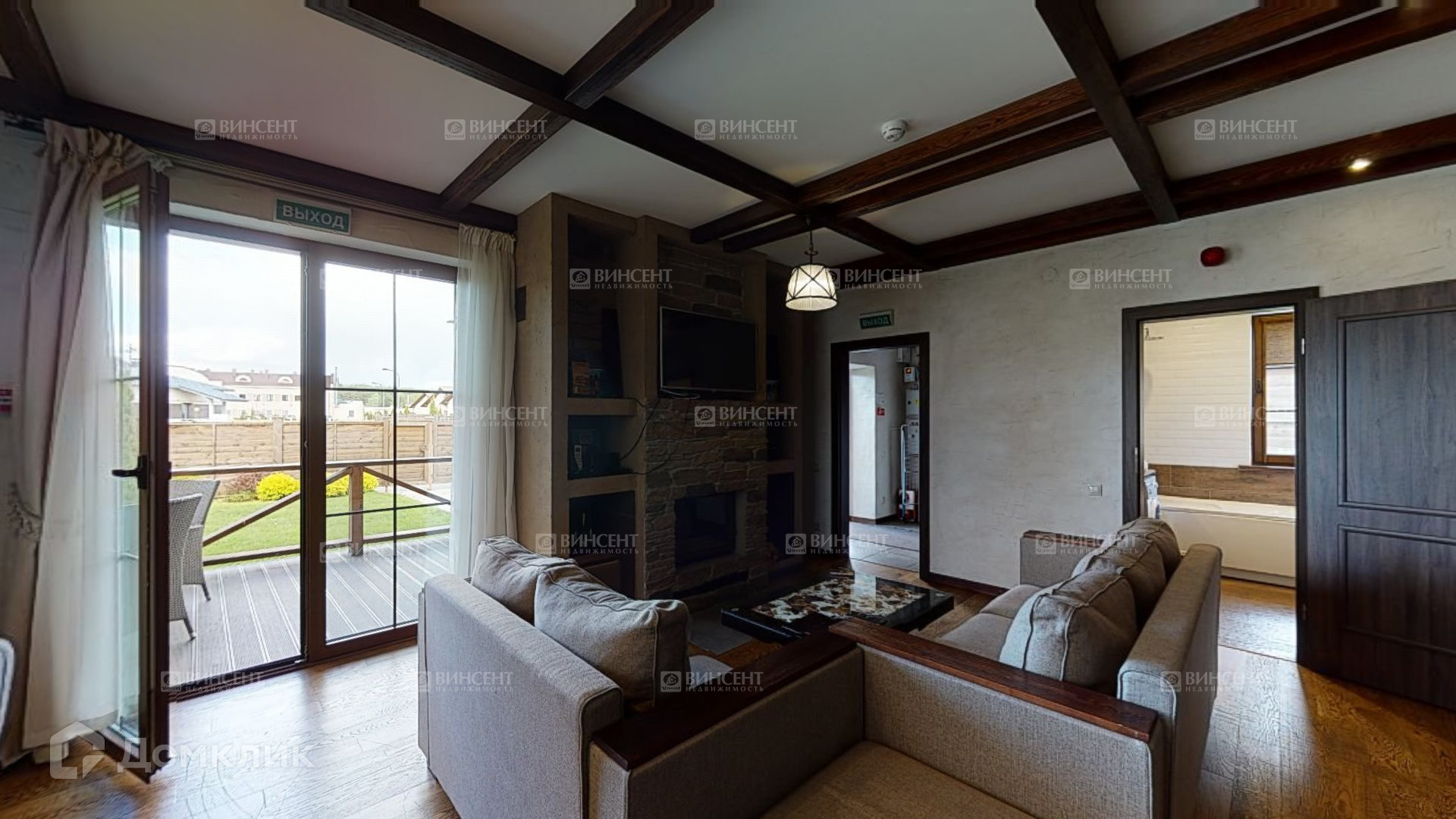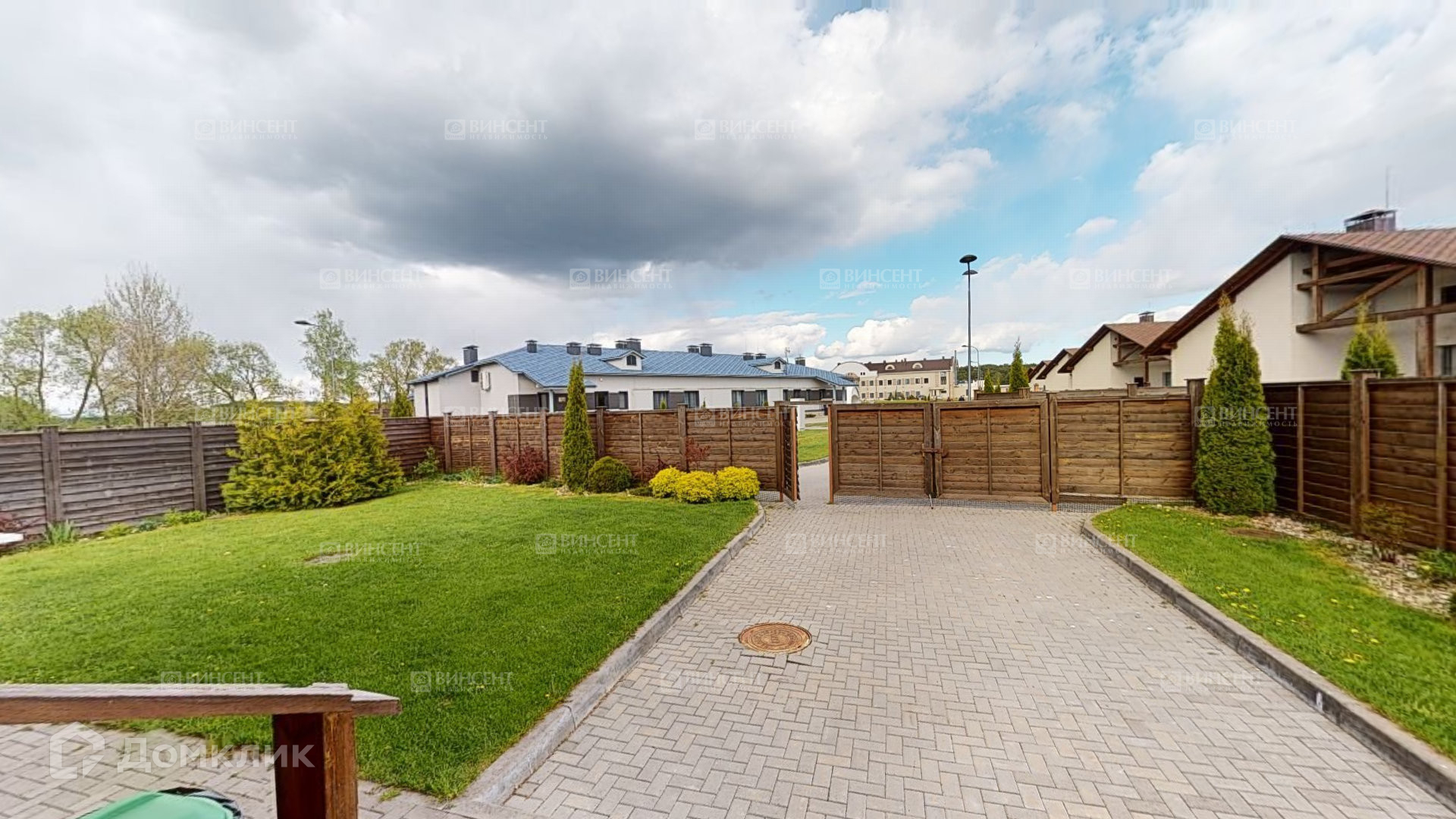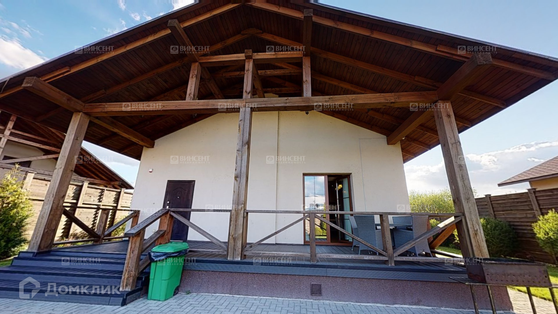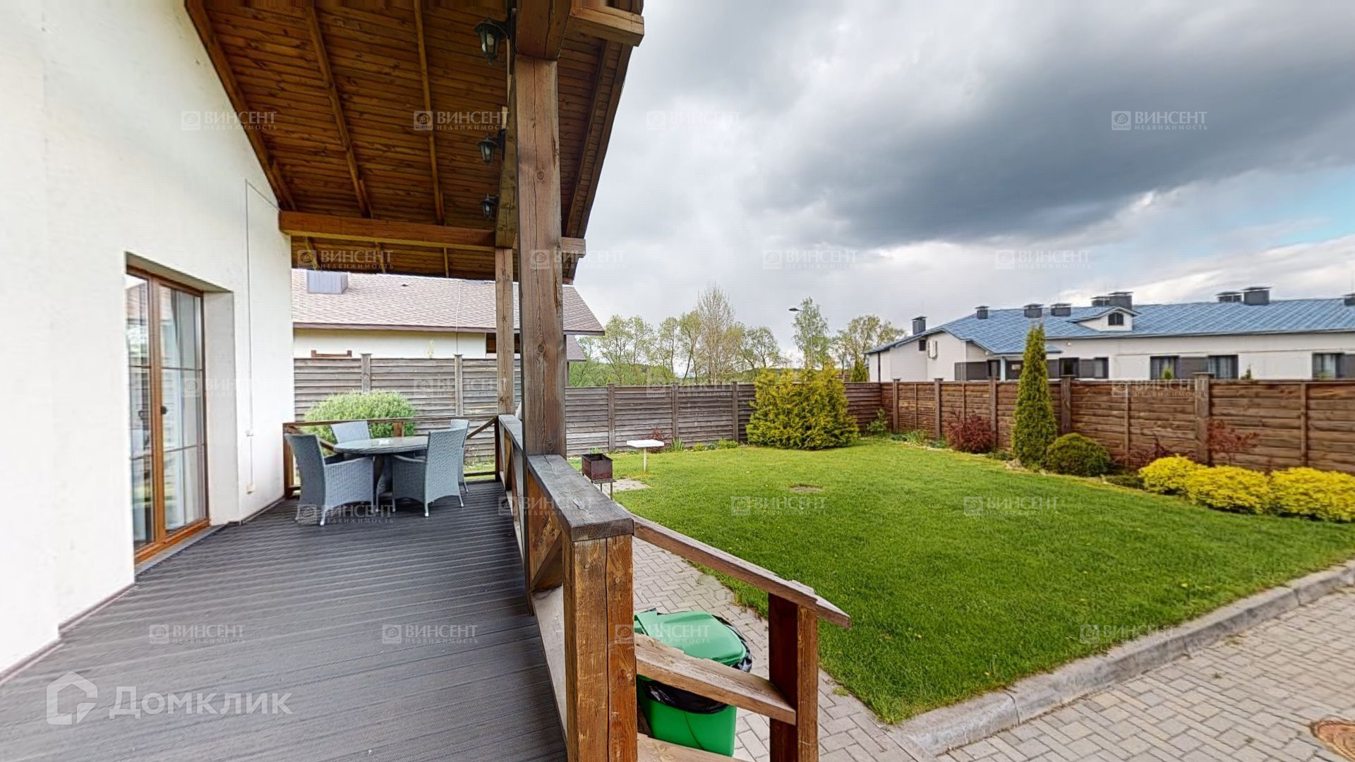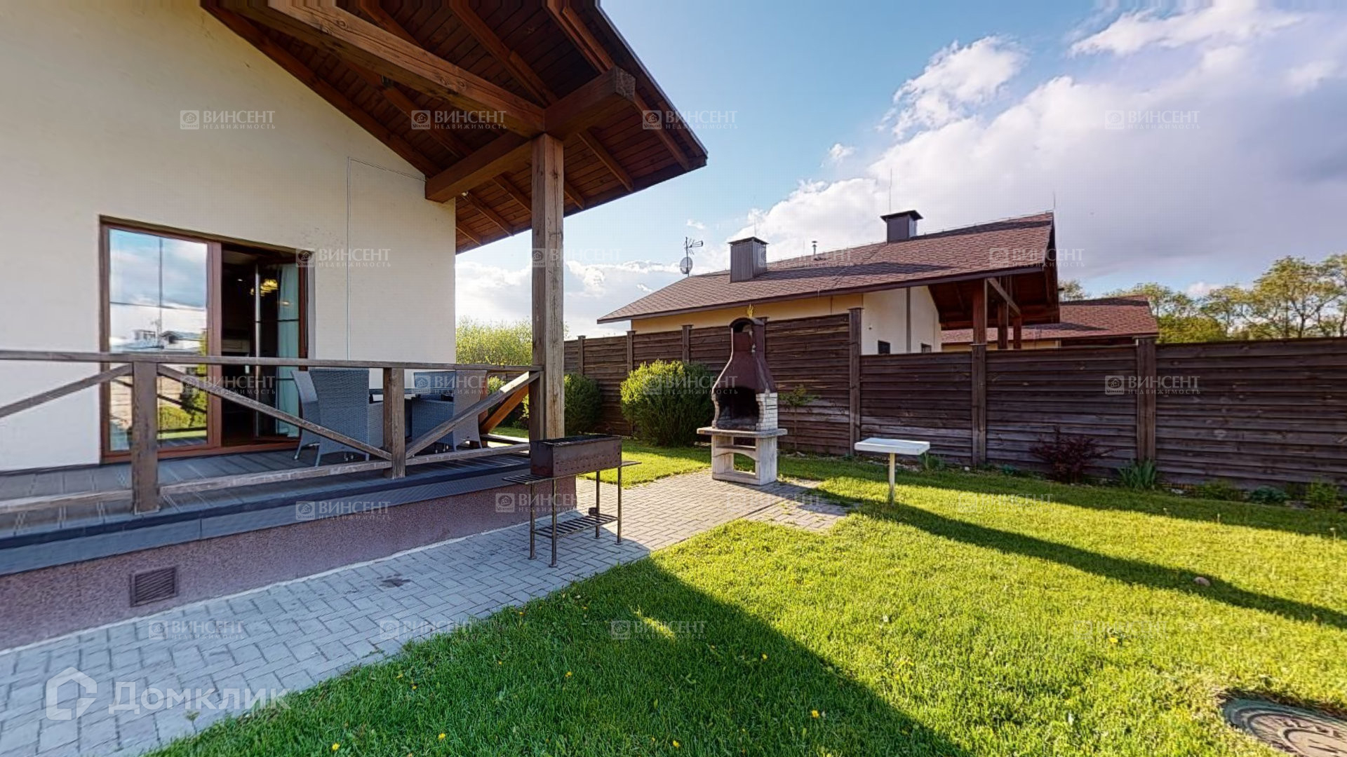Во дворе мангальная зона, зона отдыха, просторная территория с ландшафтным дизайном. Территория огорожена деревянным забором.