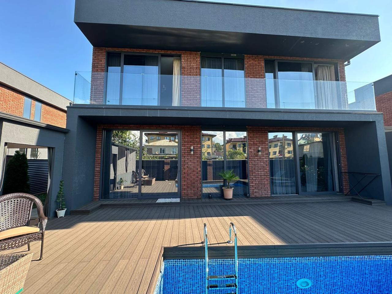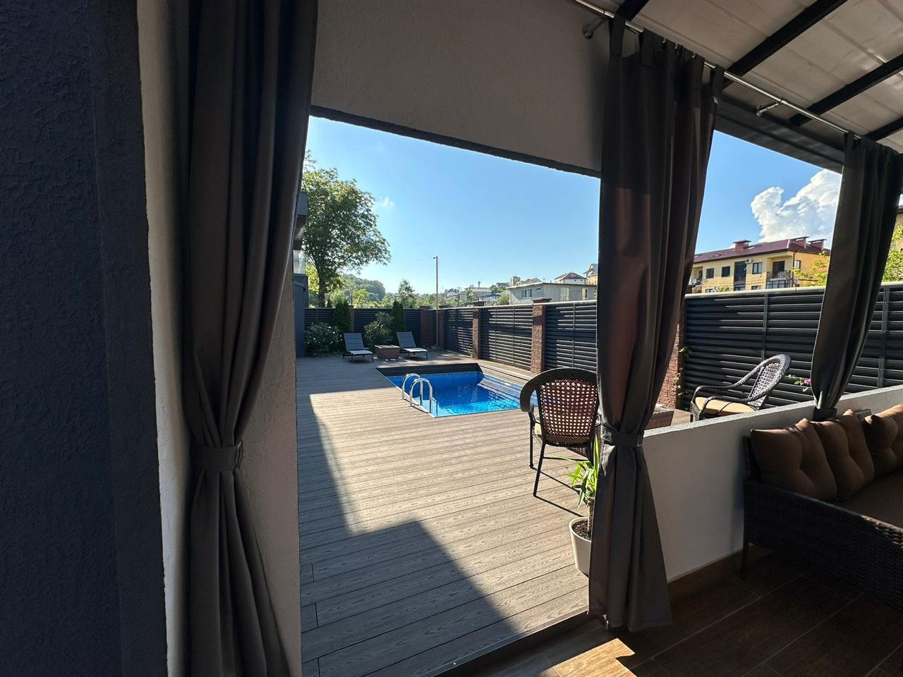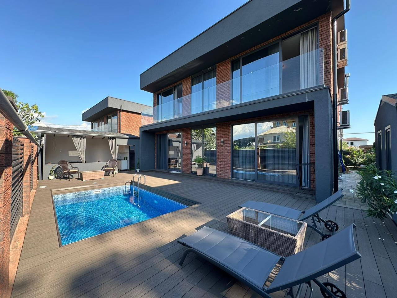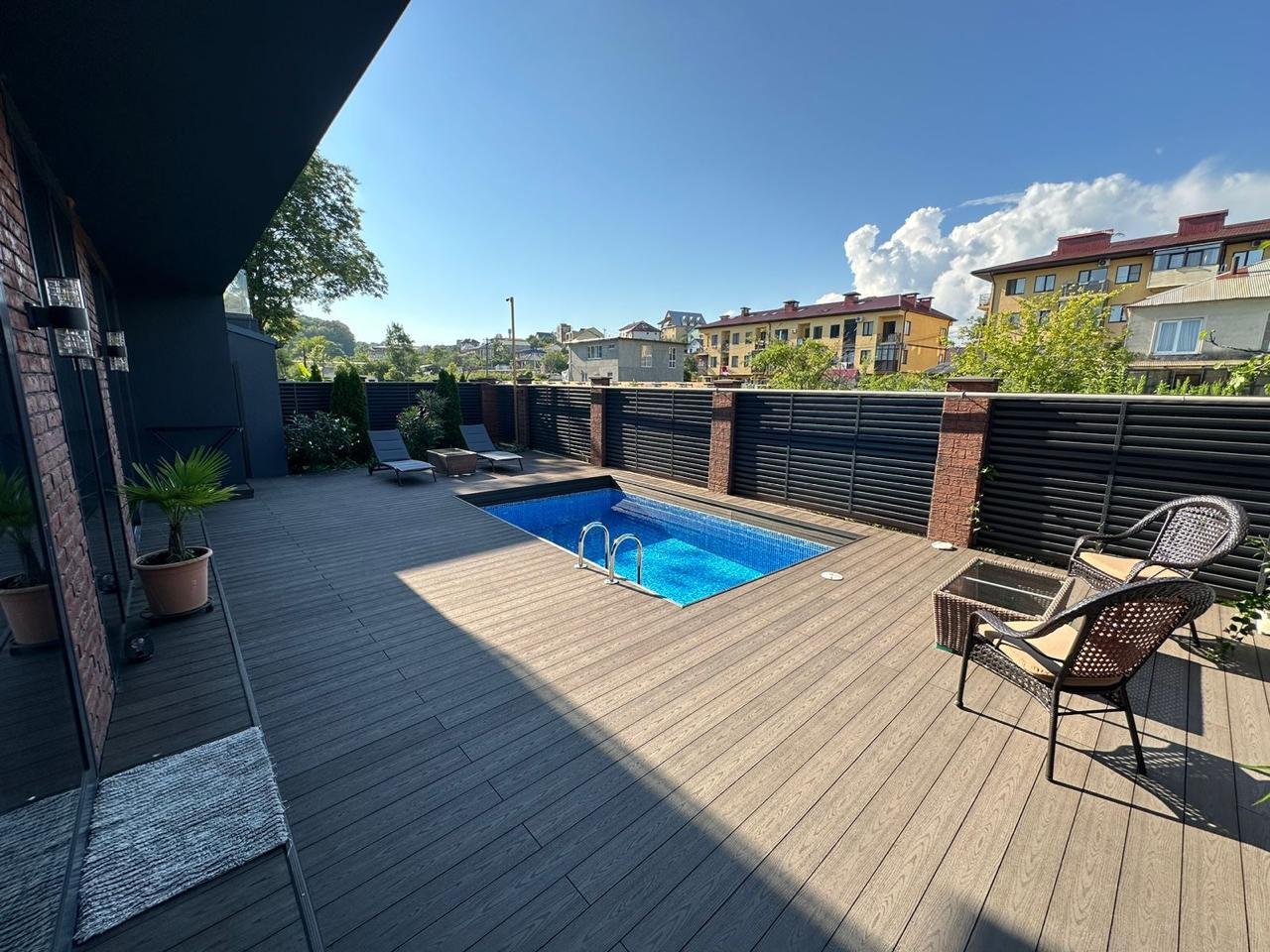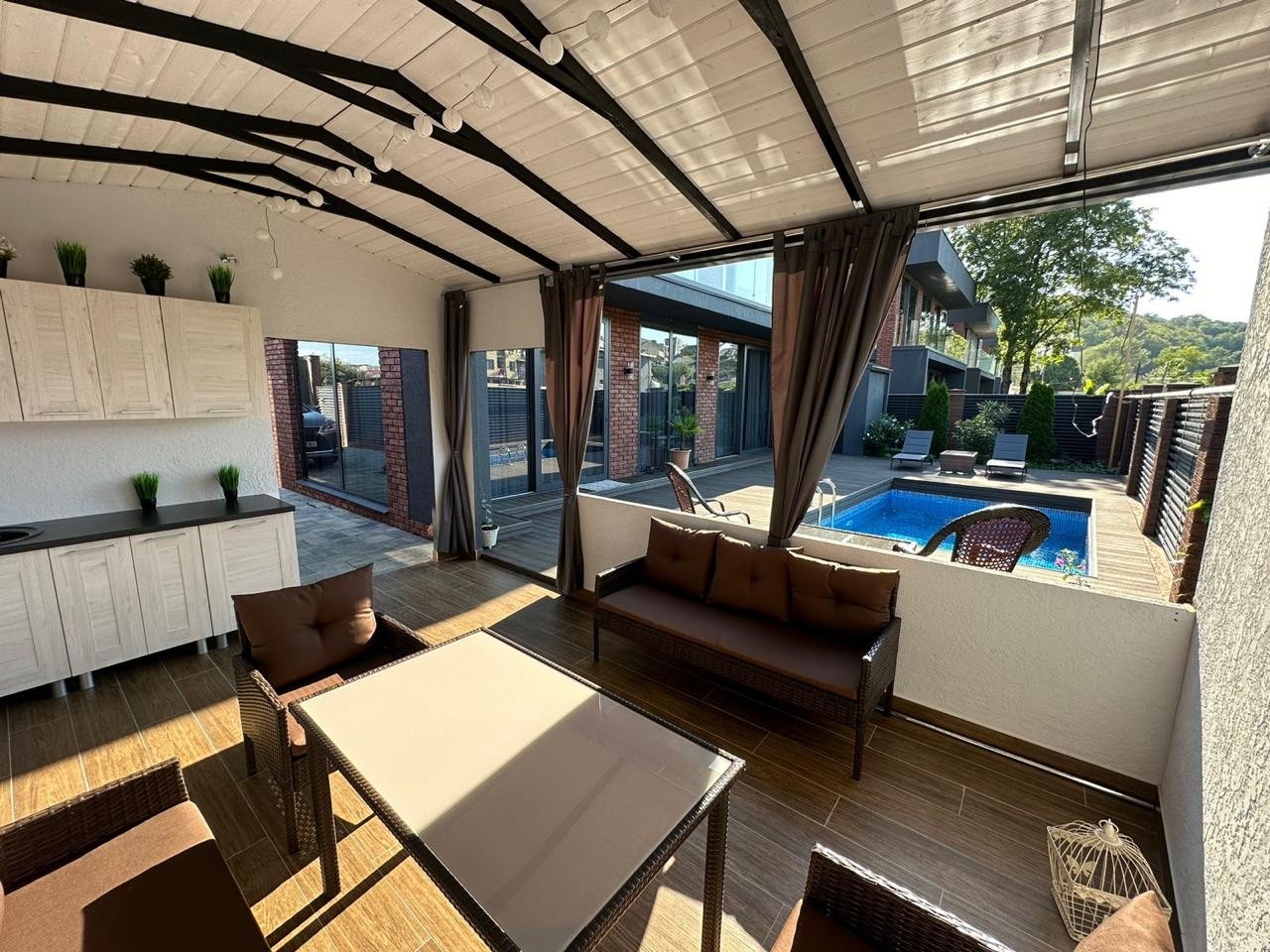 Терраса плавно переходит в ухоженный двор с бассейном.  Здесь можно наслаждаться солнечными днями или проводить вечера с друзьями.