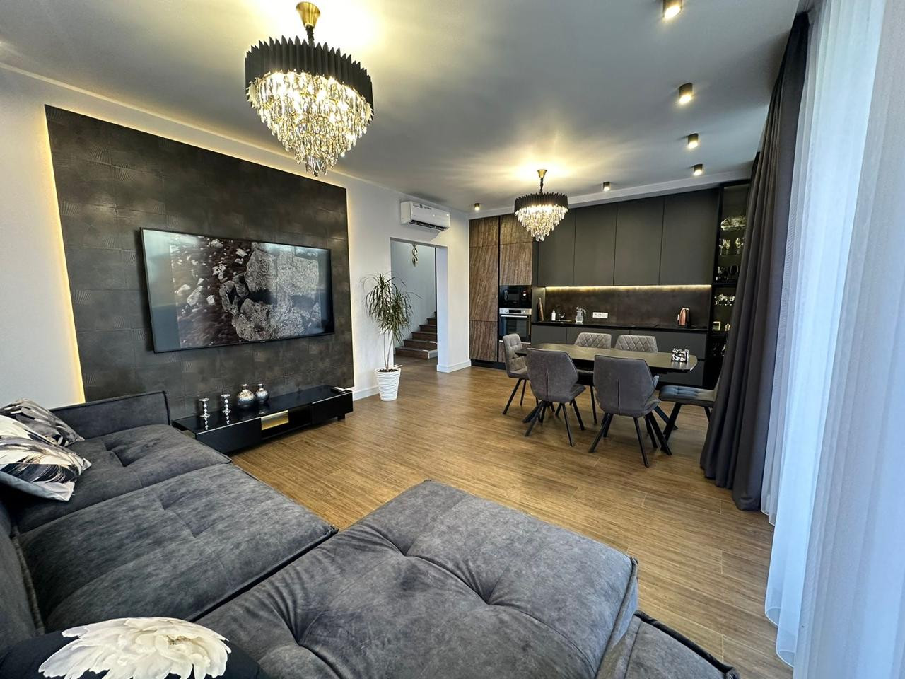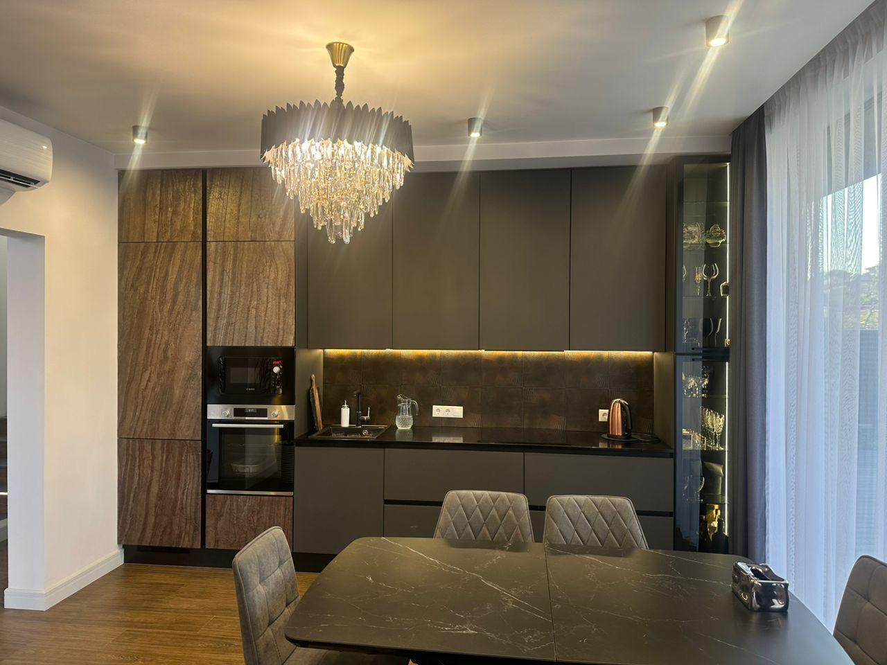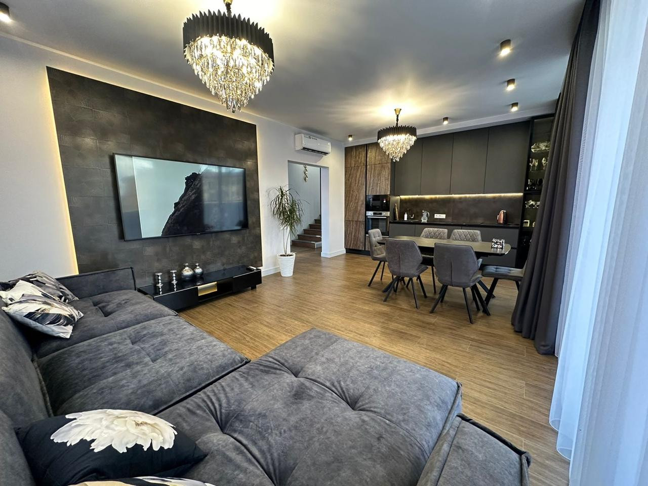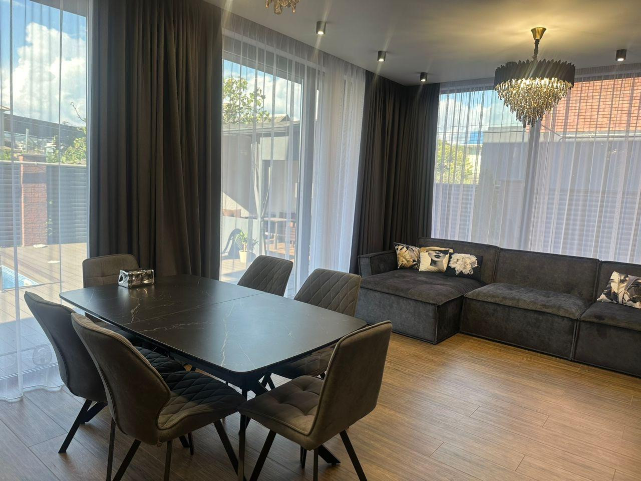 На первом этаже находится просторная кухня-гостиная, выполненная в современном стиле с высокими потолками и большими окнами, которые наполняют помещение естественным светом. Кухня оснащена дорогой бытовой техникой и изысканной мебелью, а уютная зона отдыха идеально подходит для приема гостей или семейных вечеров. Из гостиной есть выход на террасу, где расположена зона для барбекю и обеденная группа.