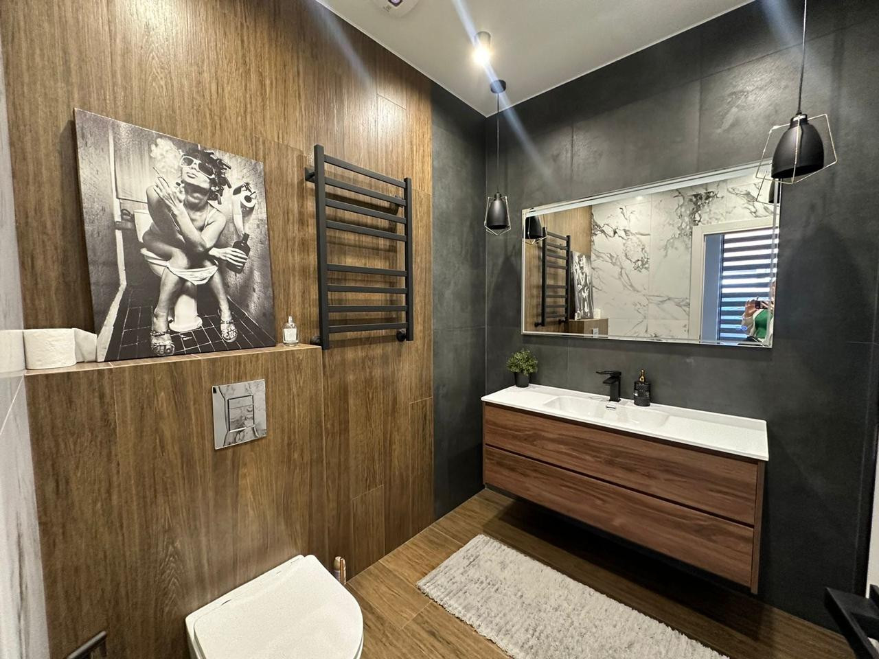 В закрытом коттеджном поселке, всего в пяти минутах от Сириуса, расположен стильный двухэтажный дом, который притягивает внимание своим элегантным дизайном и качественным ремонтом.