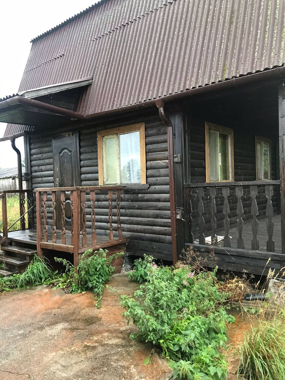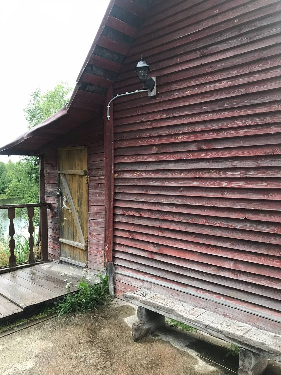 Возле дома и беседки земля залита бетоном, спуск к озеру проложен деревянными панелями (из-за травы это плохо видно на фото), мостик к сожалению затонул (вода на озере поднялась).