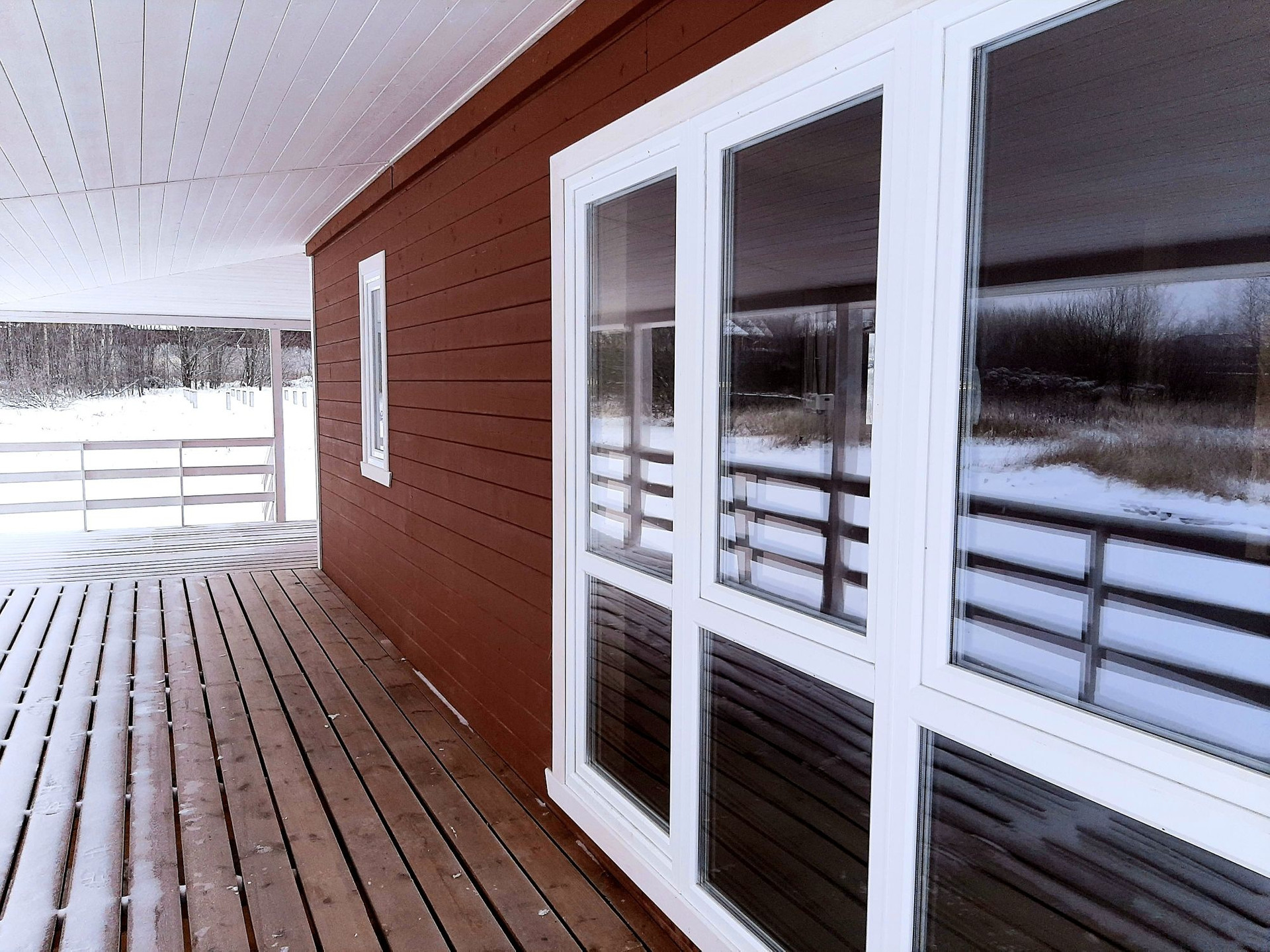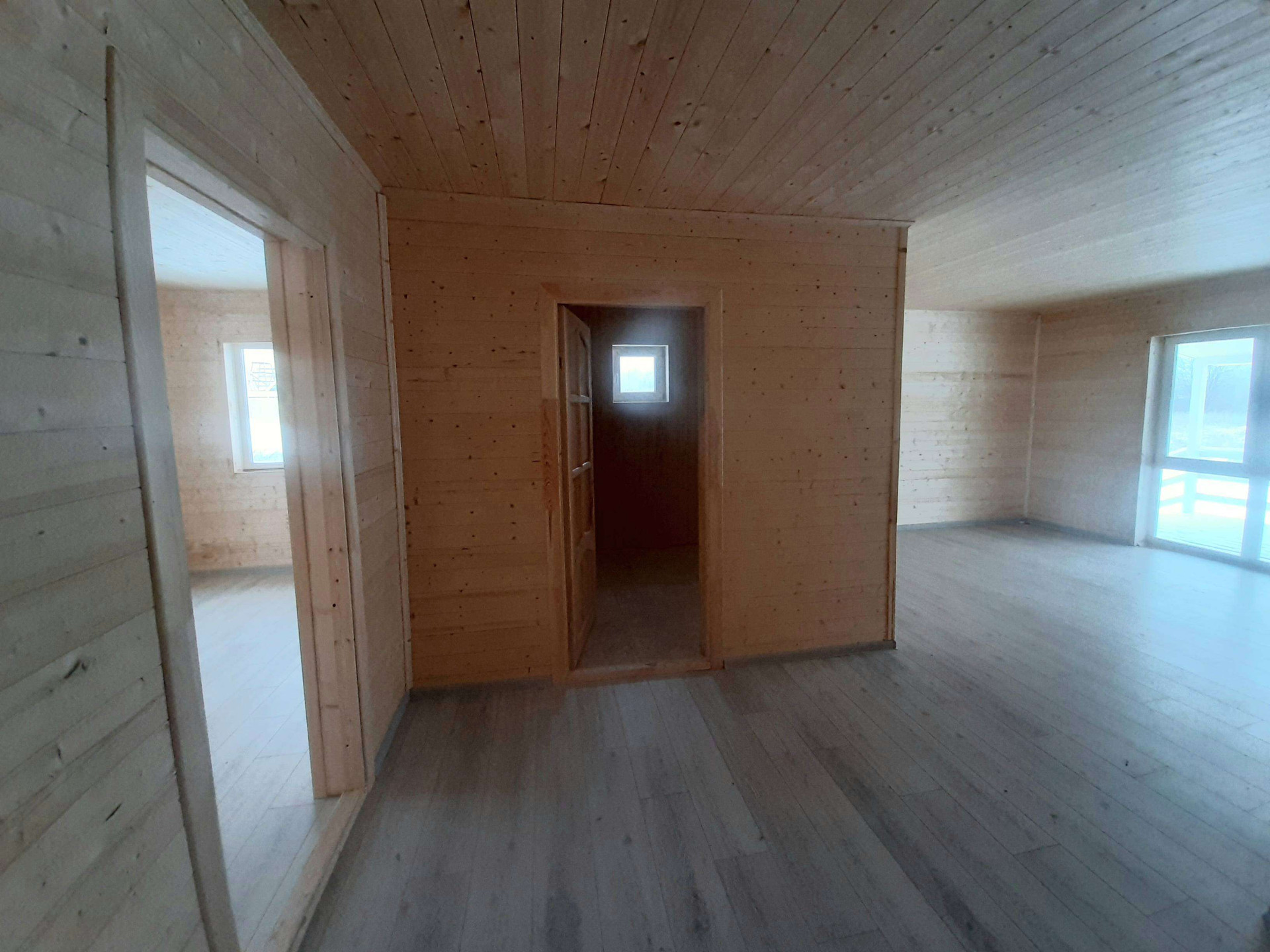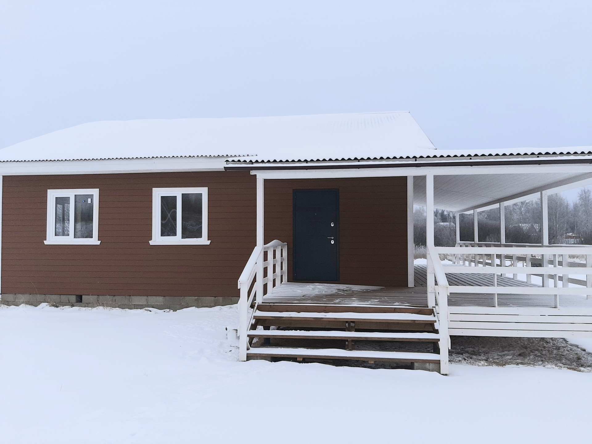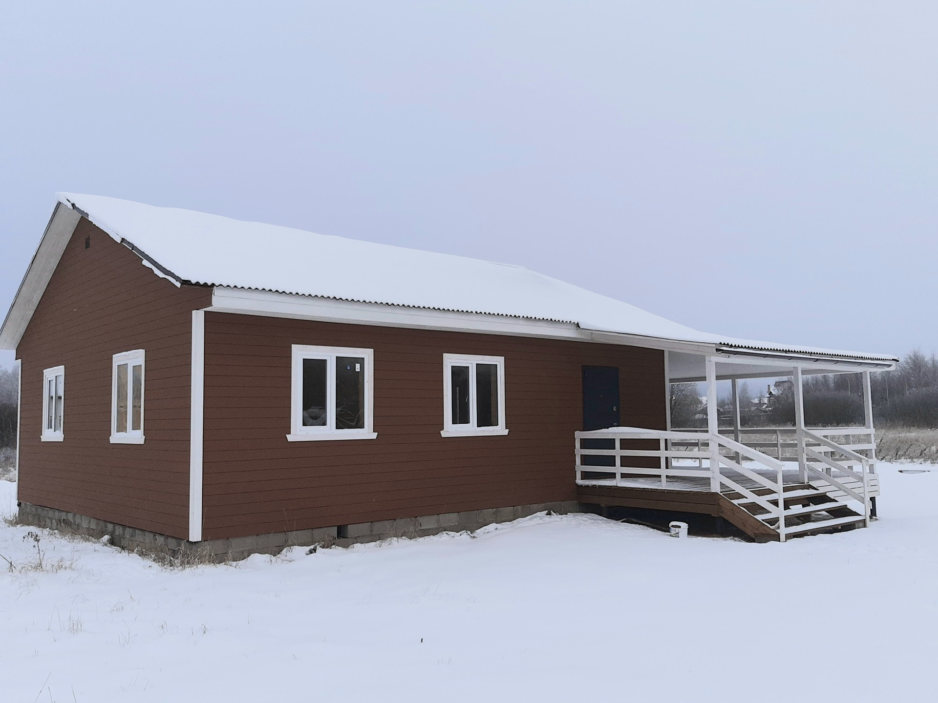 В доме удобная планировка: студия с панорамным окном (кухня-гостиная), 3 изолированные комнаты, санузел, закрытый тамбур и просторная угловая веранда