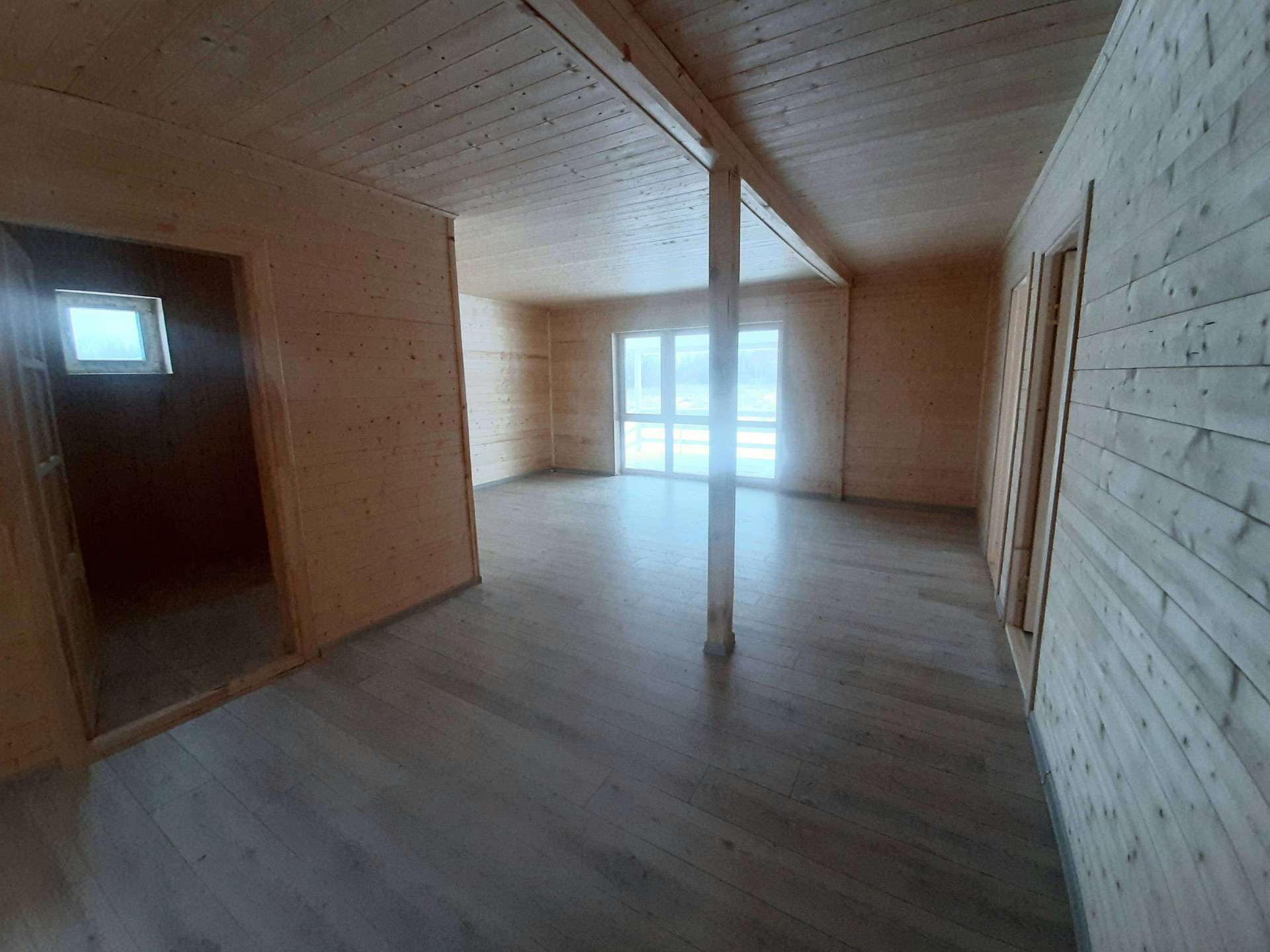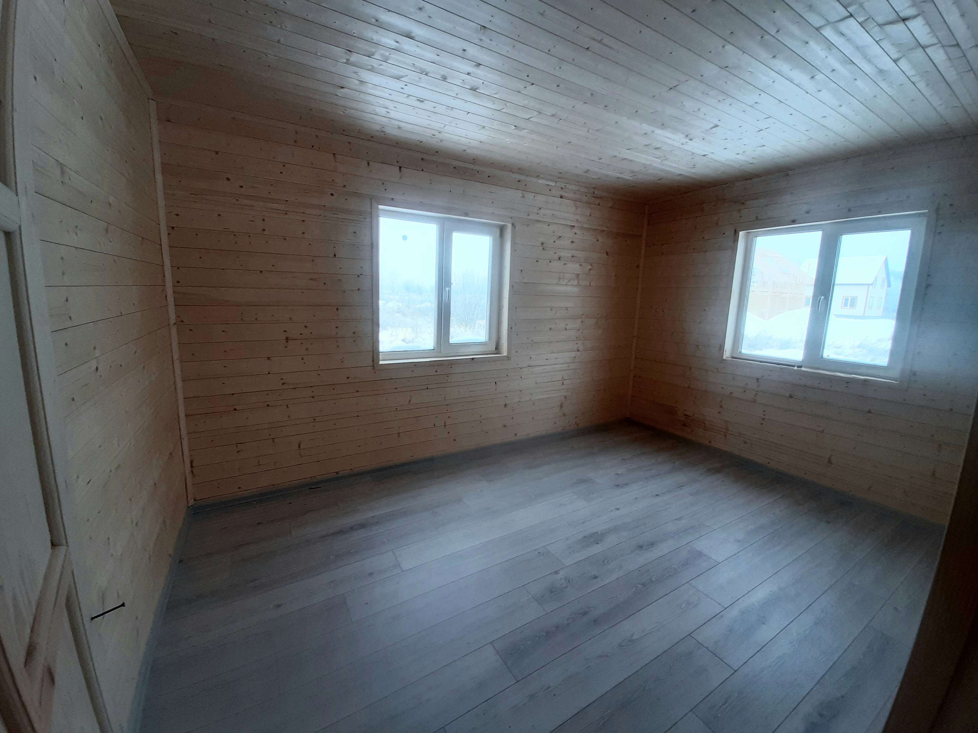 Утепление 150 мм. Стены дома внутри обшиты имитацией бруса, пол-ламинат, установлены двери.