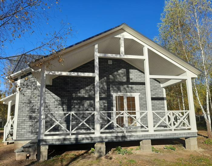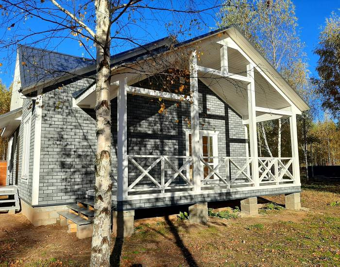 В доме функциональная планировка: крыльцо, тамбур, кухня-гостиная с выходом на просторную веранду, санузел, холл, три полноценные комнаты.