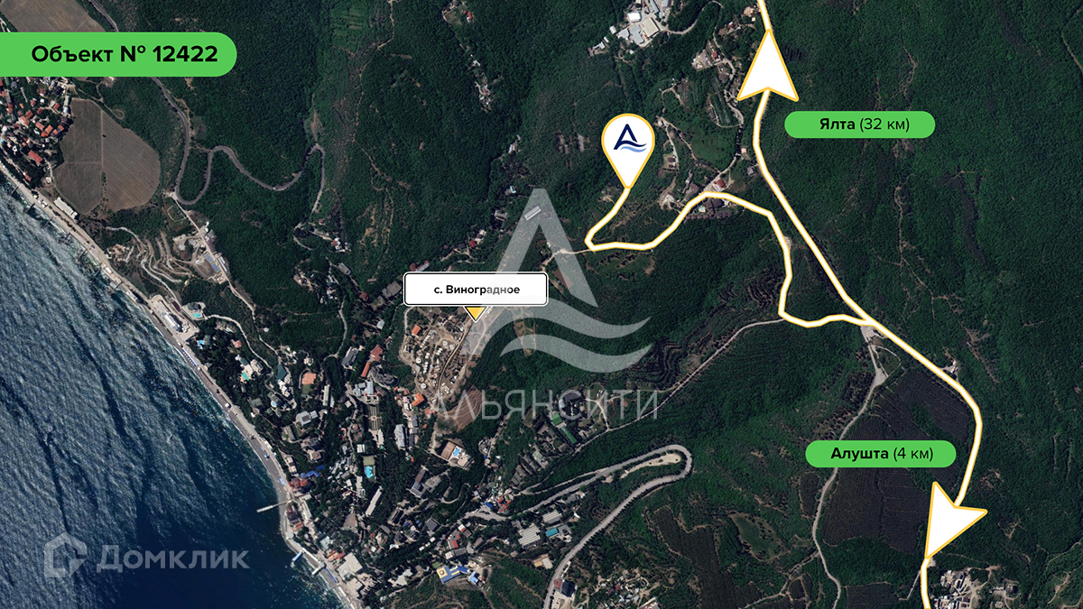Продается земельный участок в городе Алушта, село Виноградное, в районе Курортного клуба «Дачи». Общая площадь участка: 8.9 соток. Назначение: индивидуальное жилищное строительство.