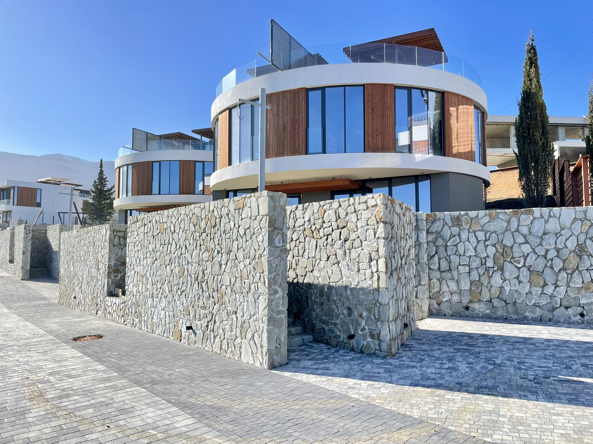 - Авторская архитектура. Футуристичный стиль: геометрические формы, панорамные окна, натуральные экологические материалы в отделке.