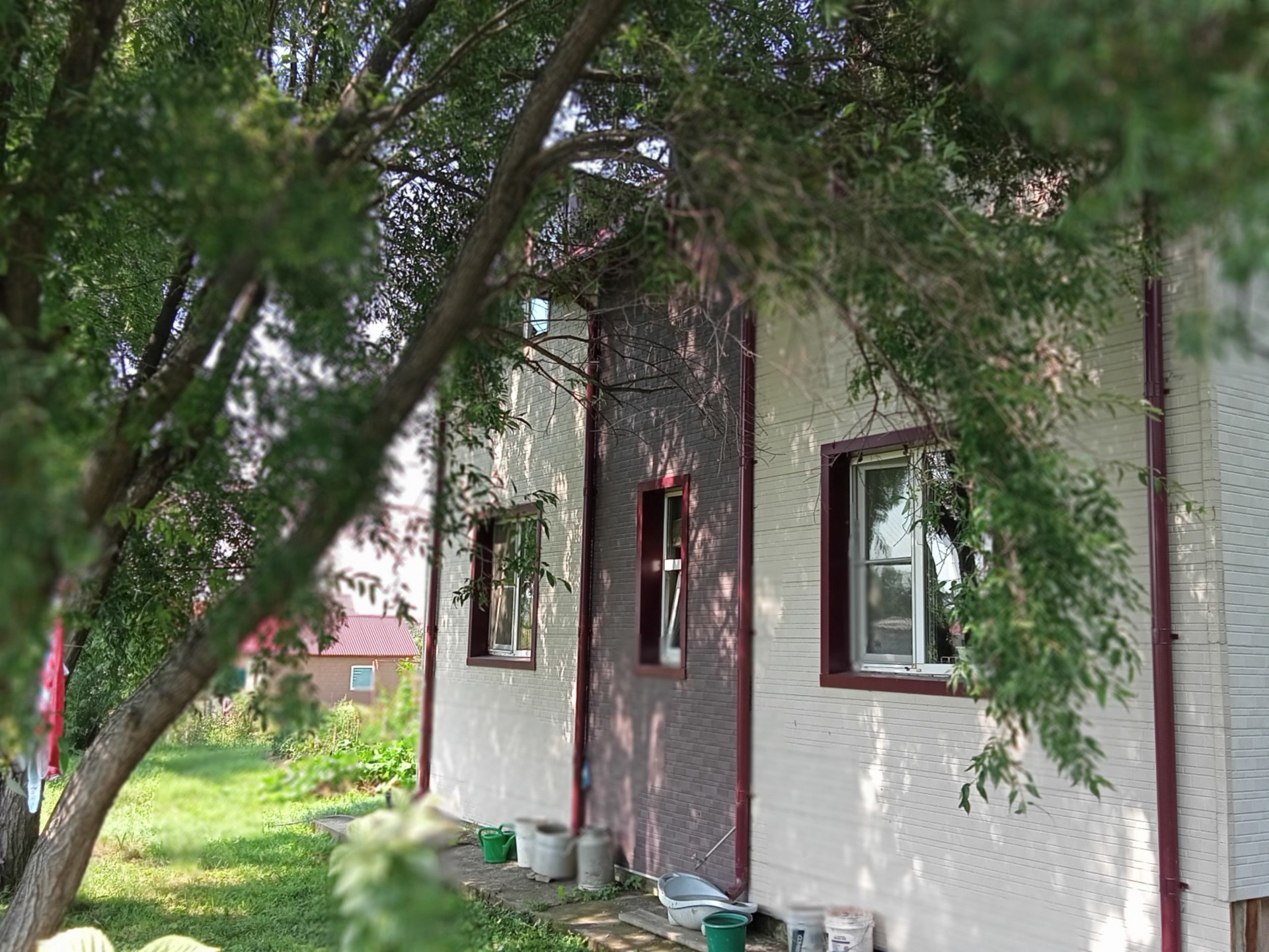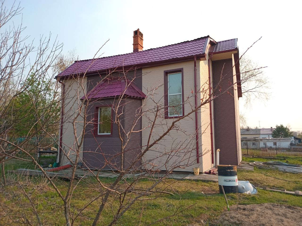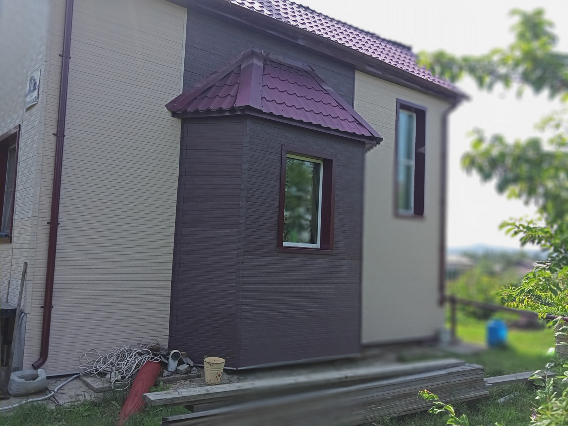 Расположен вдали от трассы. Переулок с фасадной стороны дома тупиковый, так что машины перед домом не ездят, очень тихое и спокойное место, интеллигентные соседи. В огороде часто видим фазанов. Снаружи утеплен на 150мм и отделан вентфасадом Ханьи. Вентилируемая кровля из металлочерепицы, подшивка, водостоки. Теплый пол по всему первому этажу, кроме одной комнаты. По проекту должно быть 2 балкона, но они не достроены. Не достроены крыльцо и подвал. Частичная внутренняя отделка. Фундамент - буронабивные сваи и ростверк.