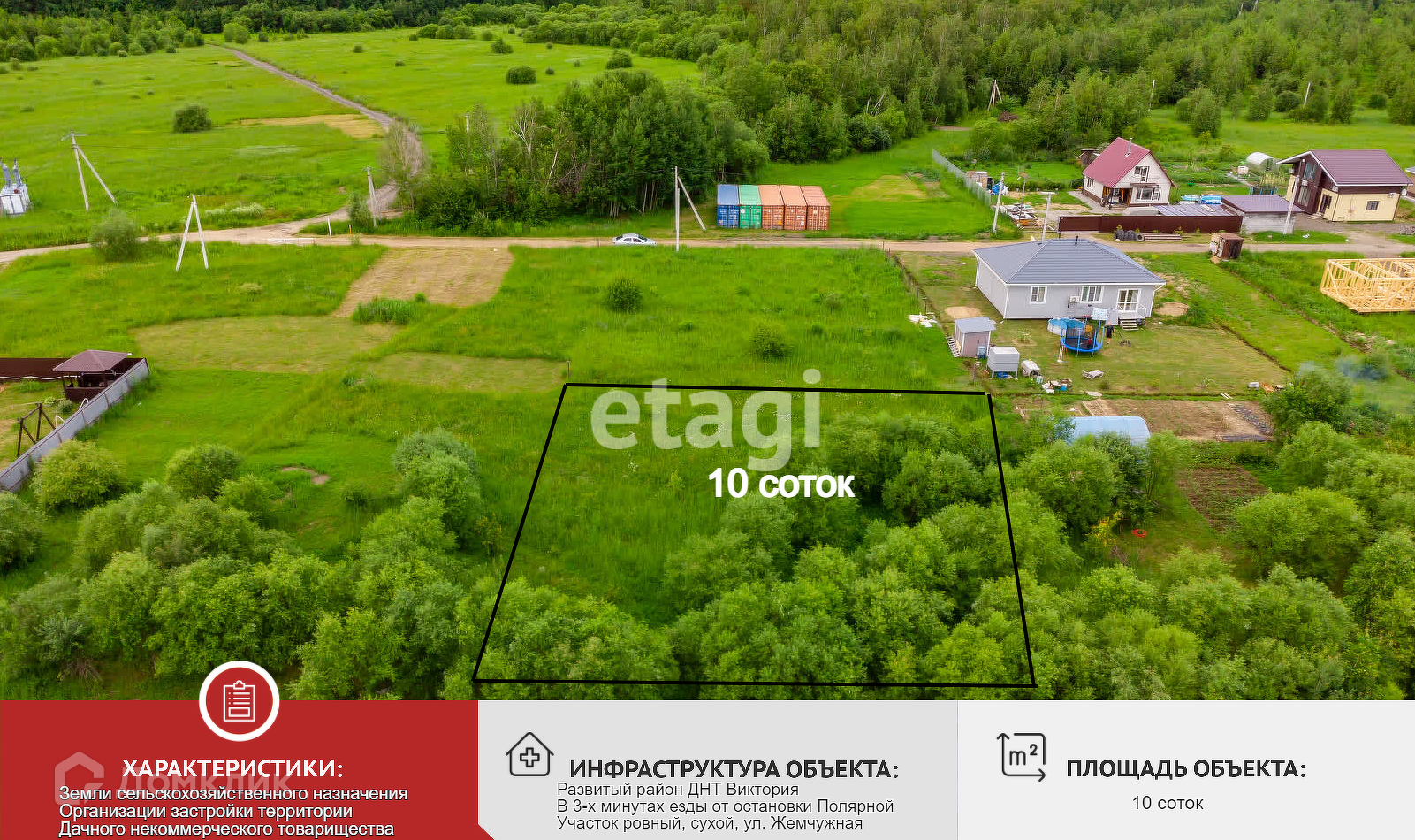 Продам земельный участок 10 соток в коттеджном поселке в ДНТ Виктория, в 5 километрах от остановки Полярная. Закрытая территория коттеджного поселка. Автоматические откатные ворота, видеонаблюдение. Район грушевых садов. Участки ровные, электричество 380в - 15кВт, Хорошие подъездные пути. Ведется активная жилая застройка - строятся коттеджи и целые усадьбы. Сельская прописка и сельские тарифы на электричество. Упрощенная система постановки на кадастровый учет жилого дома.