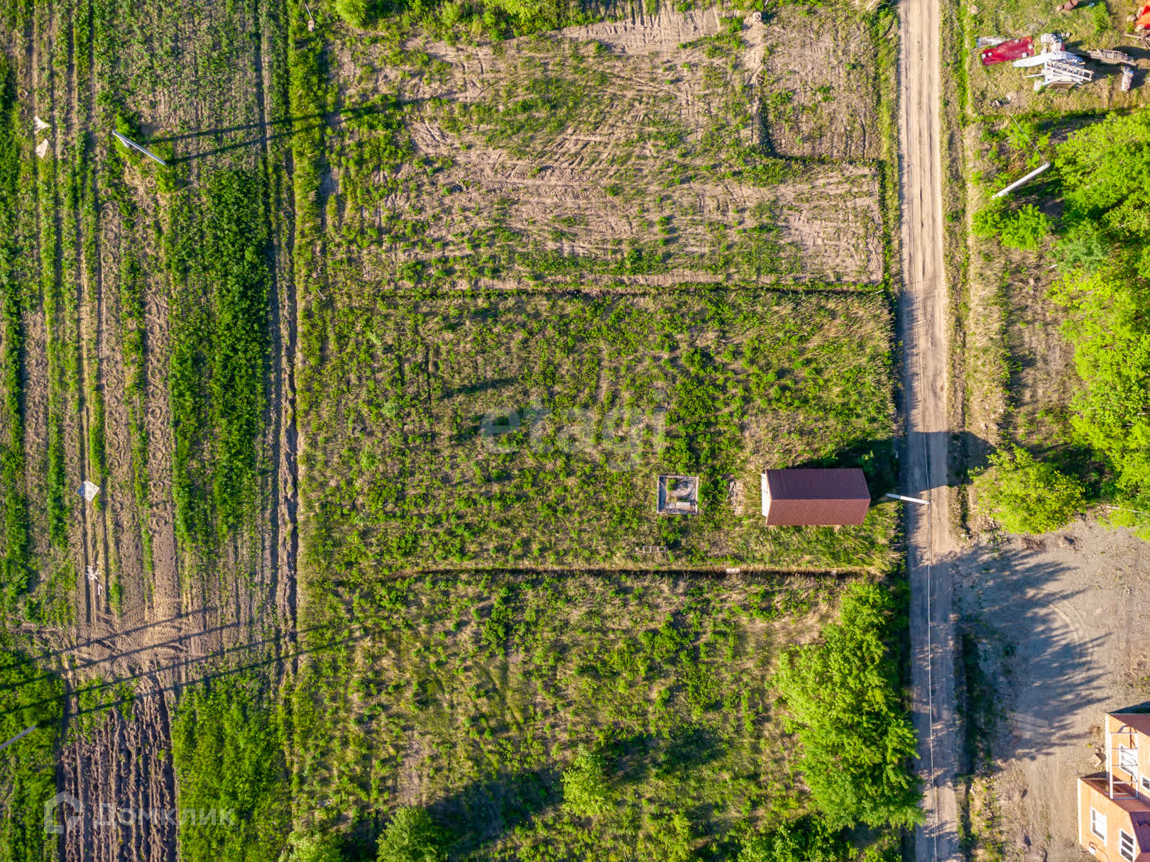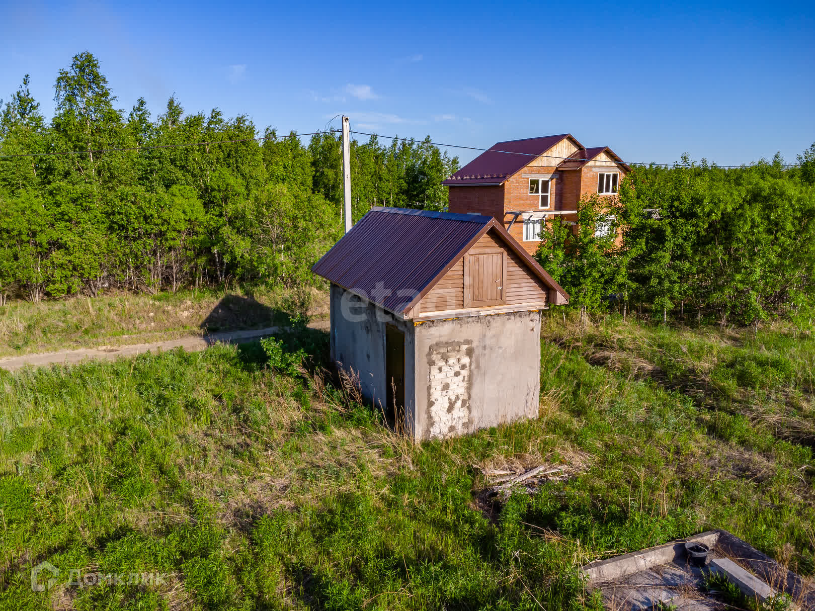 В левой части участка расположено бетонное здание площадью 18,7 кв. м (на кадастровом учете не значится). Участок электрифицирован. На участке располагается столб, на здании закреплен щиток (220 В). Строение возведено из бетонной утепленной секции. Смонтирована крыша с кровлей, утеплено и гидроизолировано перекрытие.