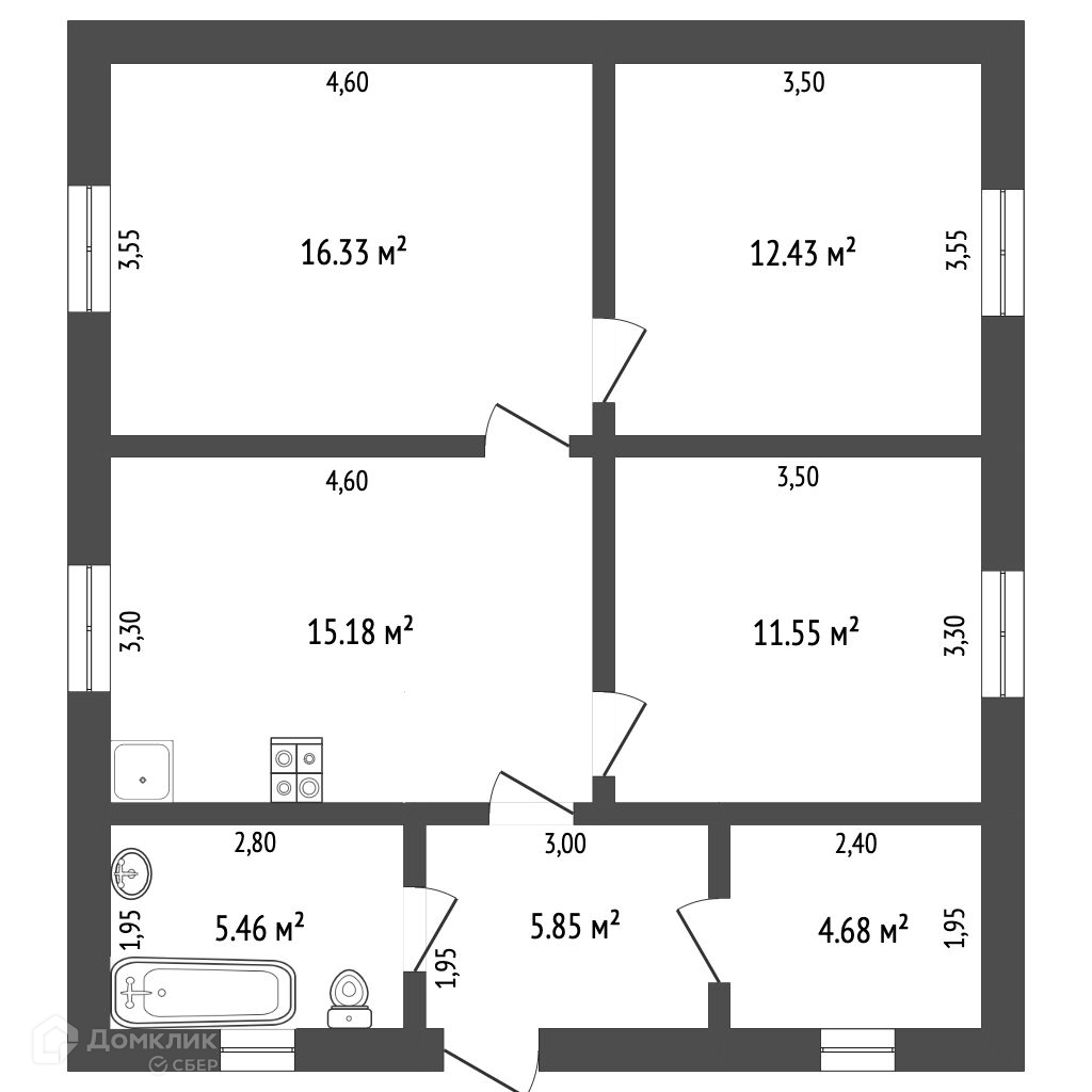Кухня гостинная 15,2м2, три комнаты 16,3, 12,4 и 11,5м2, холл 5,8м2, санузел 5,7м2, гардеробная 4,7м2.
