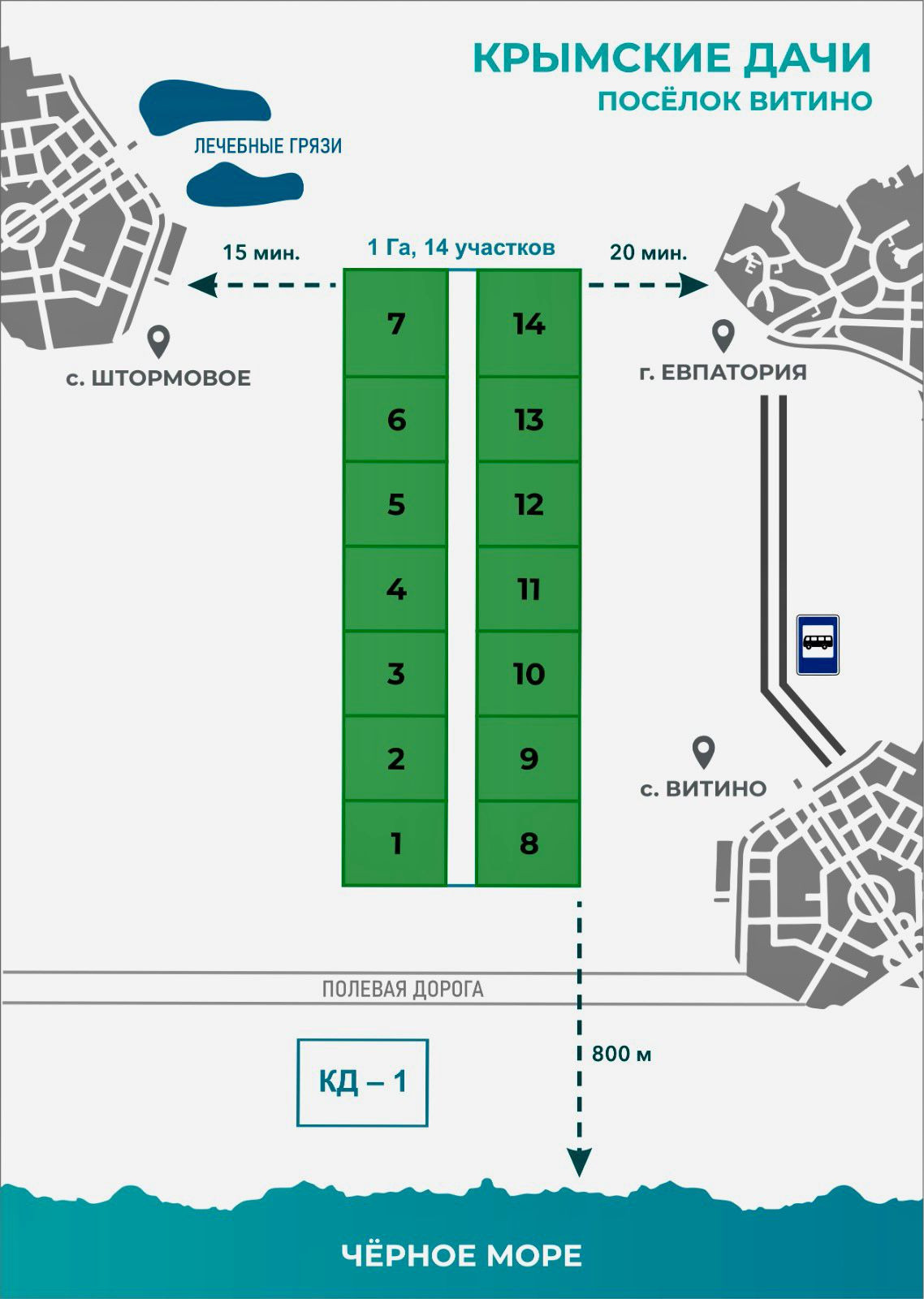 Земельные участки, с видом разрешённого использования ЛПХ, площадью от 600 до 800 квм, 1500 метров от уреза Черного моря. Участки расположены в пригороде г.Евпатория, с. Витино. Инфраструктура: автовокзал, детский сад, школа, магазины, городской пляж.    ЛОТ 1, № 13