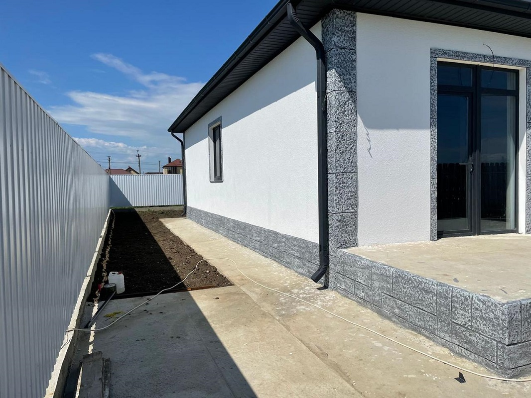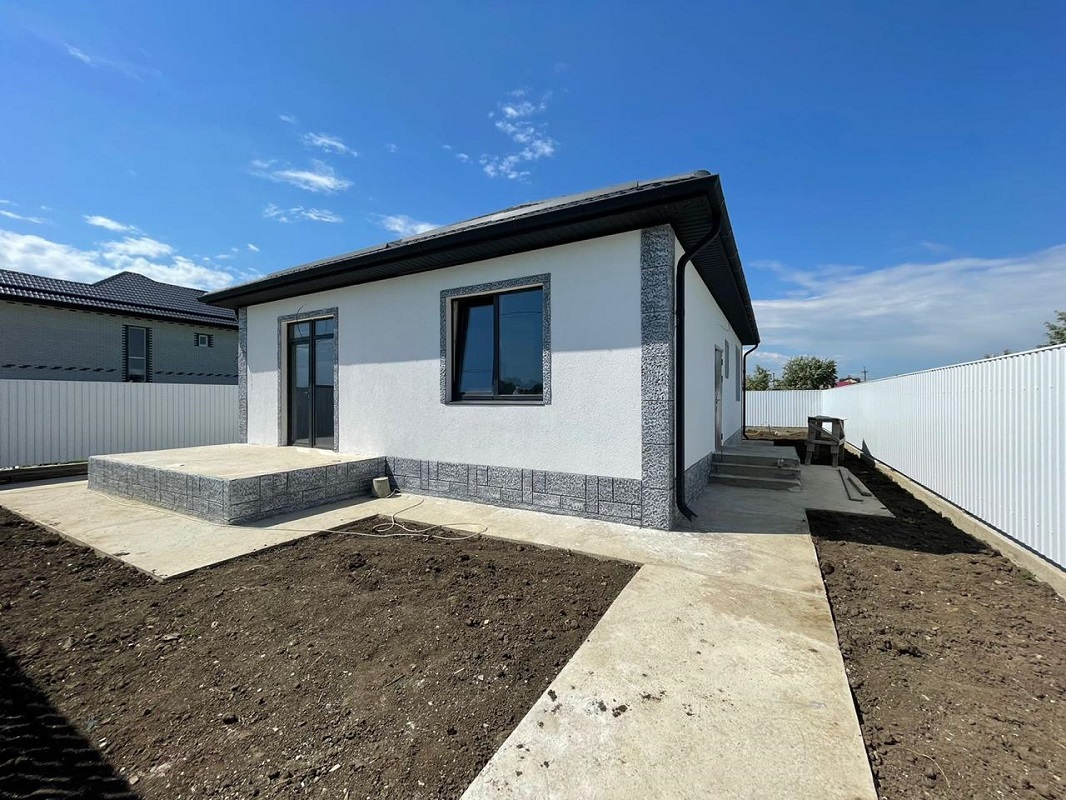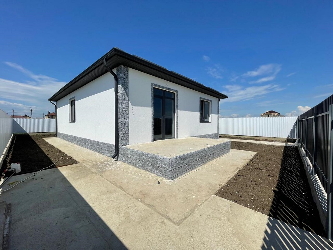 ID 5440    В курортном посёлке Витязево в продаже новый дом 106 м2 на участке ИЖС 4 сотки земли. Построен из керамзитового блока, утеплен 50 мм, отделка фасада декоративная штукатурка Шуба. Внутри качественная пред чистовая отделка, по всему дому разведена электропроводка, стяжка пола, теплый пол, штукатурка. В доме три спальни, кухня-гостиная с выходом на террасу, санузел. Участок ровный, правильной формы, фасад 15 м. По периметру огорожен забором из металлопрофиля, фасад - евроштакетник. Земля и дом стоят на кадастровом учете, подходит в ипотеку.