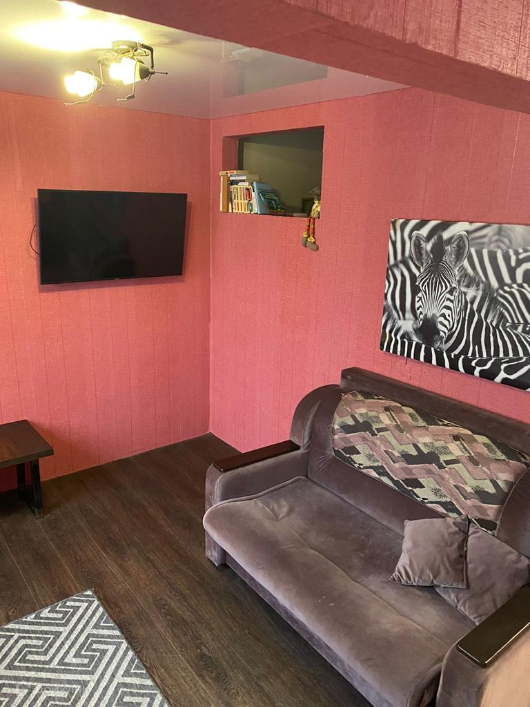 Полноценная евро двухкомнатная квартира: кухня объединена с залом, спальня отдельно, санузел совмещен в бывшем ведомственном доме для сотрудников аэропорта (после приватизации оформлена в собственность)
