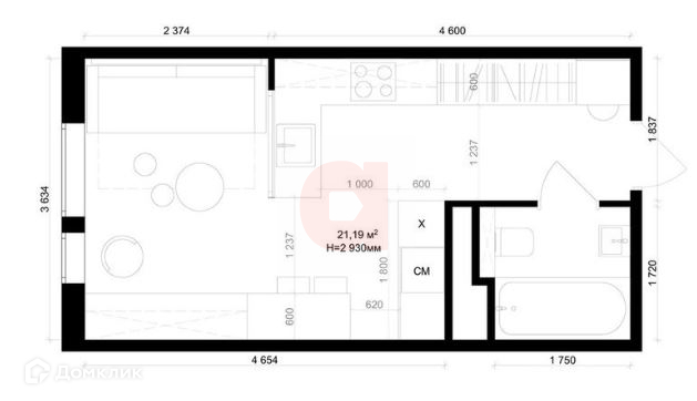Общая площадь 21.5 м2