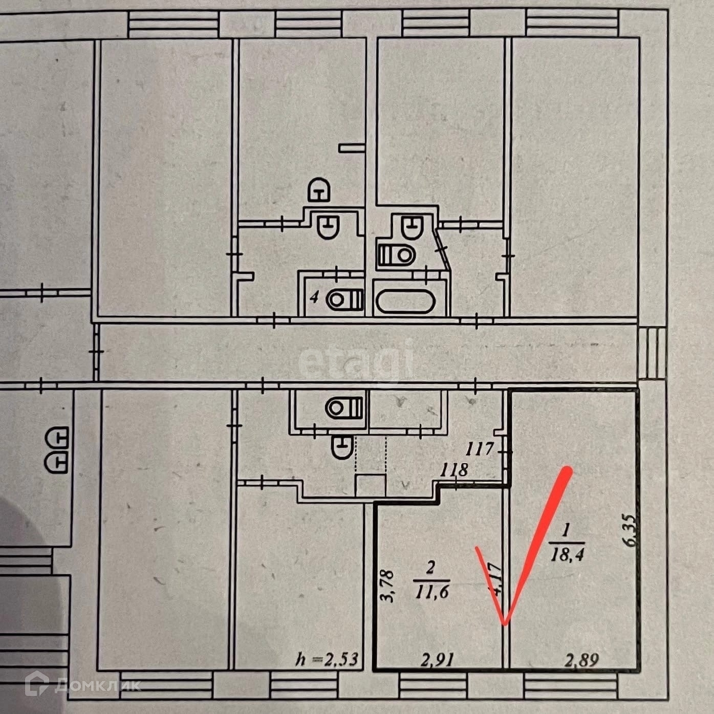 Кирпичный дом. Общая площадь 30 м2. Находятся в секции из 4 комнат. Санузел раздельный (находится в части соседей, но есть возможность поставить свой и полностью отделиться от соседей).