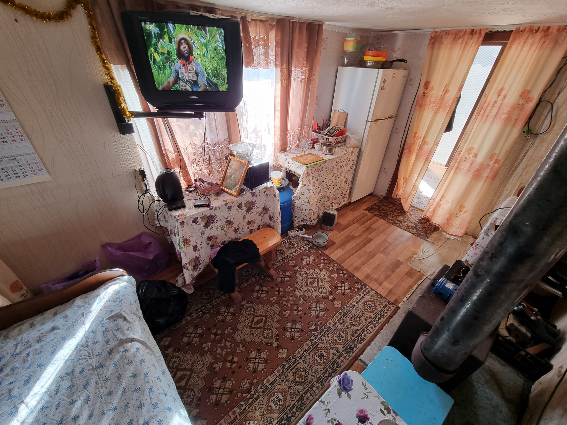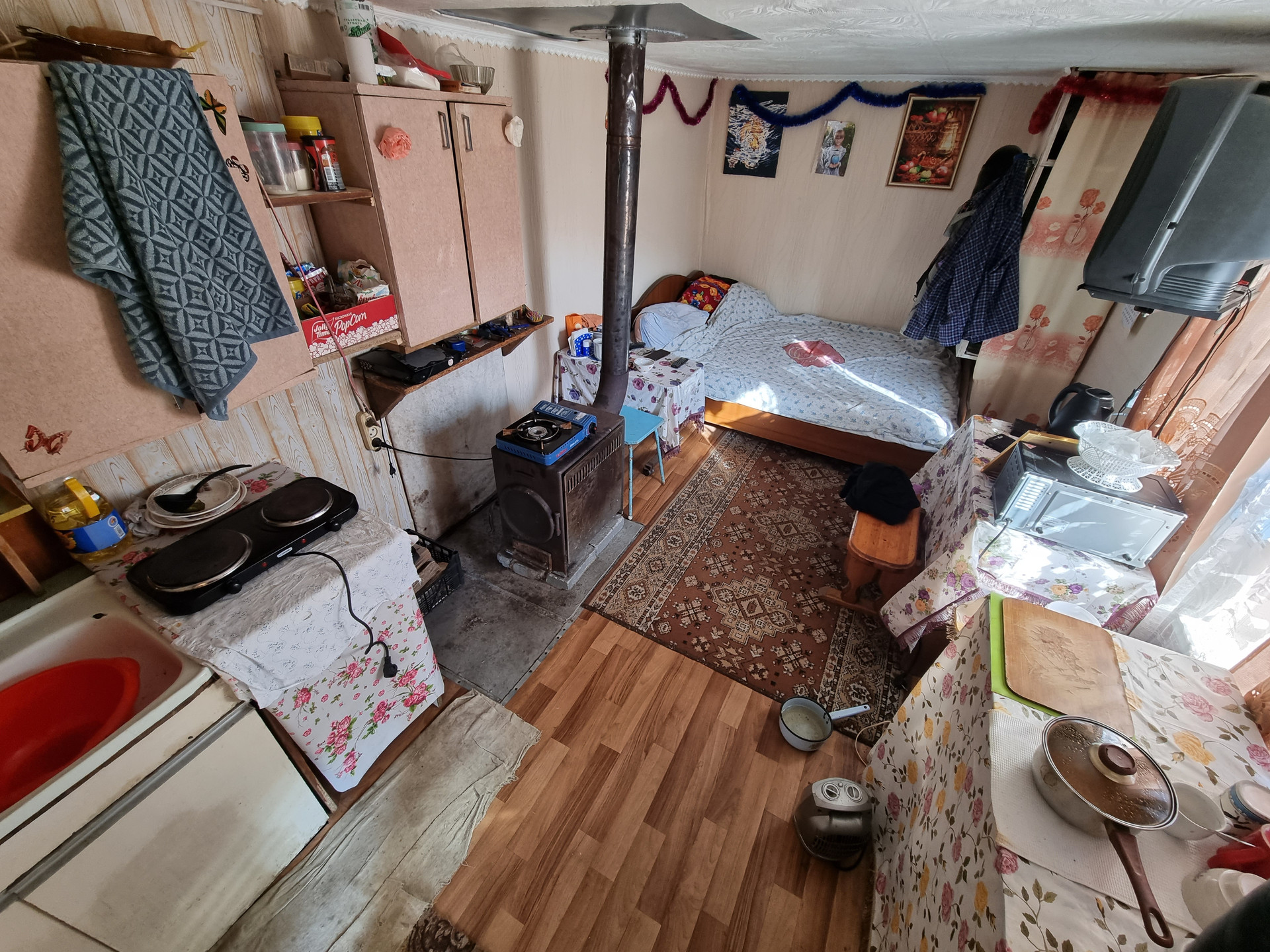 Домик не большой, каркасного типа, очень тёплый, слив выведен из дома.