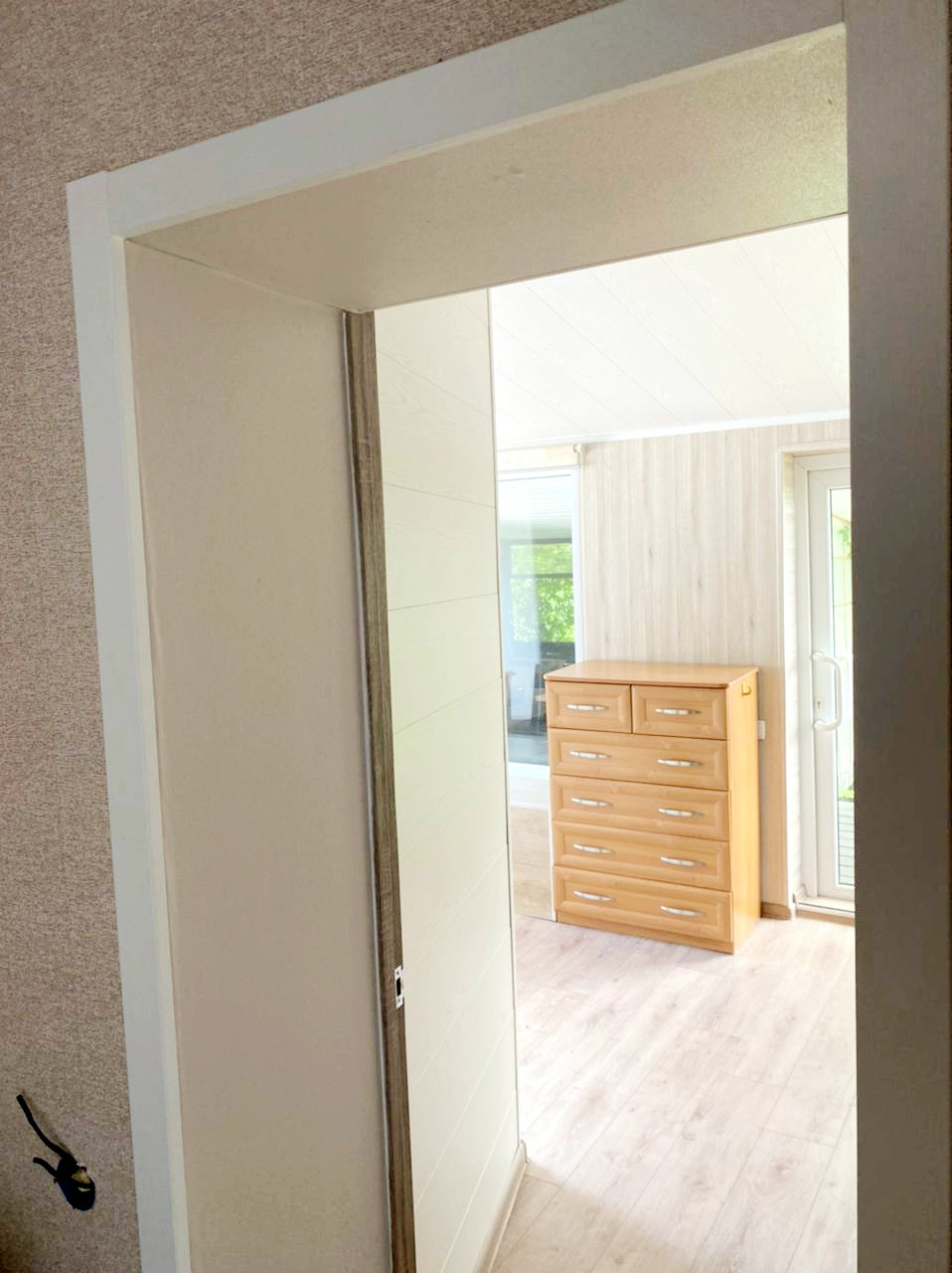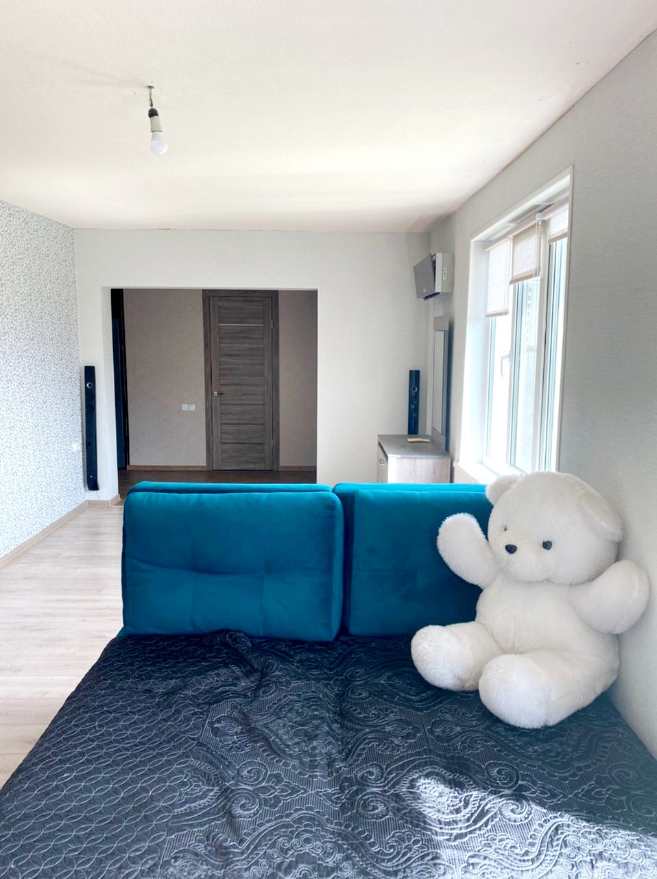 Функциональная планировка дома: три просторные комнаты, одна из них используется как гардеробная, просторная гостиная, большая кухня, санузел совмещенный, прихожая, просторная терраса.