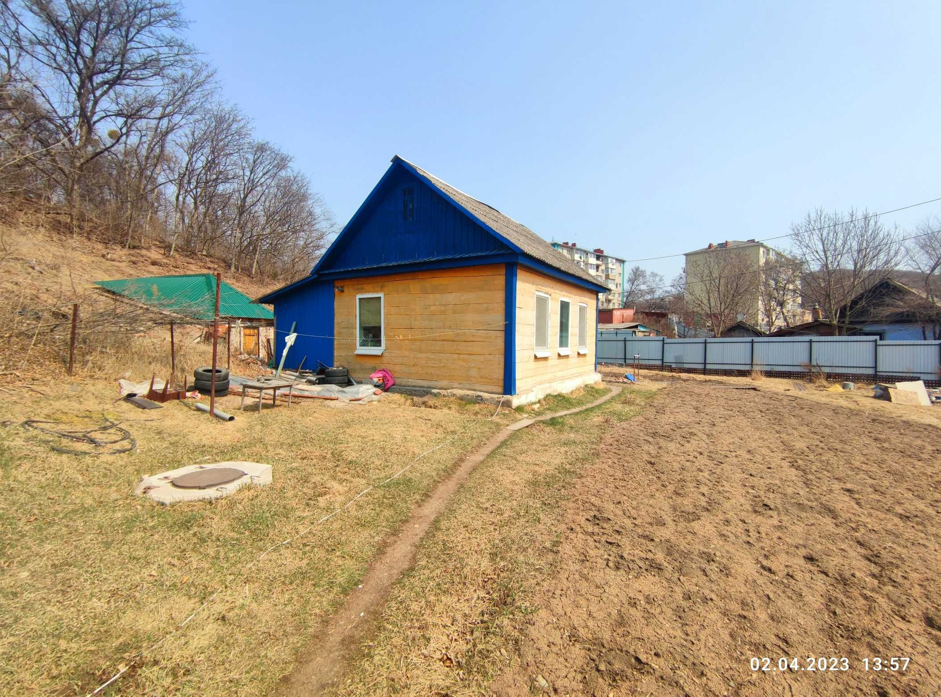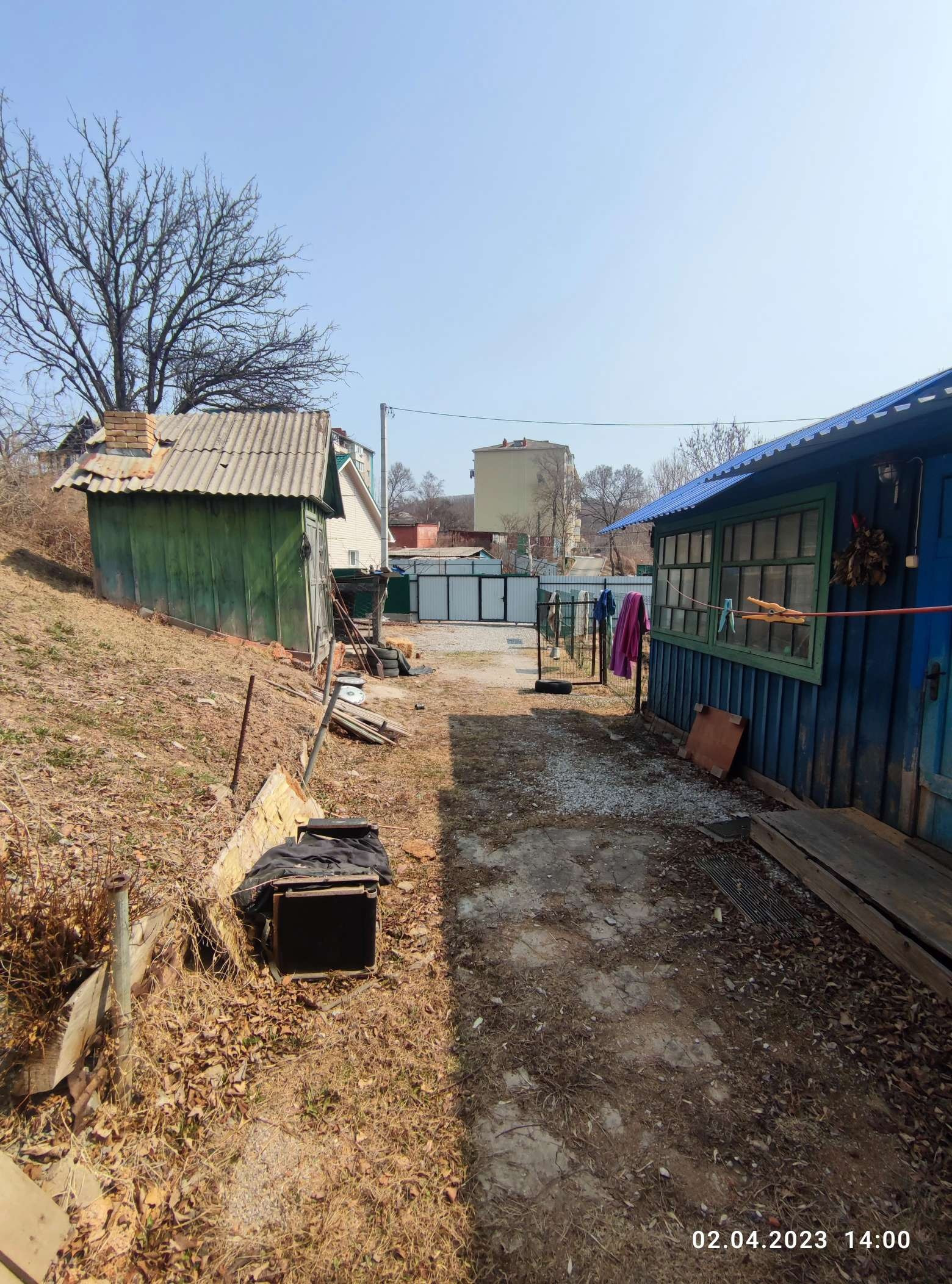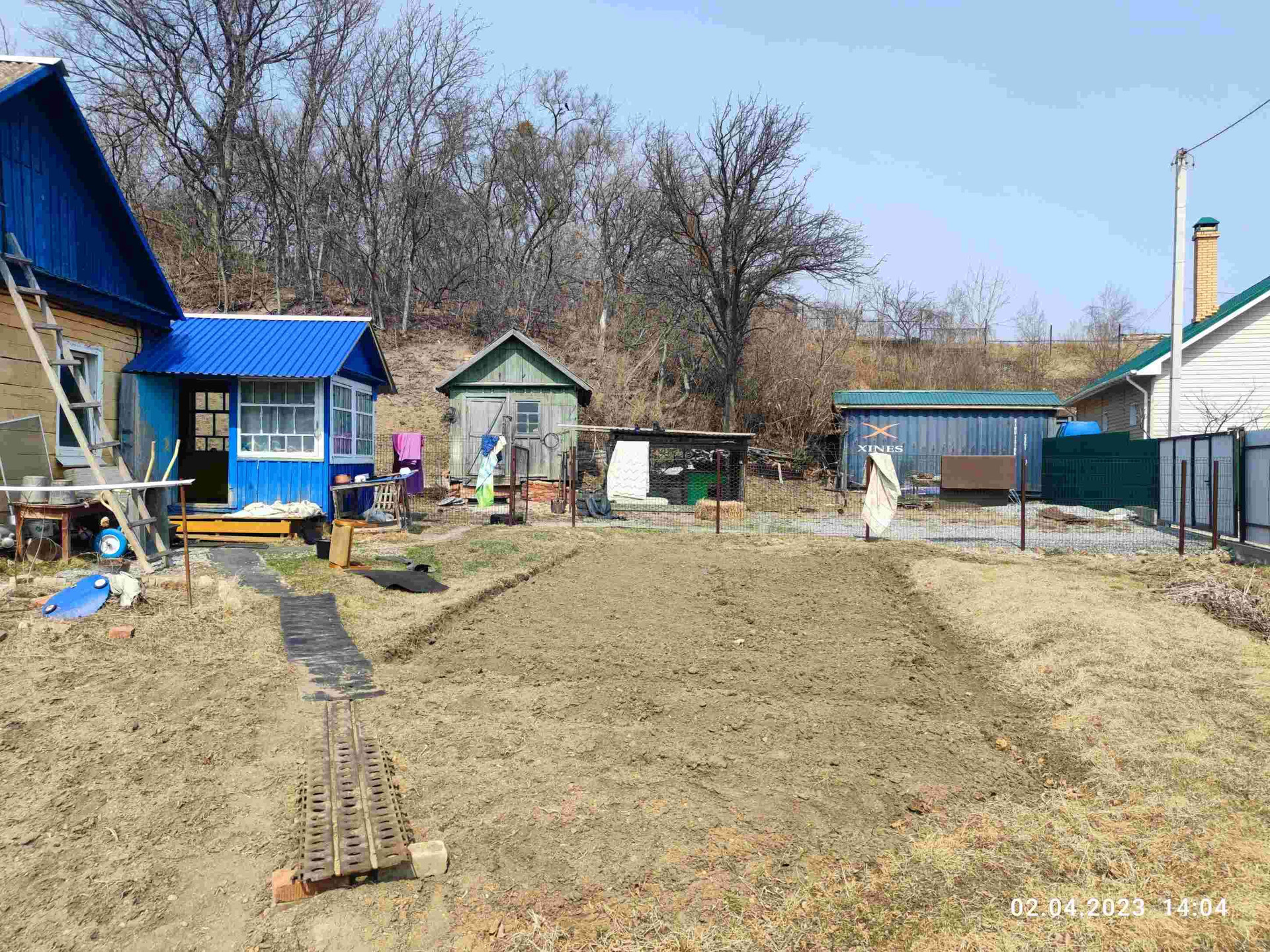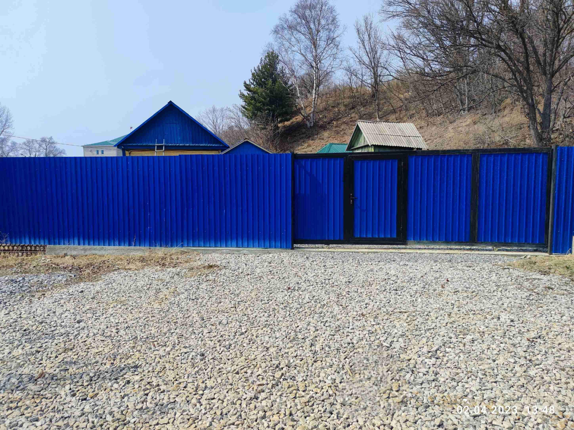 Участок огорожен забором.Ворота откатные , металлопрофиль.